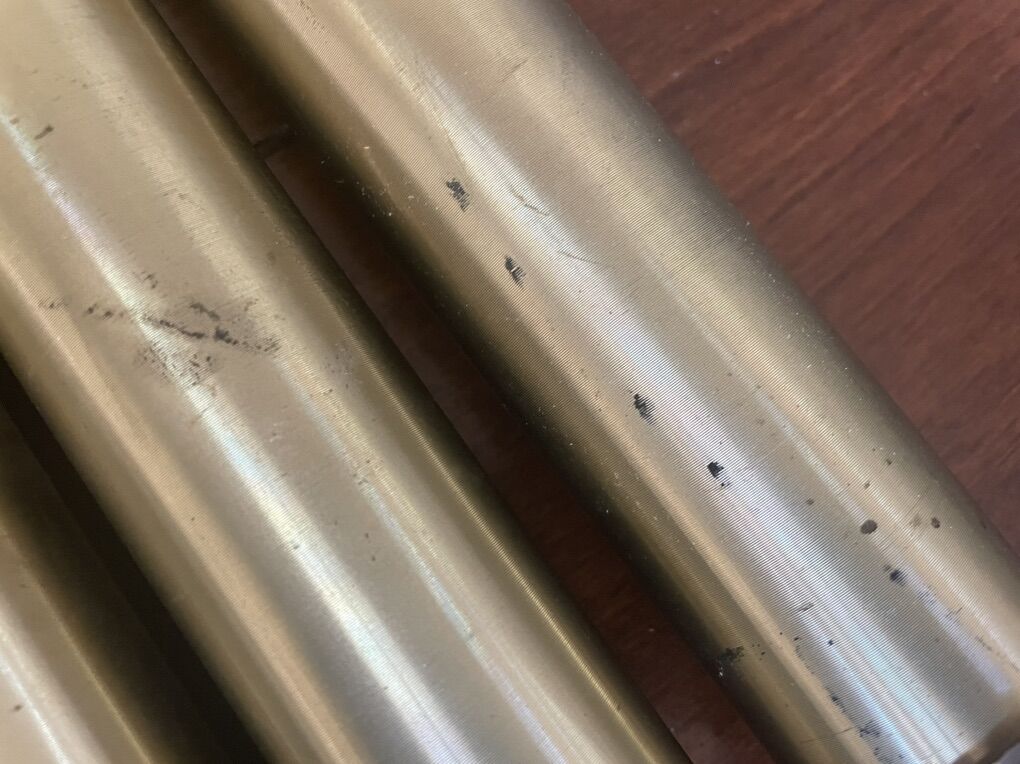 I have 3 really heavy weights that came out of an old grandfather clock. They are brass or gold colored. Each one is 10 1/2 inches long without the hook on top to hang it and the little bump on the other end. 2 of them are 5.1 lbs and 1 is 7.7 lbs. There are some scuffs and marks (see the closeup picture). The price is for all 3 together. See my other ads for jewelry, artwork, home decor and more.