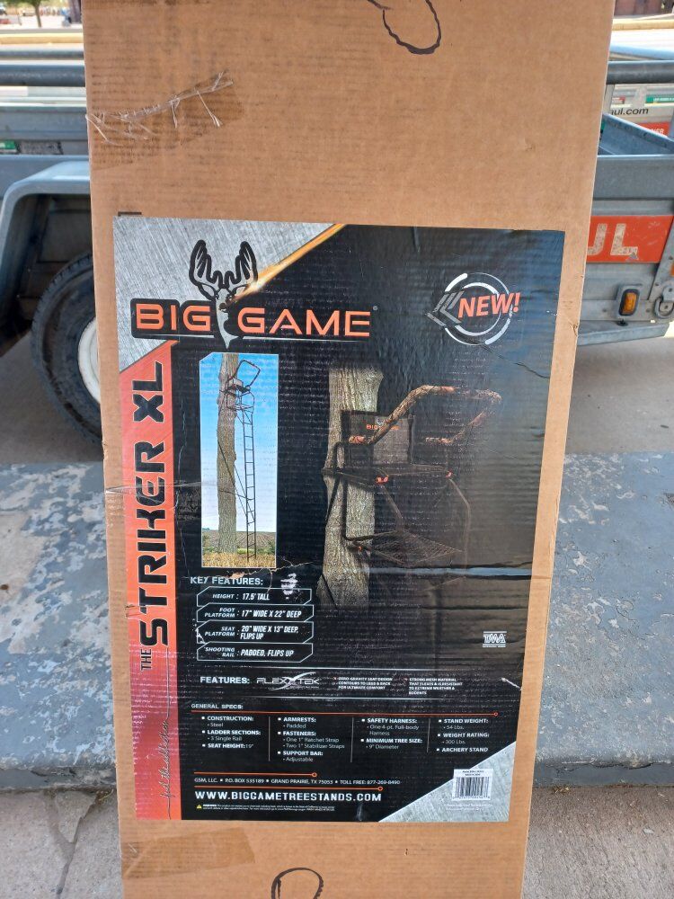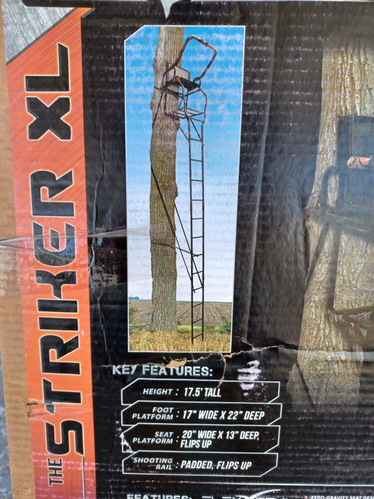 Striker XL big game tree stand 17.5 feet tall Foot platform 17 in wide 22 in deep feet platform 20 in wide 13 in deep flips up shooting rail padded and flips up brand new any questions please message me