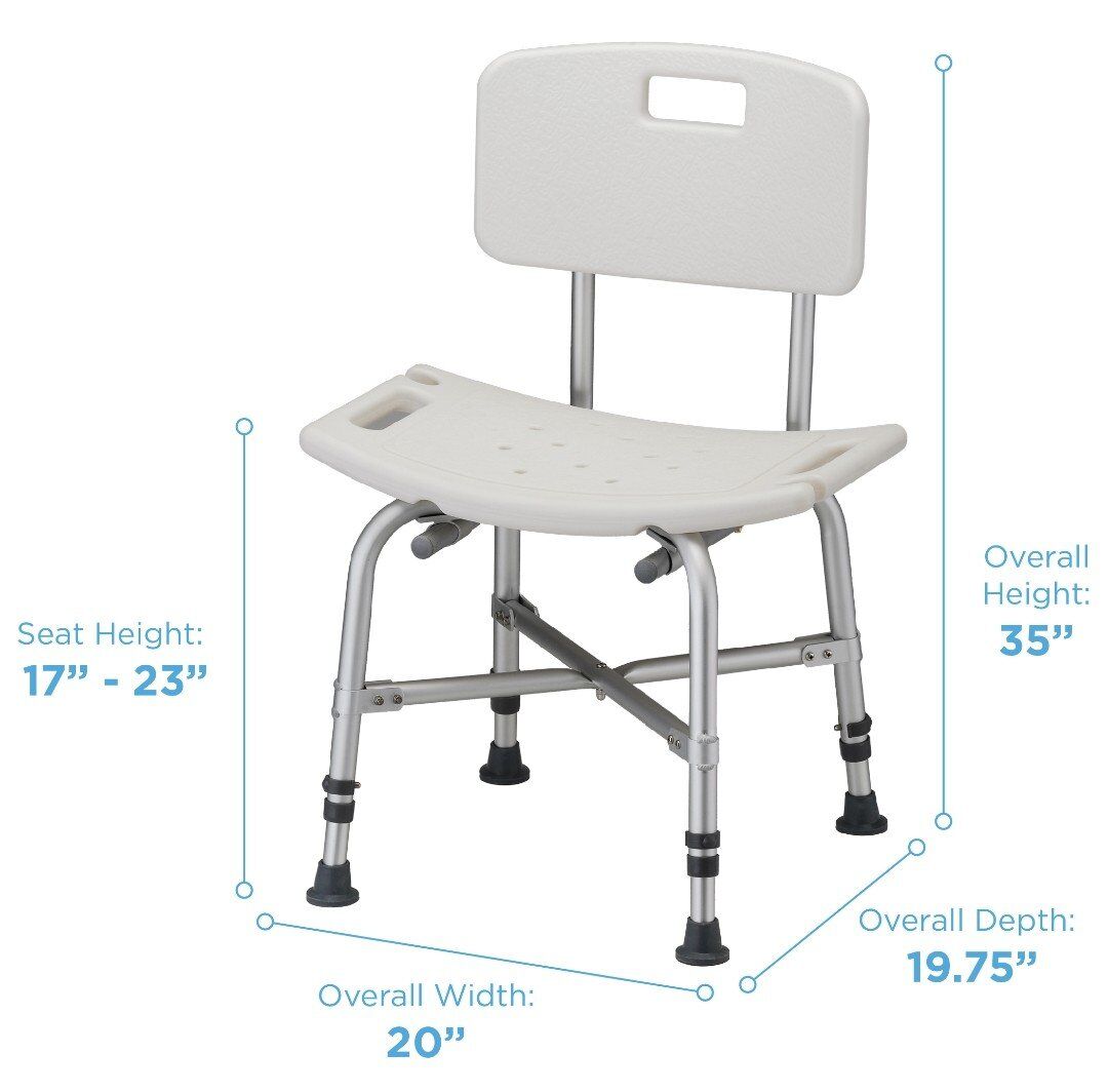 Clean Excellent Condition! The Nova Joy Heavy Duty Bath Seat with Back helps to keep you safe, comfortable and independent while bathing. It features a sturdy plastic seat and back with drainage holes, an adjustable height aluminum frame, built-in shower holder, skid-resistant rubber tips and a 500 lb weight capacity.