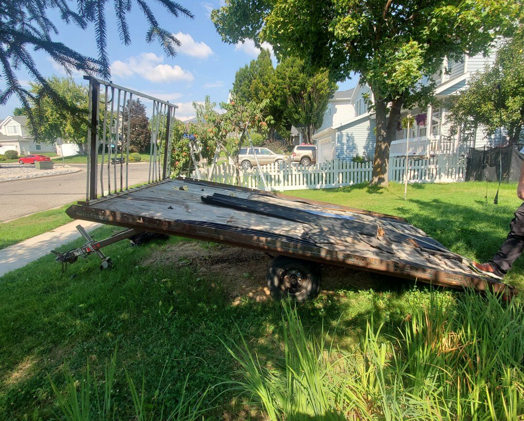VenmoTilt deck trailer. 7 ft 6 in inside the edge X 12 ft long deck. Single axle, new LED lights, 2 in ball, 6 or 7 pin connector, several spare tires 20.5x8x10 load range E. We used it to haul snowmobiles, 4 wheelers and a side by side. screw in t bars to lock down snowmobile front skis. it's been a good trailer. I just have too many. the white metal rack on the front can come off as needed.