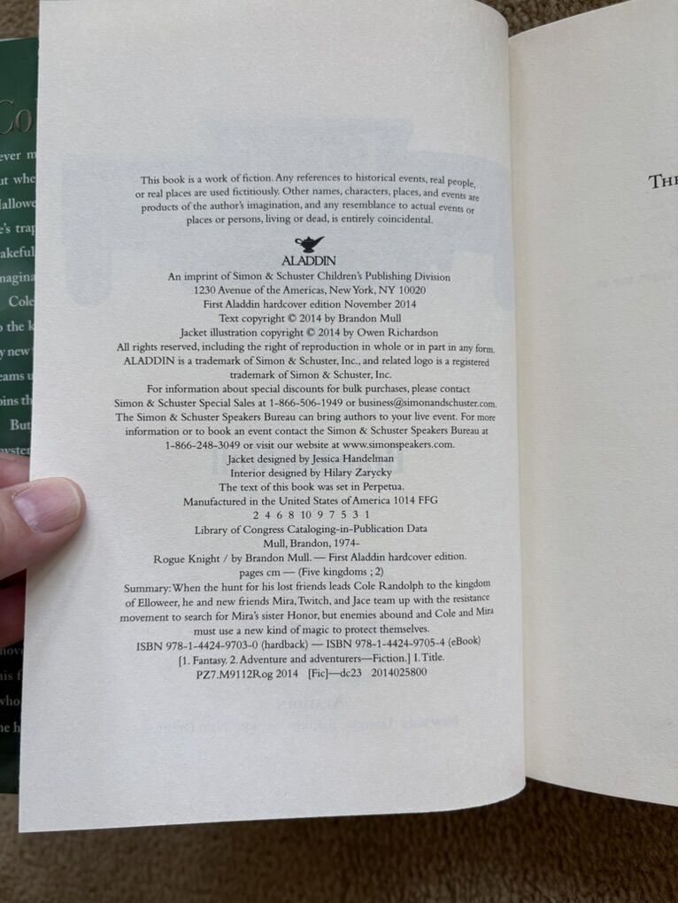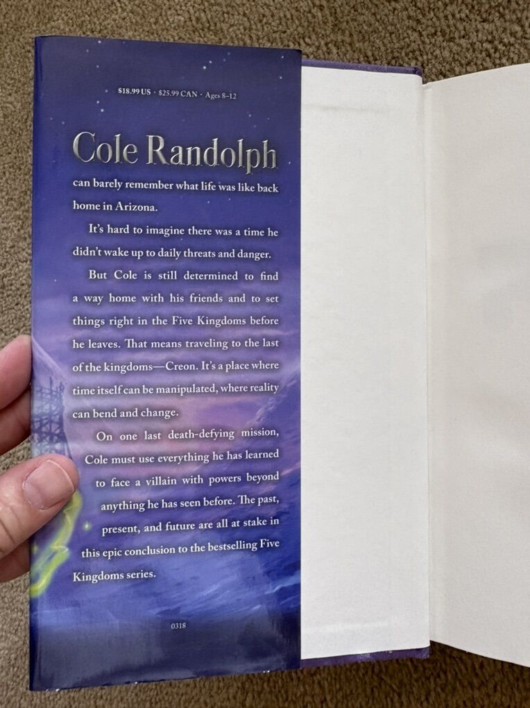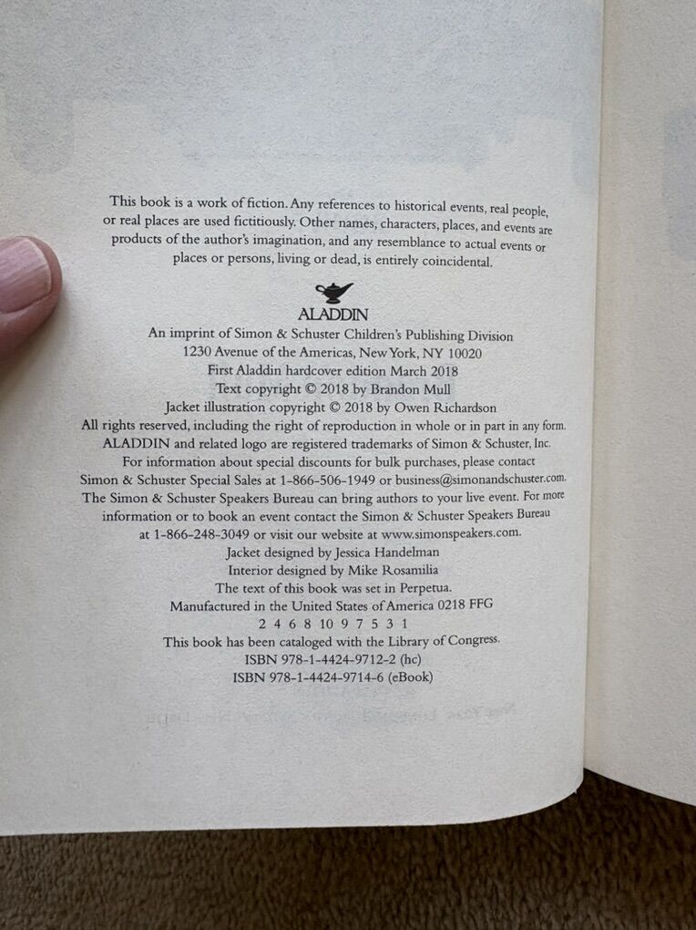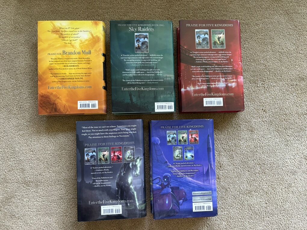 Five Kingdoms Complete Series books 1-5, by Brandon Mull: Sky Raiders (2014, 421 pages--SIGNED by the author), Rogue Knight (2014, 466 pages), Crystal Keepers (2015, 479 pages), Death Weavers (2016, 502 pages), and Time Jumpers (2018, 434 pages). Hardcovers in very good condition, including dust jackets. Text only. Cash or Venmo.