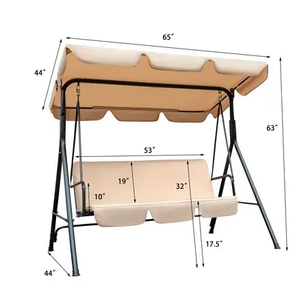 Adjustable Convertible Canopy: This Lacoo glider swing features a pivoting lock system that can be set at various angles to accommodate sunlight in different directions and provide the most suitable shade. The fabric of the canopy is made of polyester material, which has better weather resistance and has the functions of sunshade, rainproof, windproof, dustproof and UV protection, which can protect you from UV rays and drizzle. You can detach the canopy easily if you want to enjoy sunbathing. High Quality Materials: The patio swing canopy and seat covers are made of polyester fabric that is not fixed and can be easily removed for cleaning. Powder-coated topcoat and polyester fabric provide better durability to support long-term use and enjoyment. The seat cushion is filled with about 1.5" thick vertical cotton, which ensures a soft and comfortable use experience. But it is not recommended that you stay for a long time on rainy days, you will get wet. Stable & Durable Structure: Lacoo patio swing with canopy has a durable triangular frame made of a sturdy powder-coated steel frame, which ensures a strong load-bearing capacity of up to 300 pounds, has stability and safety, and enables the outdoor swing with canopy to swing smoothly. Generally it can accommodate two adults and one child. Spring & Foot Pads: The spring hook on the top of the canopy has been carefully designed to hold it in place when you swing back and forth. All four feet of the outdoor swing are equipped with plastic non-slip feet. It makes it safer when you use the swing and also prevents scratches on the floor. A comfortable outdoor swing chair can bring you the perfect outdoor leisure experience. Easy to Assemble & Clean: The necessary hardware and instructions included, assembling the patio swing is very simple. Follow the instructions and proceed step by step to assemble quickly and effortlessly. The mesh seat allows you to be cool and relaxed, but also easy to clean. Removable polyester cushions are easy to wash while powder-coated steel wipes clean with a dry cloth to prevent scale. Features: Water-resistant, fabric canopy top offers UV protection and sunshade. Durable triangular frame, which increases stability and safety. An Adjustable canopy top allows you to change its angle. 4 plastic anti-skid mats, anti-skid and anti-scratch. Up to 2 people for the comfortable lounging time. Solid powder-coated & steel frame for a long life. Easily assembled with the included instructions. Perfect for outdoor and indoor areas. Easy to clean and maintain. Specifications: Color: Black, Beige Material: Powder-Coated Steel Tube, Polyester Fabric Overall Dimensions: 65" x 44" x 63" (L x W x H) Backrest Cushion Dimensions: 53" x 19" x 1.5" (L x W x T) Canopy Dimensions: 65" x 44" (L x W) Seat Dimensions: 17" x 53" (L x W) Seat to Floor Height: 17.5" Cushion Thickness: 1.5" Weight Capacity: 300 lbs Package includes: 1 x Canopy Swing 1 x Instruction 1 x Installation Tools Note: Please put the rotating frame on a hard floor to prevent it from tipping over. Please pay attention to the recommended load limit. Please ensure safety when children or baby sit on the swing in the garden.