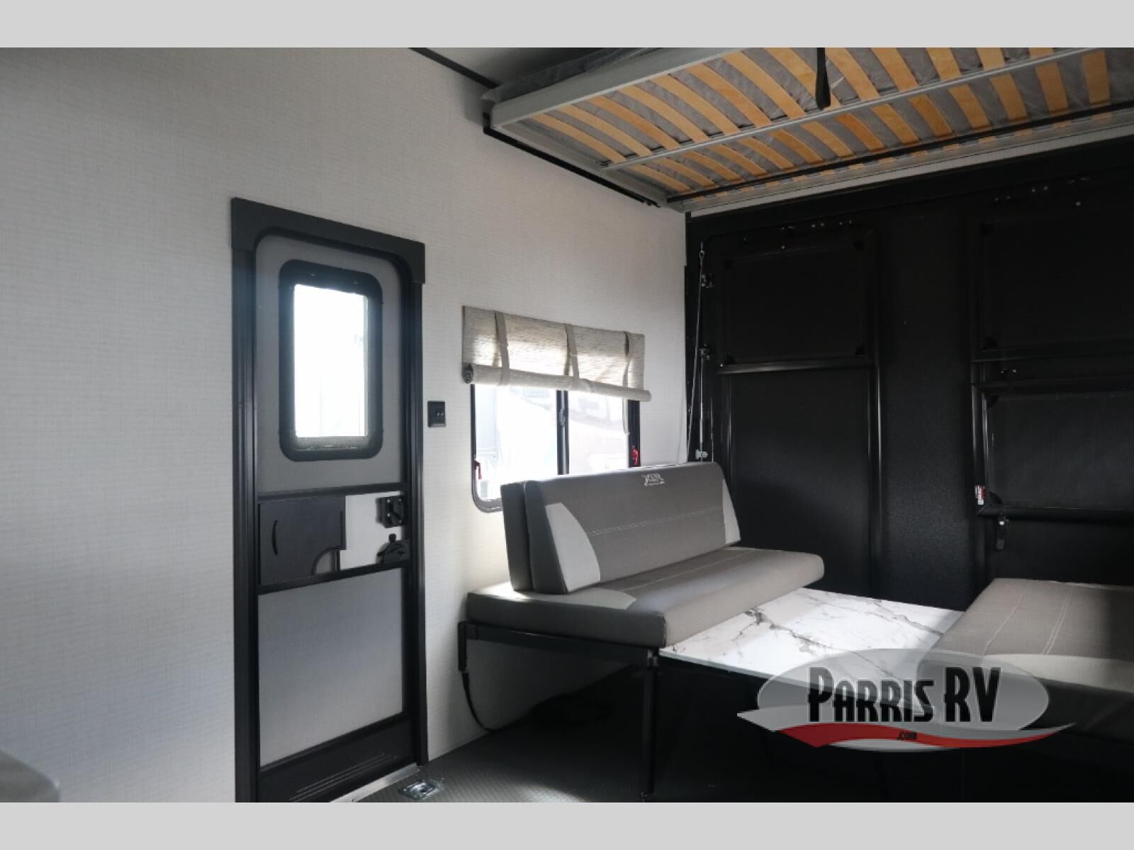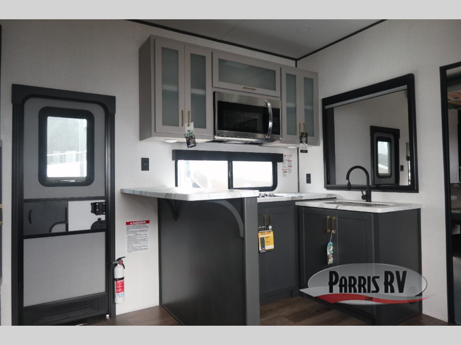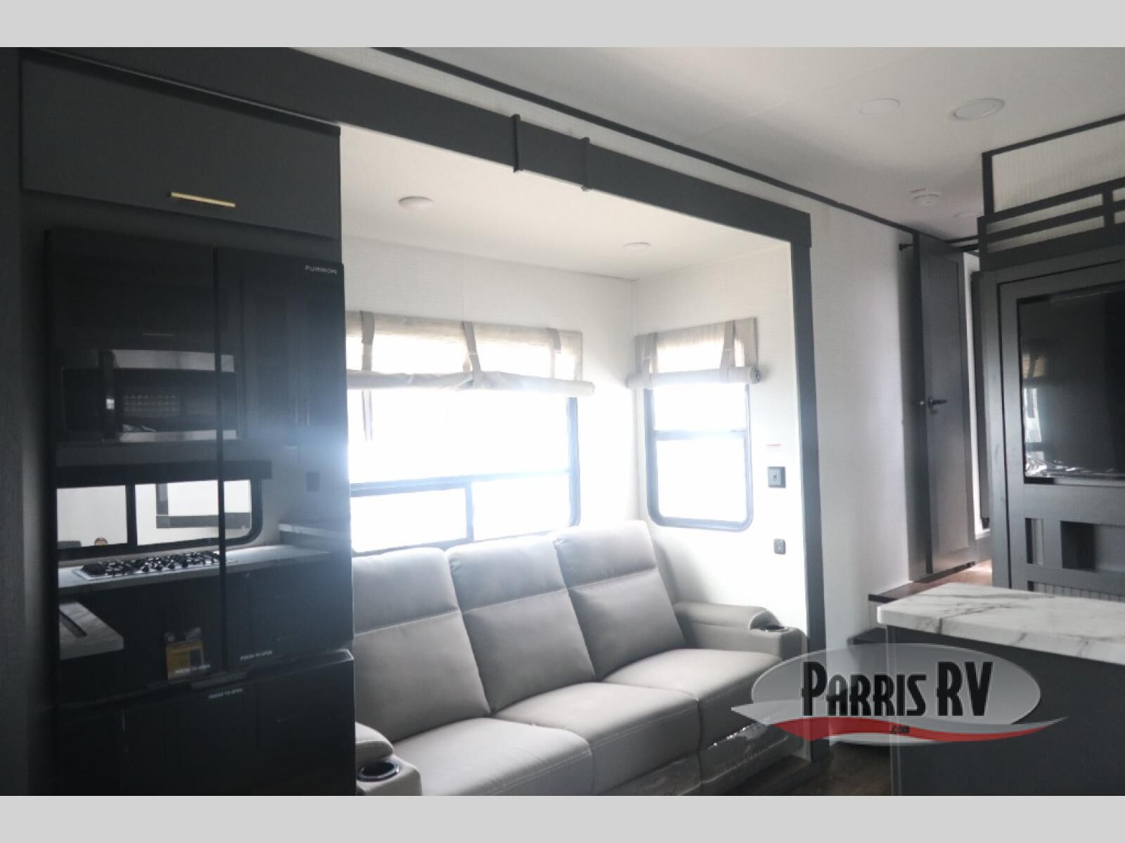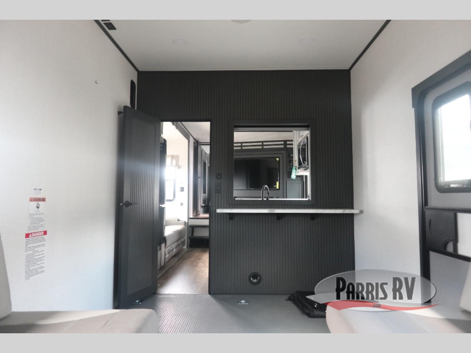 You'll love every minute spent in this double slide out, double entry fifth wheel! Your guests will have the 13' 6" separate garage all to themselves once the toys are unloaded, and here you'll find dual sofa sleepers with a Euro queen bed above. There is also a removable dinette table where you can enjoy a cold drink at when you have the 1,500 lb. capacity patio deck set up! Head to the combined kitchen and living area to relax on the sofa slide out while the cook prepares dinner. There is also a hidden pantry here you are sure to appreciate! The dual entry bath will create a front master bedroom, complete with a queen bed, dual nightstands and wardrobes, plus a wardrobe slide out for added storage and space!
