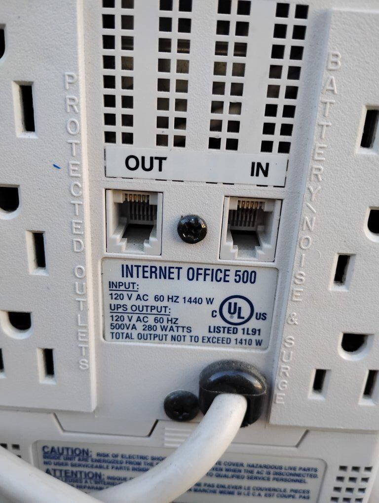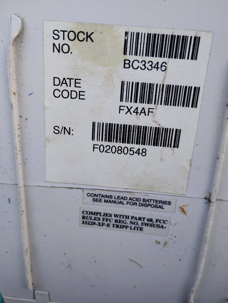 Venmo(Price reduced on 12/9) Up for sale an Internet Office UPS 500 Tripp Lite 6 outlets and Ethernet cable line. 120 V AC, 60 HZ, 1,440W, 500 VA, 280 Watts, Stock No BC3346, date code FX4AF, S/N:F02080548 measuring 6.25" x 4.25" and 8" tall