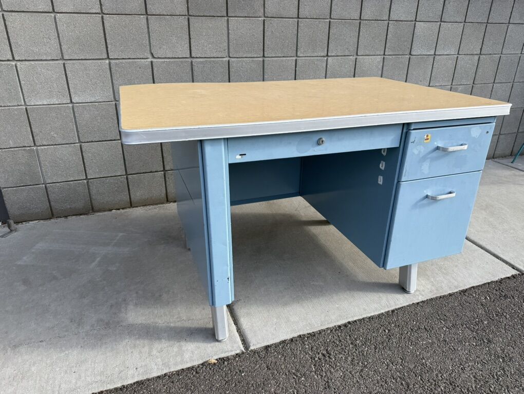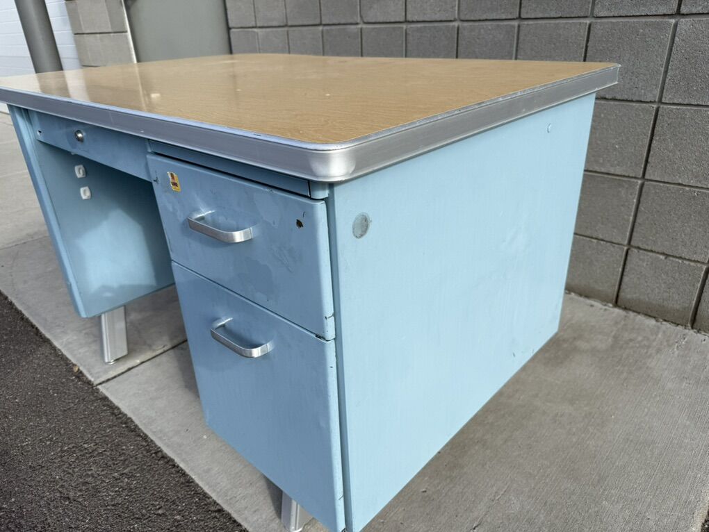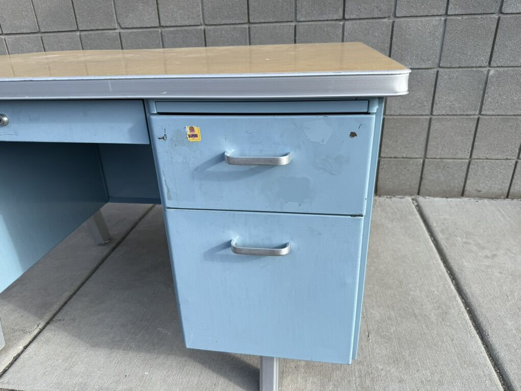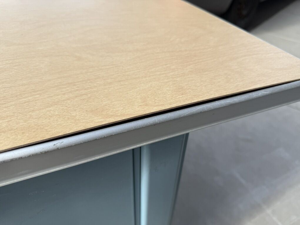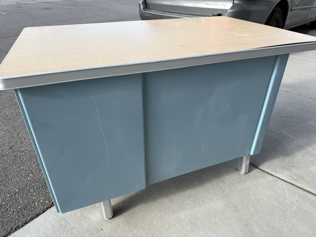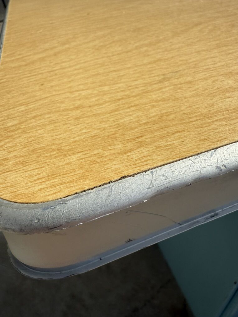 Mostly metal, with a laminate top. Part of the top has popped up, so the edge band will need to be removed in order to push it back down.