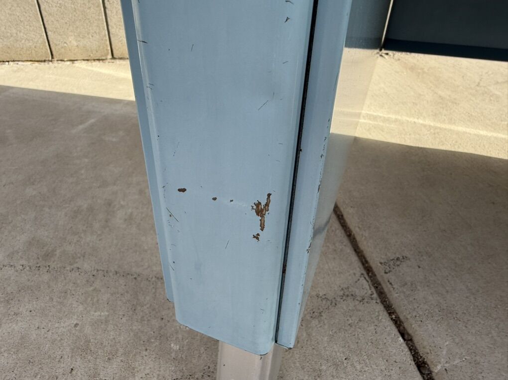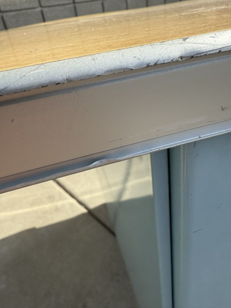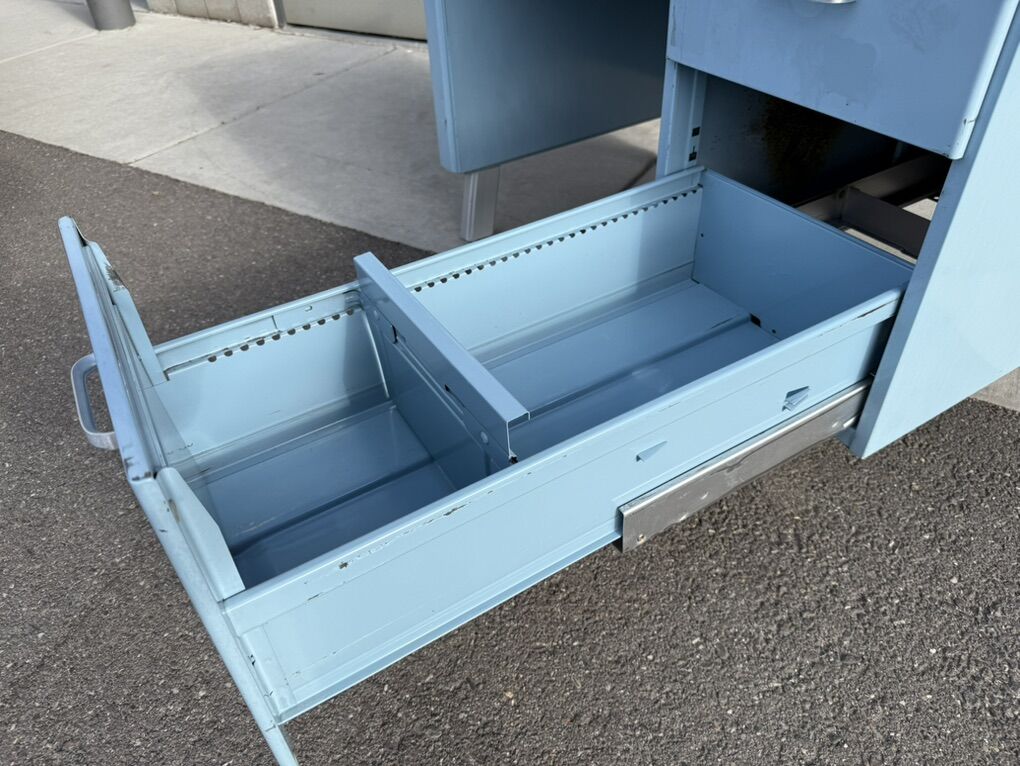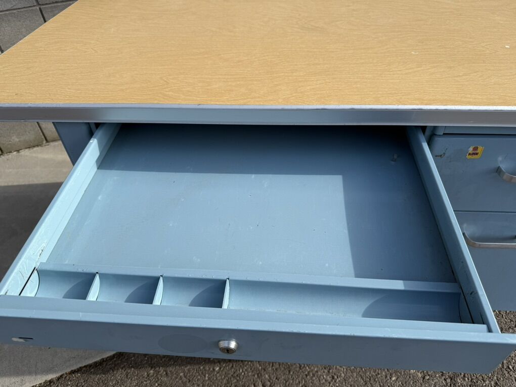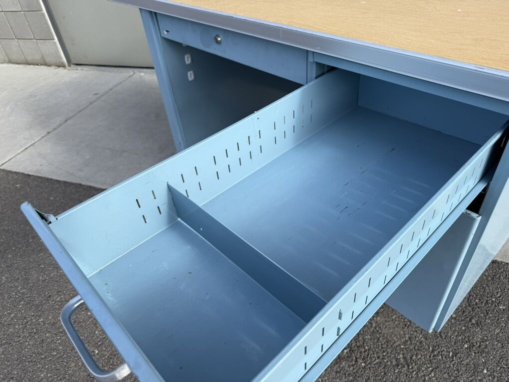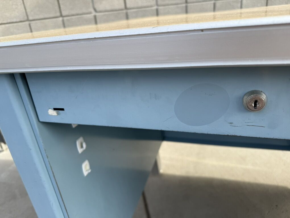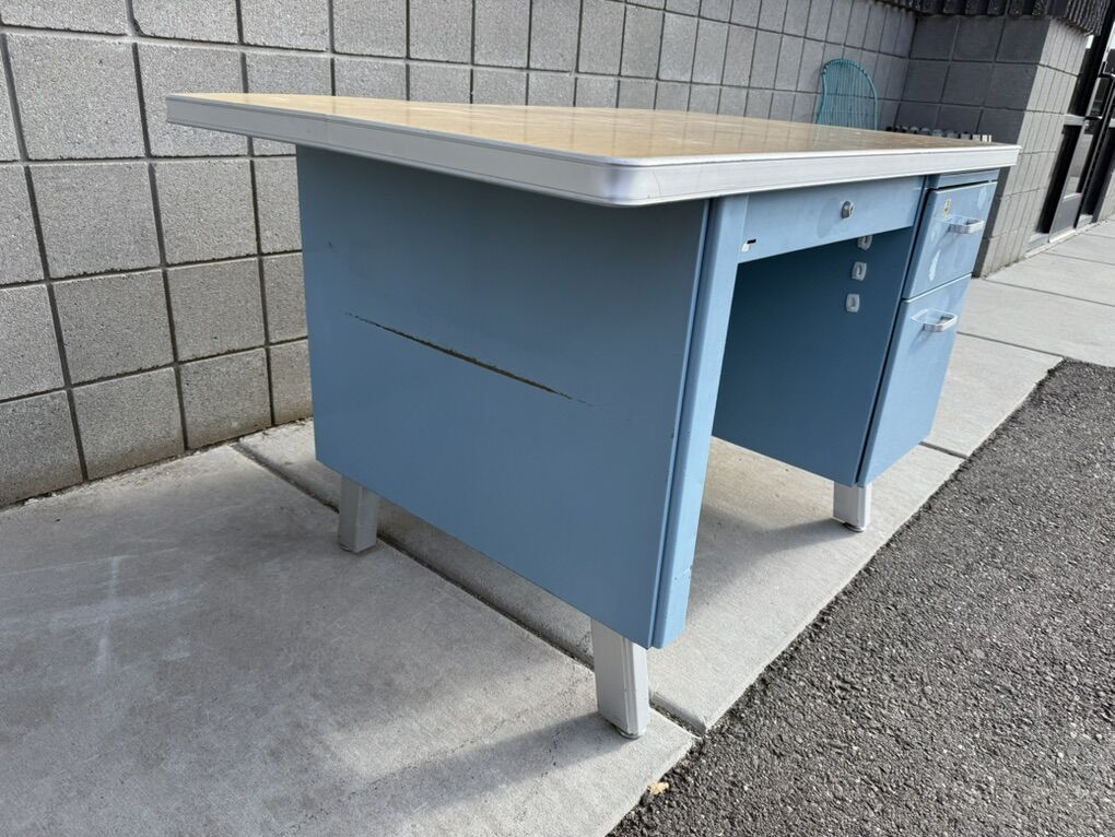 Mostly metal, with a laminate top. Part of the top has popped up, so the edge band will need to be removed in order to push it back down.