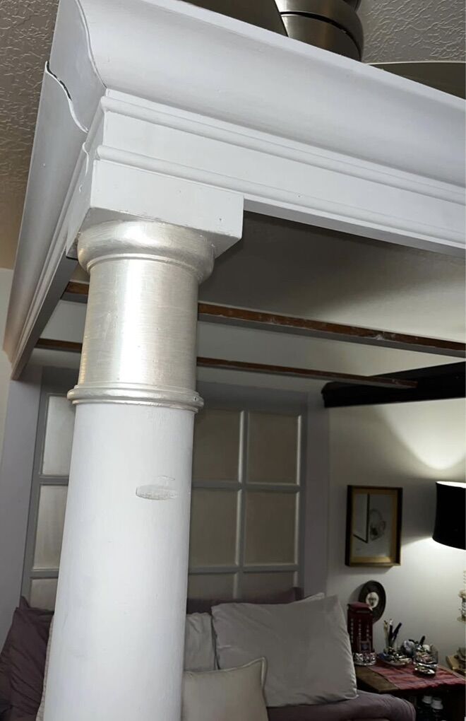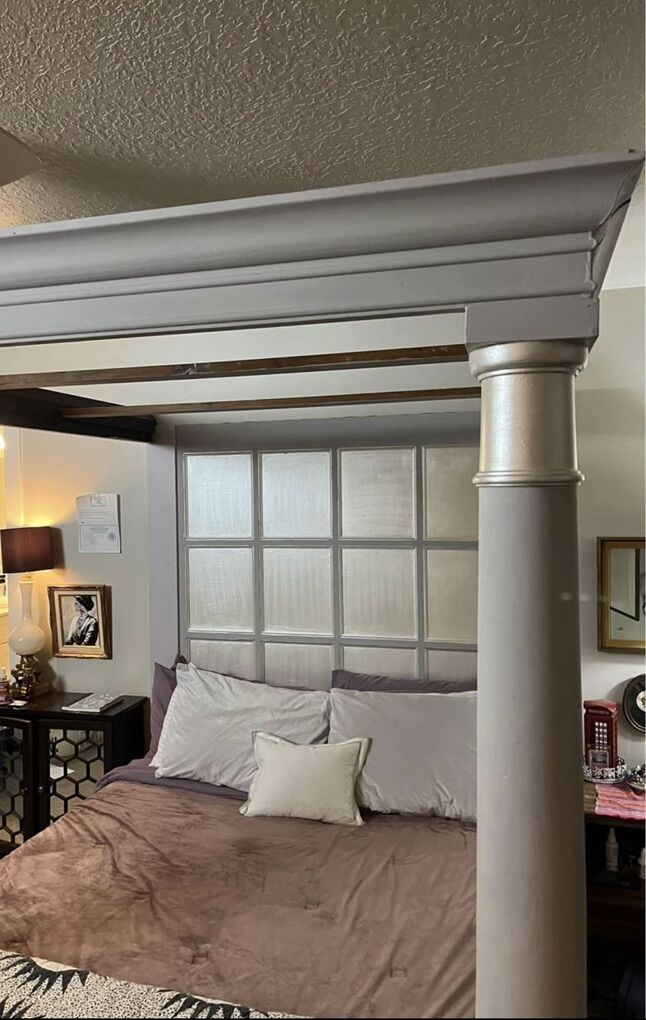 ZelleFour Poster Solid Wood Canopy Bed Assembled All With Bracket Latch & Tension. So Screws or nails required for assembling. Painted with two different greyr tones and metallic iredescen “pearl color” detailing. Very well made I chose not to install interior curtain roses and top fabric so that the buyer could choice a color or patteren to match their own, bedding and style. But that’s the final step and the easiest. The crown molding is strong enough to bare the weight of thick velvet drapes if you want. This a very grand piece that is both classic and modern. Put so many hours into sanding and painting. Love this beautiful work of art! Sleeping like kings and queens. Willing to negotiate. Price just lowered.