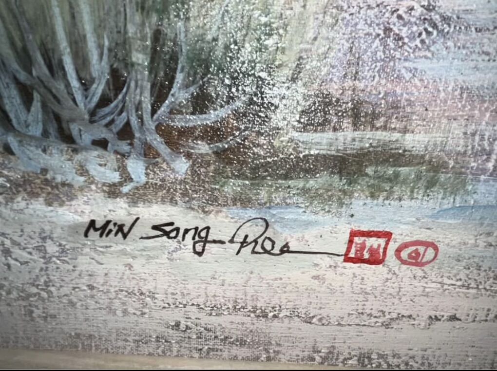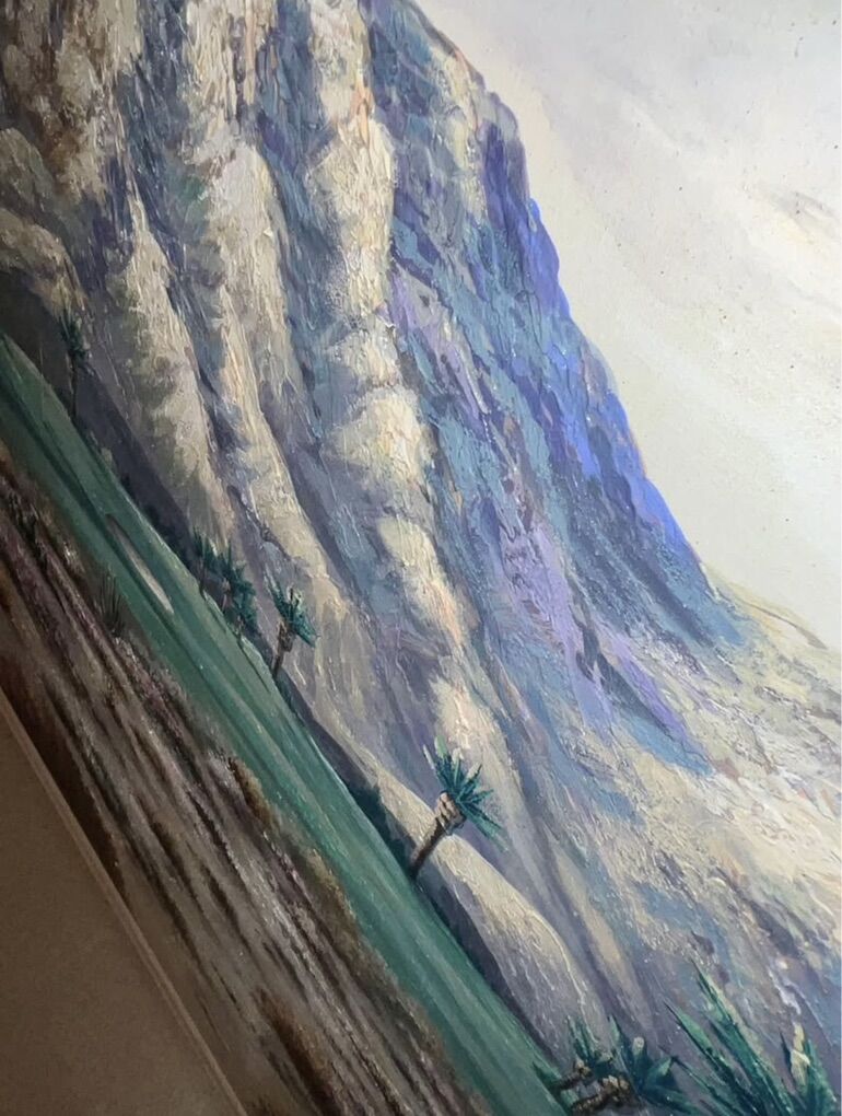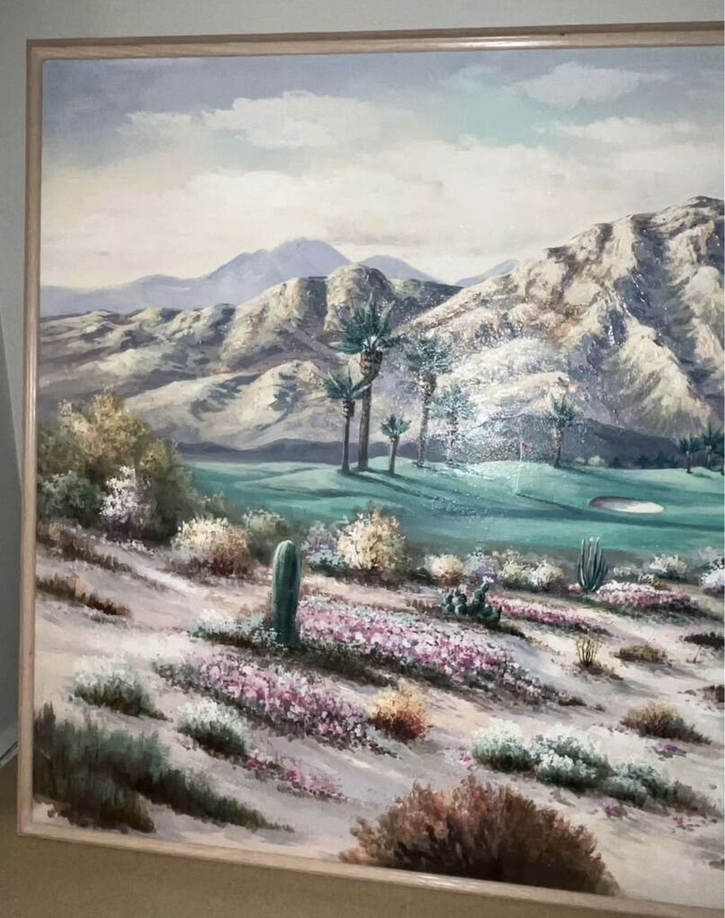 CashAppOriginal Oil Painting By Min Song Ree. This beautiful original oil painting was inspired by a golf course in Palm Springs California. Like so many other paintings by Min Song the landscapes seems to push you back and lure you forward. Min Song painting many landscapes and many were deserts. Many of Min Songs original paintings sell for between $1,200.00 & $4,500.00 and I’ve never seen one this large before. This painting was purchased from Min Song. My parents while on vacation went into a local gallery in Palm Springs, and left with the masterpiece. The painting is gargantuan measuring 6 meet long and 46 inches tall. Still in its original frame this painting is MCM art at its finest and captures the true beauty of one of our american regions.