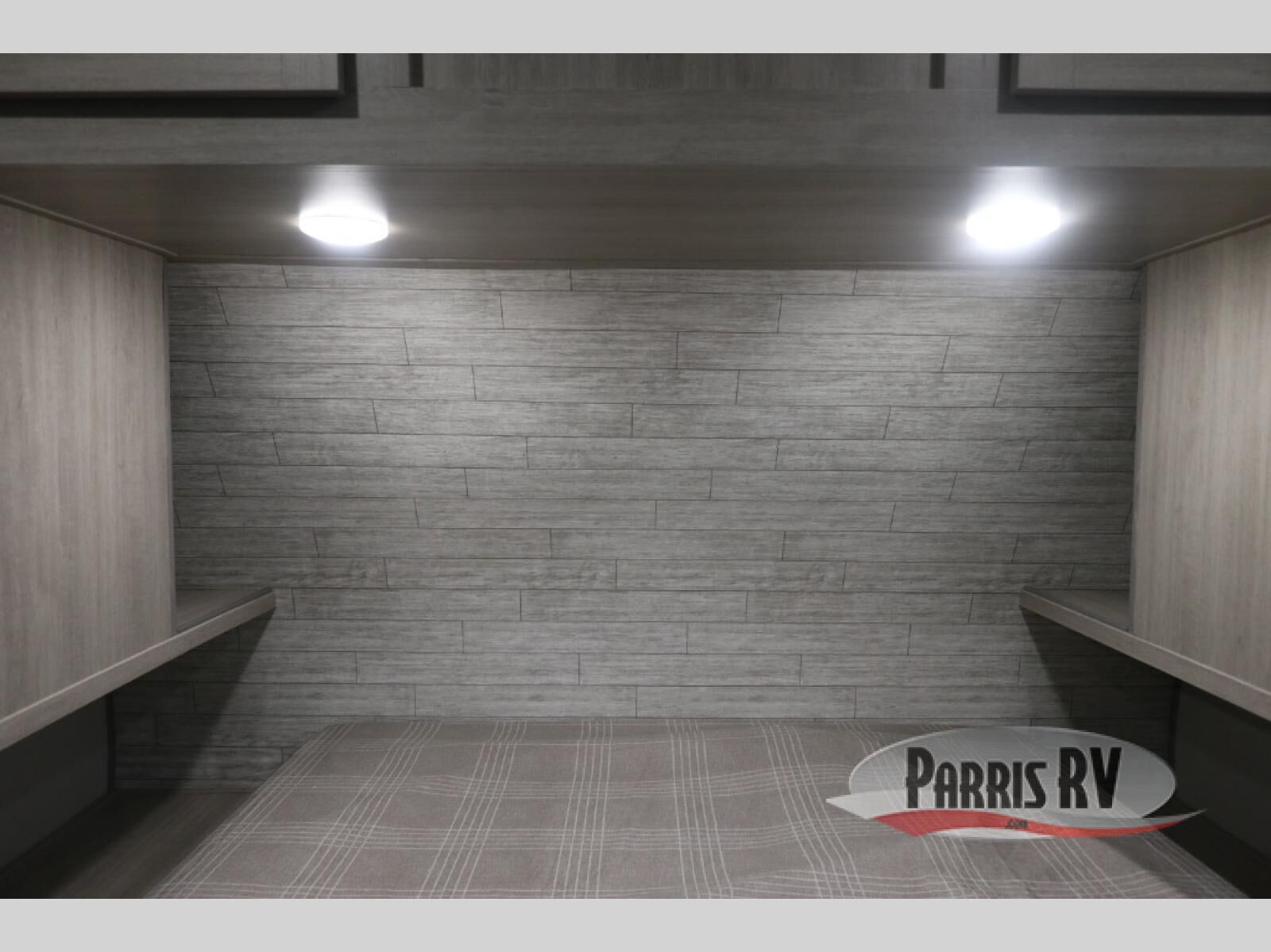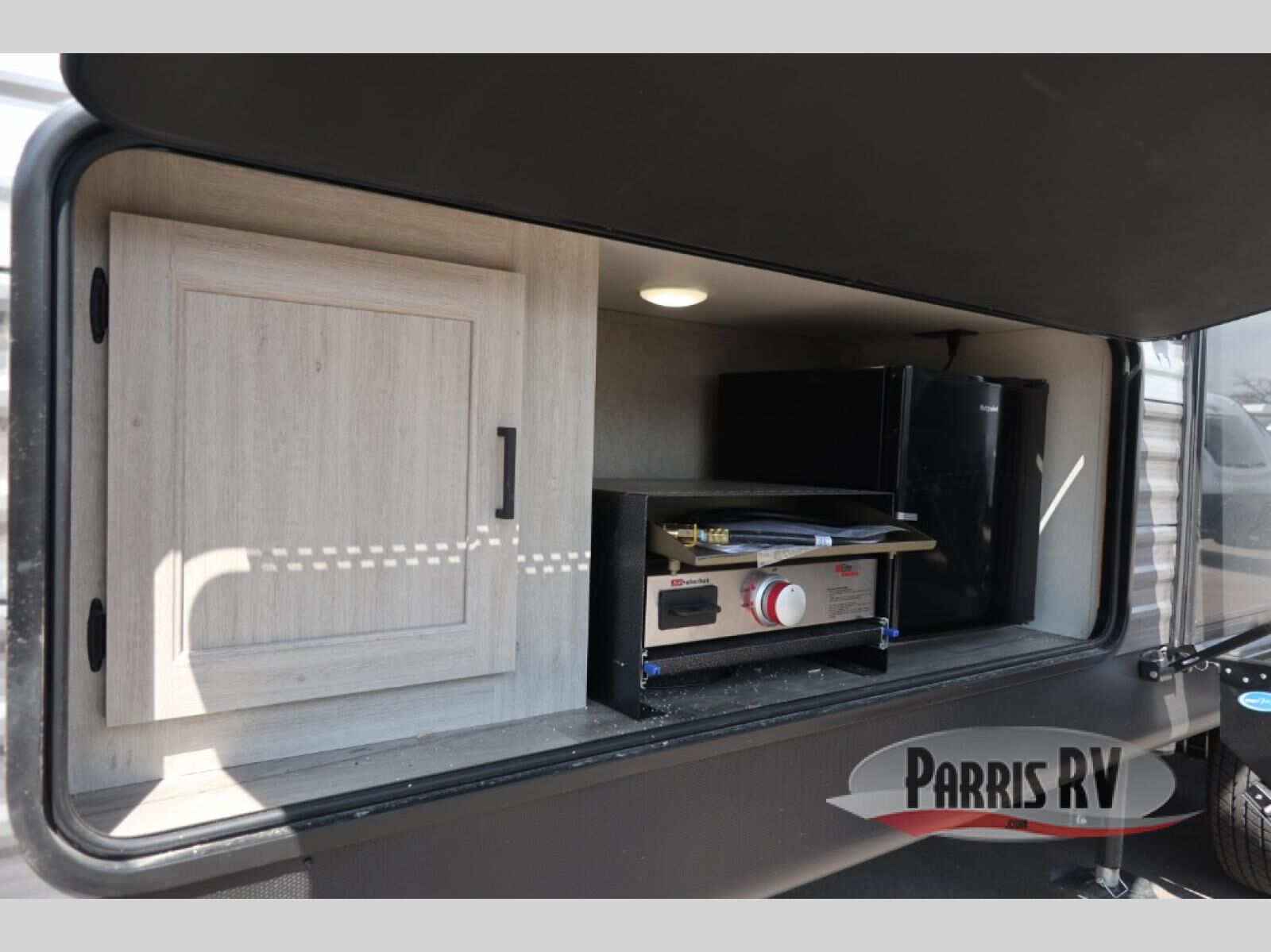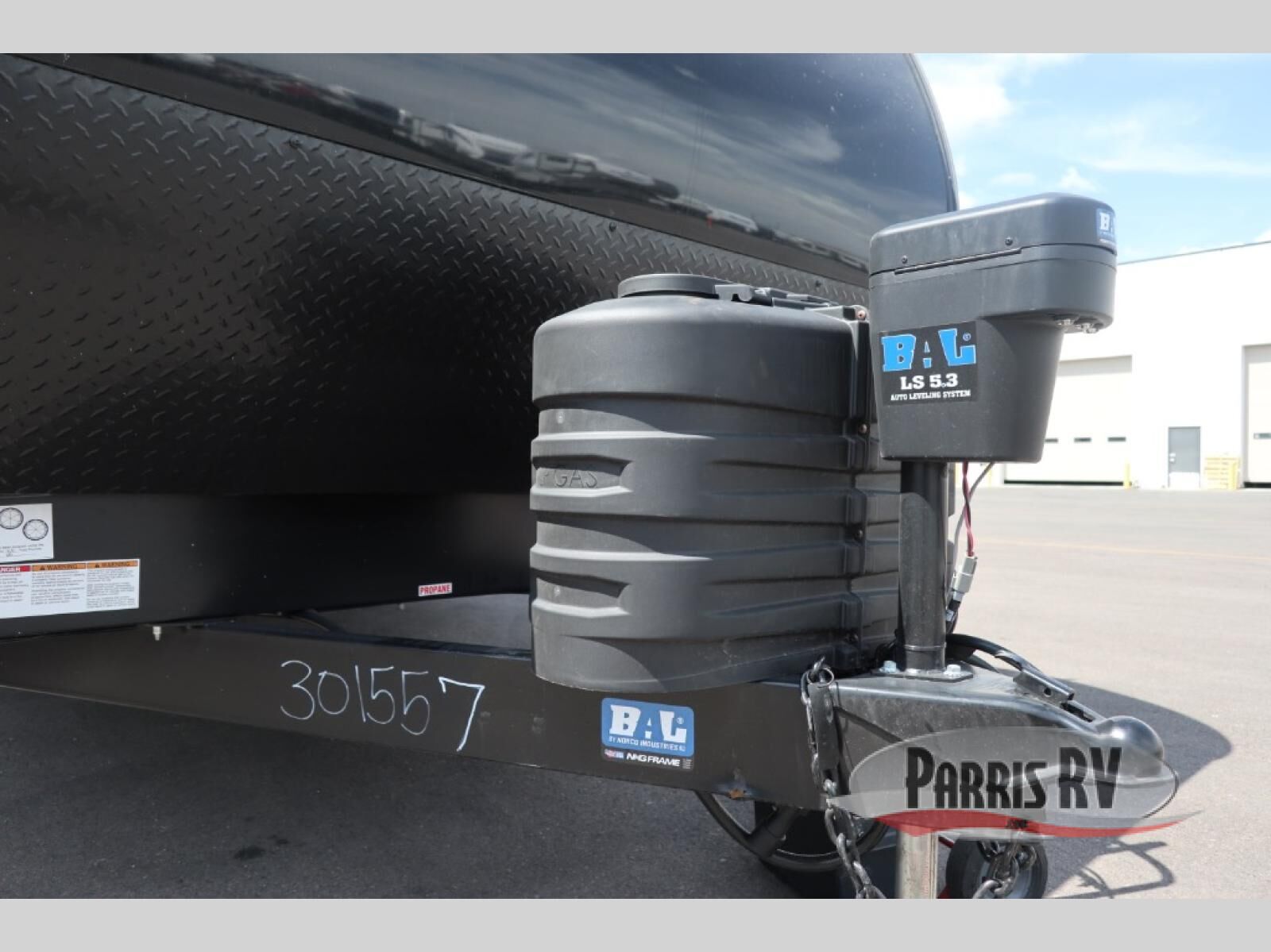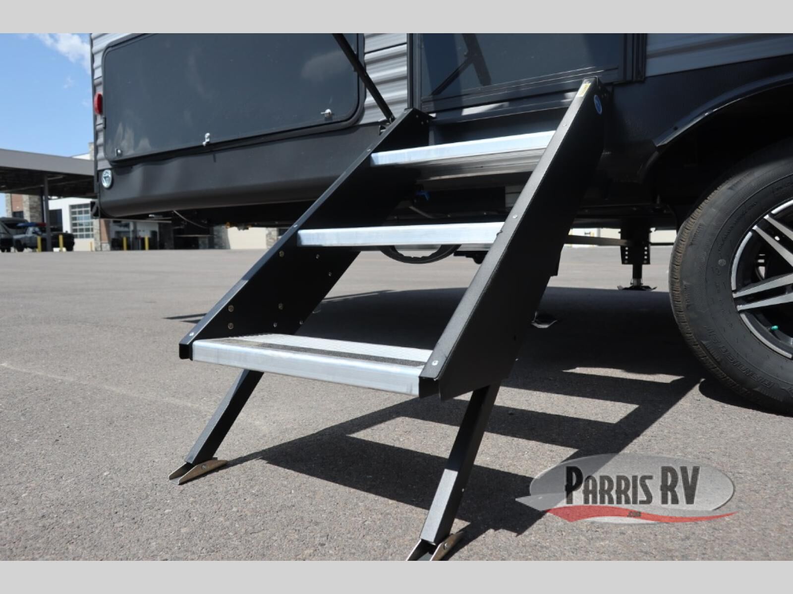 When you enjoy camping with your own accommodations and space for the whole crew, hitch this trailer up and head to the campgrounds! After loading everything easily thanks to the dual entry doors and all the interior and exterior storage, you will have no worries that you left anything behind. The electric awning is easy to set up, like the large slide out, and the awning offers multicolor LED lights to choose from by using the remote. When you are outside the cook might like to make a meal using the outside camper kitchen. The interior kitchen offers full amenities including a pantry, and everyone can enjoy the angled entertainment center. There are double-size bunks with a ladder for the kids and a walk-around queen bed for the owner to sleep on, plus furniture in the living area that doubles as additional sleeping space!