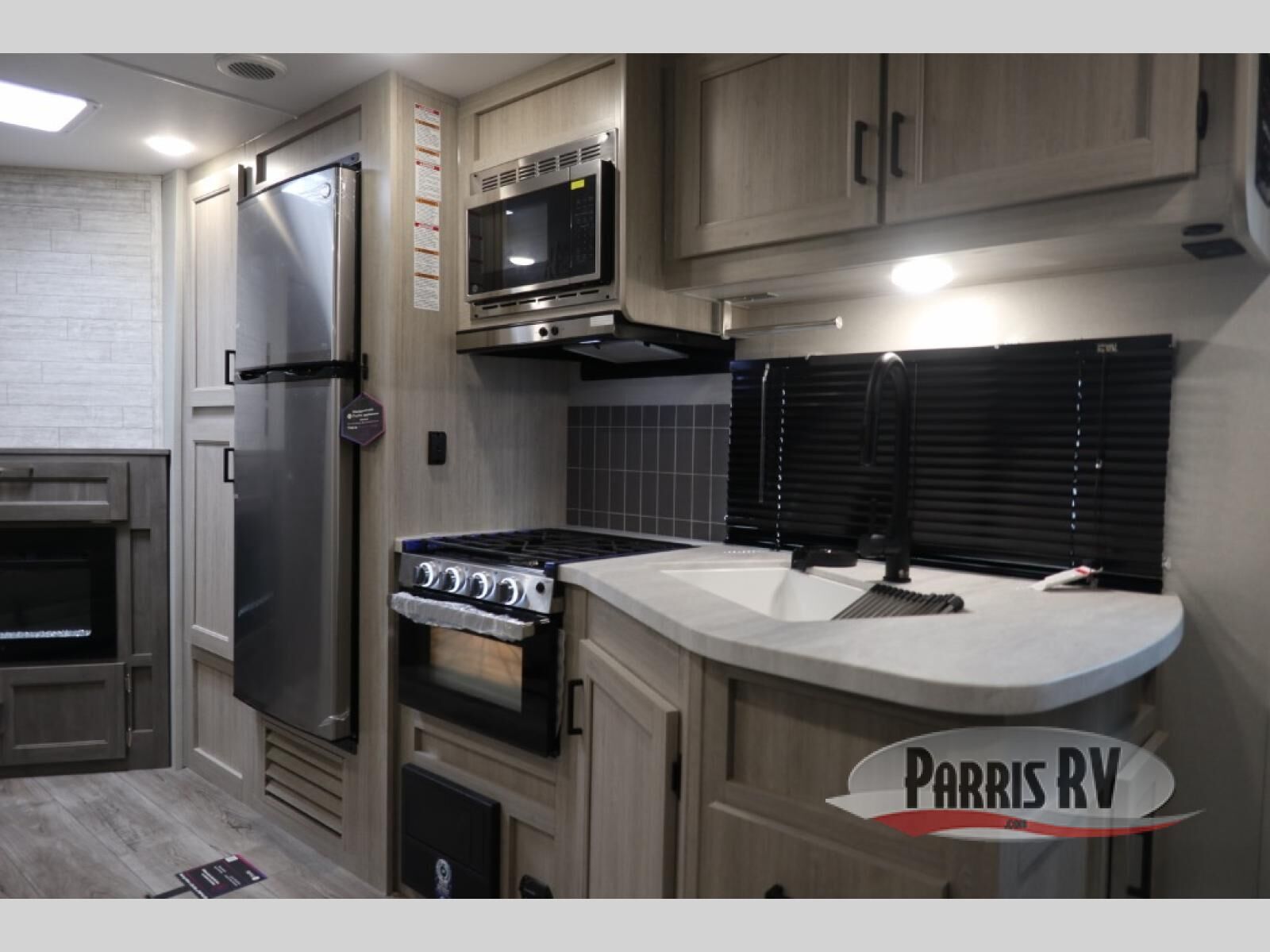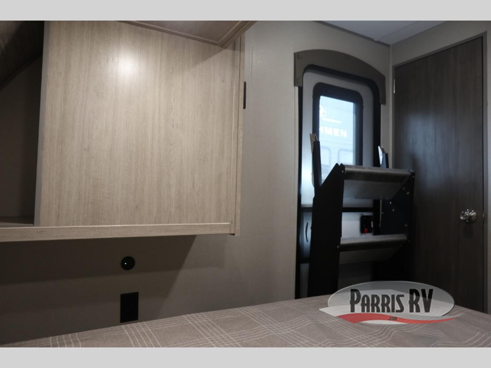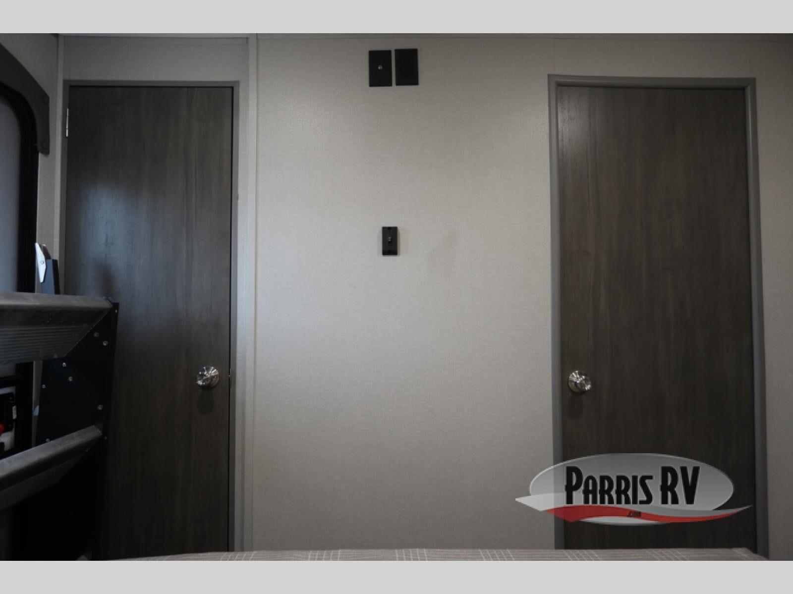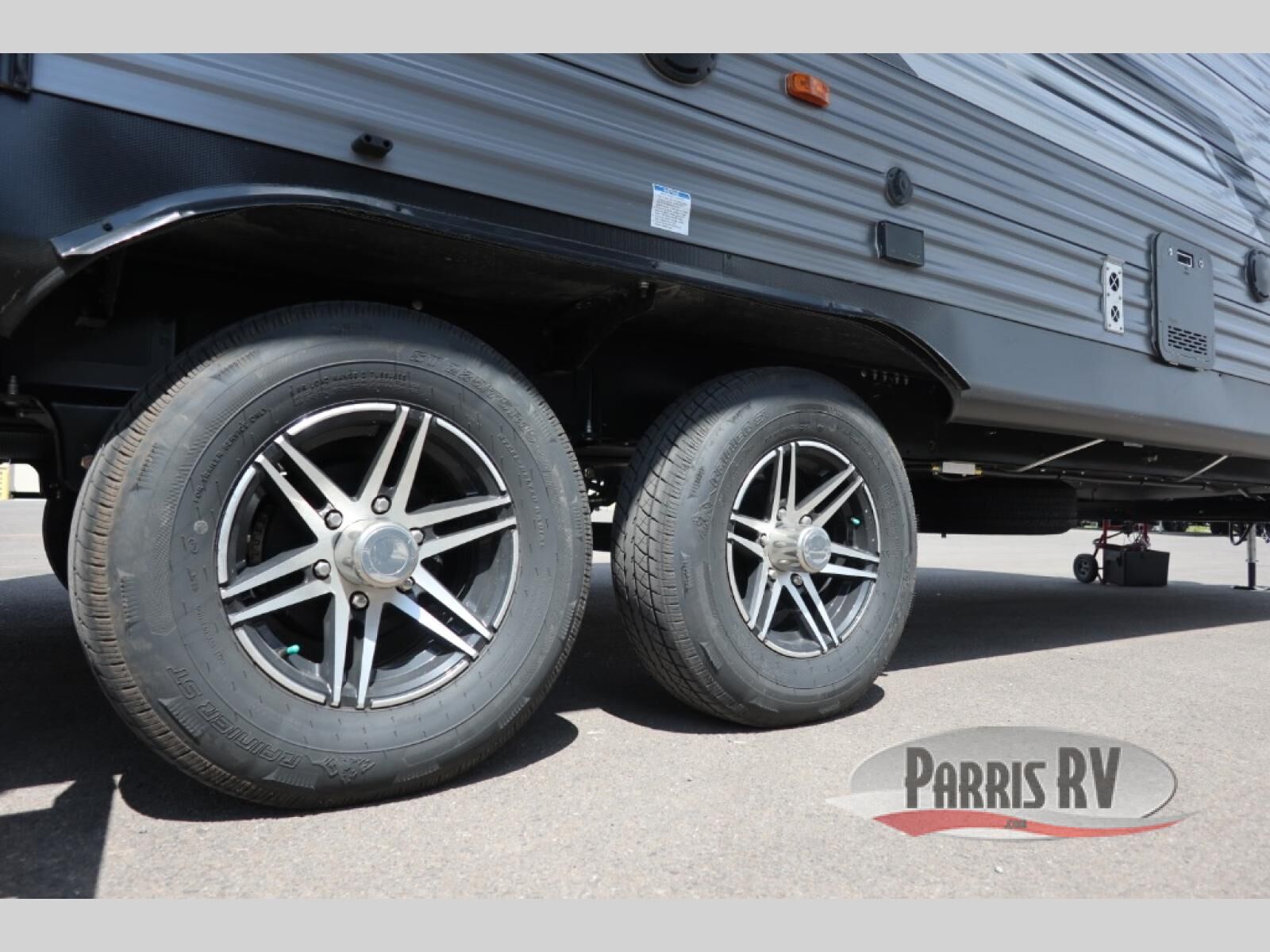 When you enjoy camping with your own accommodations and space for the whole crew, hitch this trailer up and head to the campgrounds! After loading everything easily thanks to the dual entry doors and all the interior and exterior storage, you will have no worries that you left anything behind. The electric awning is easy to set up, like the large slide out, and the awning offers multicolor LED lights to choose from by using the remote. When you are outside the cook might like to make a meal using the outside camper kitchen. The interior kitchen offers full amenities including a pantry, and everyone can enjoy the angled entertainment center. There are double-size bunks with a ladder for the kids and a walk-around queen bed for the owner to sleep on, plus furniture in the living area that doubles as additional sleeping space!
