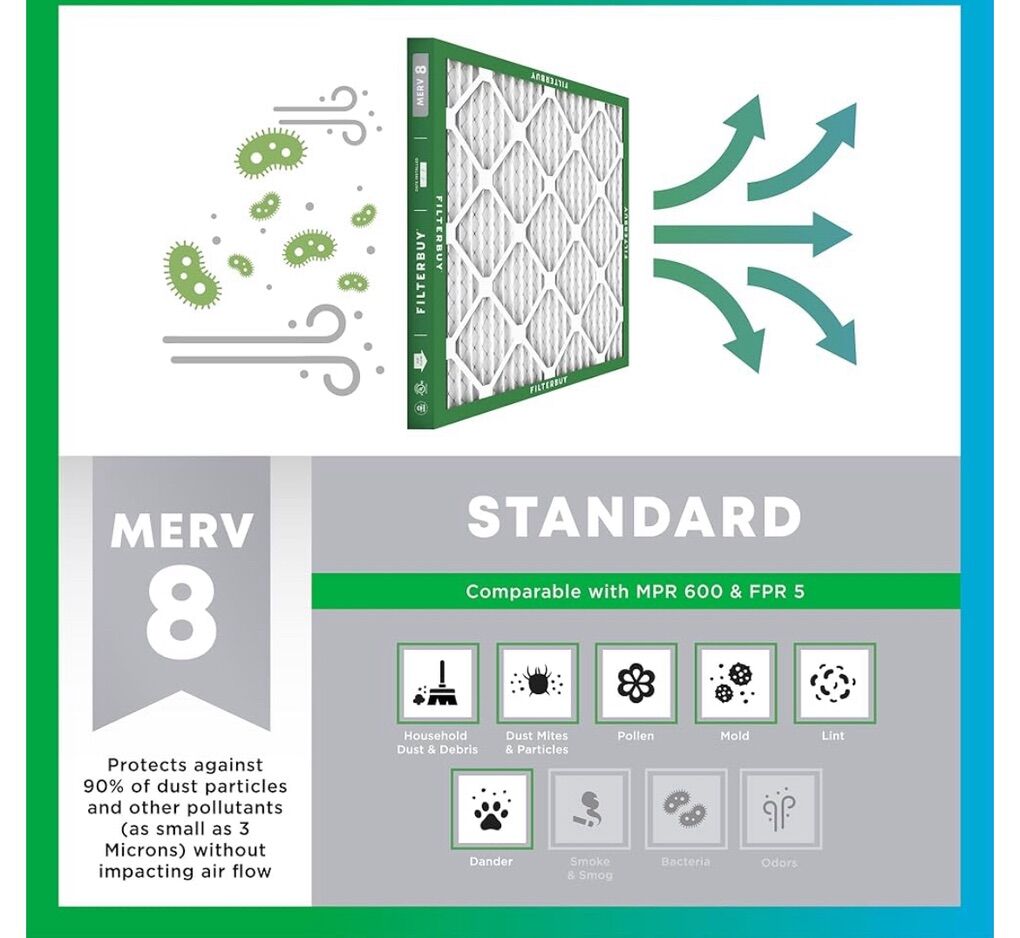 Keep your air clean and your HVAC system running efficiently with this high-quality MERV 8 pleated filter. Designed to capture up to 90% of airborne particles — including dust, pollen, pet dander, mold spores, and lint — while maintaining strong airflow.