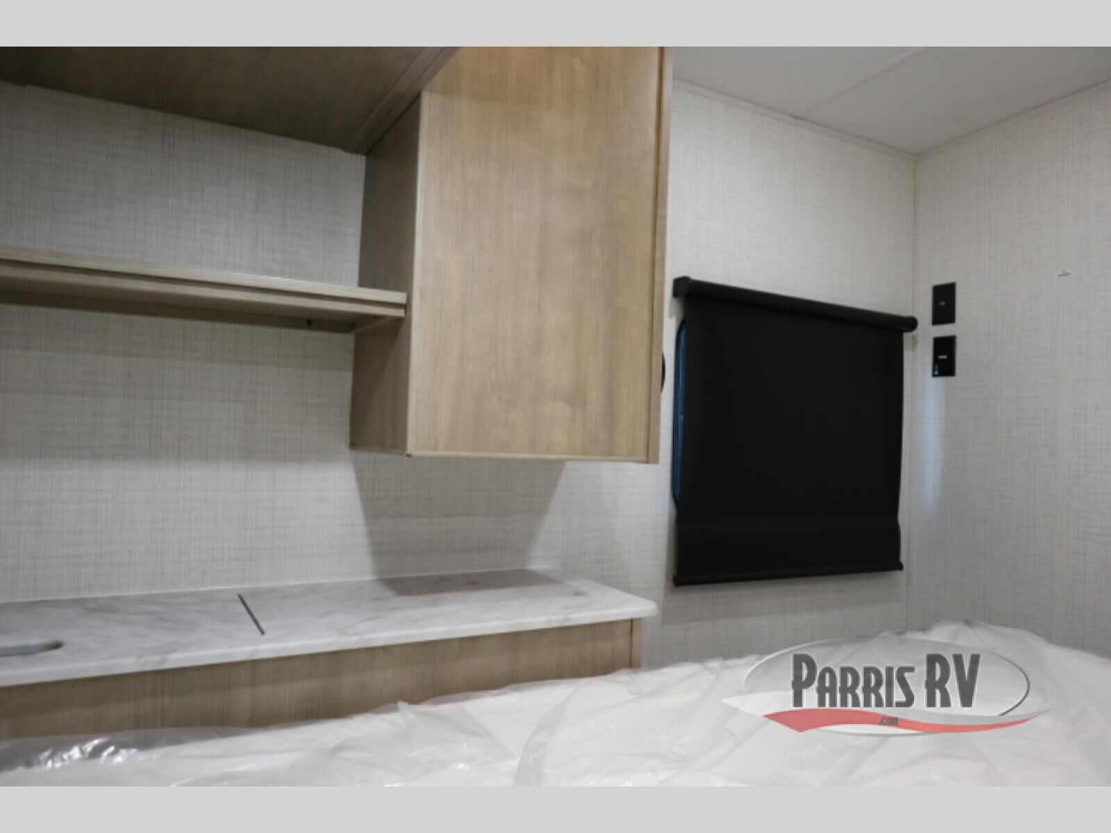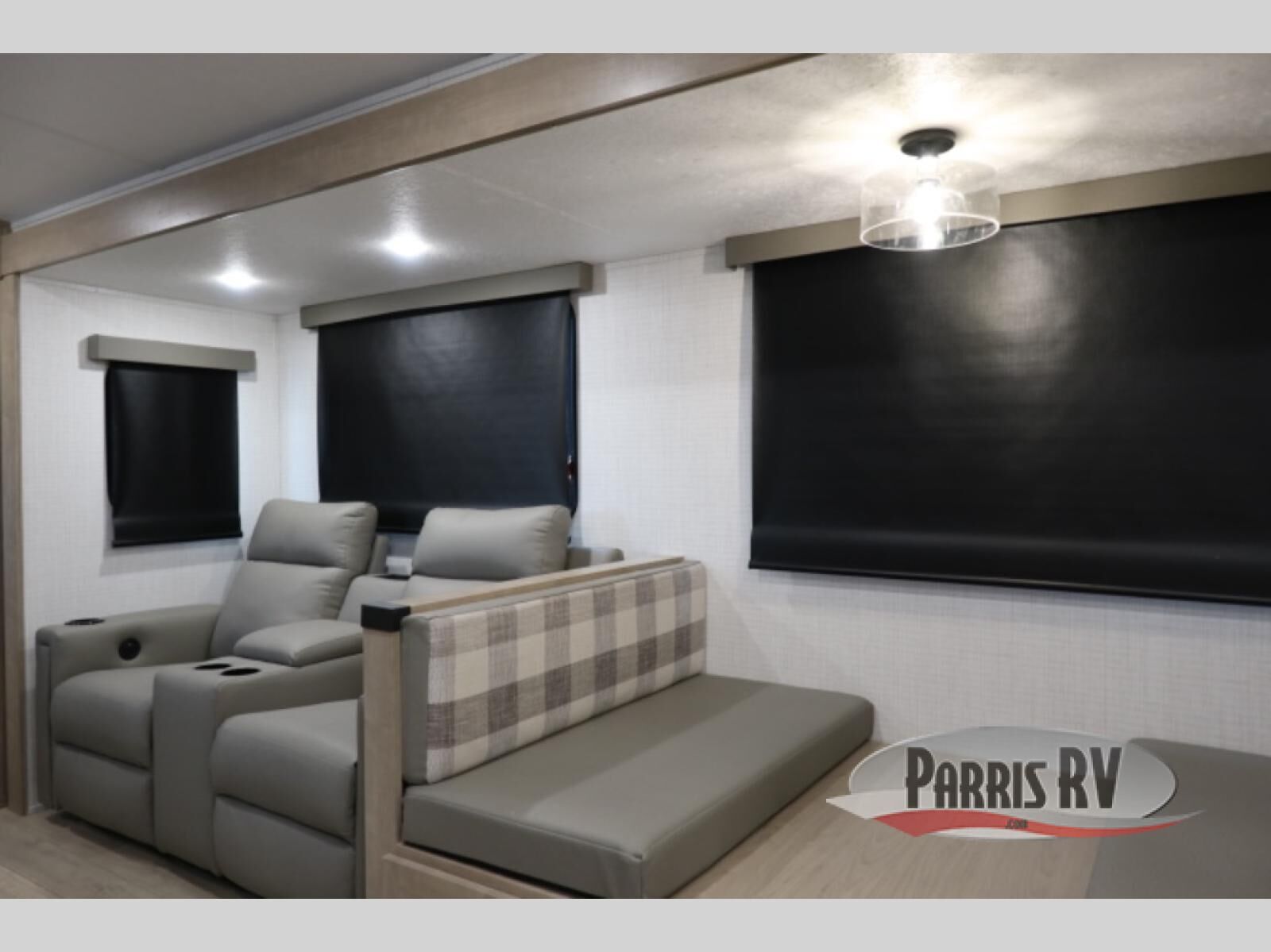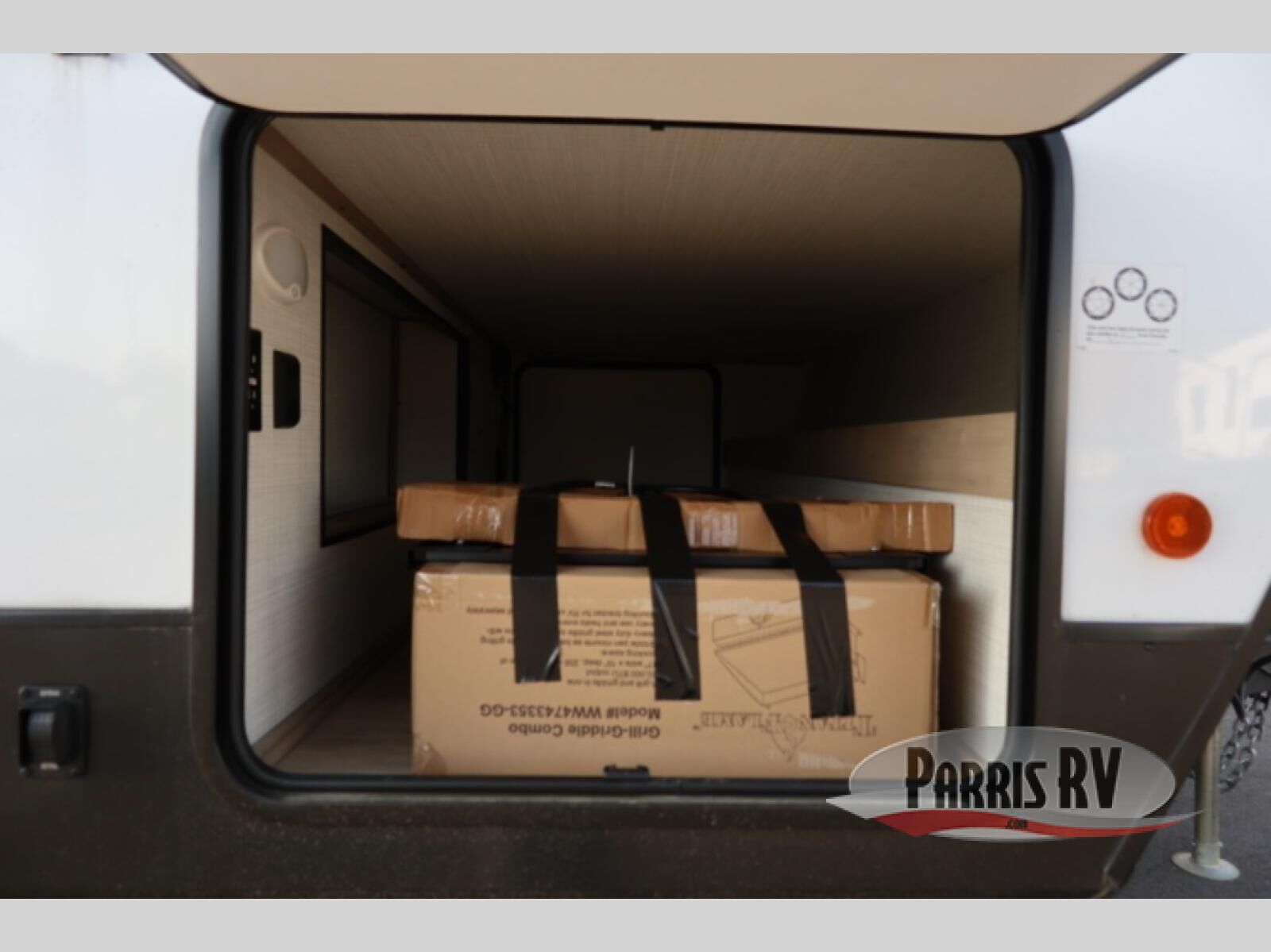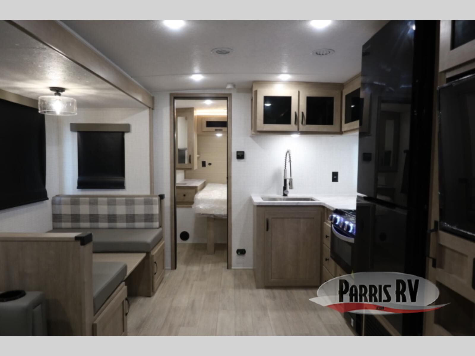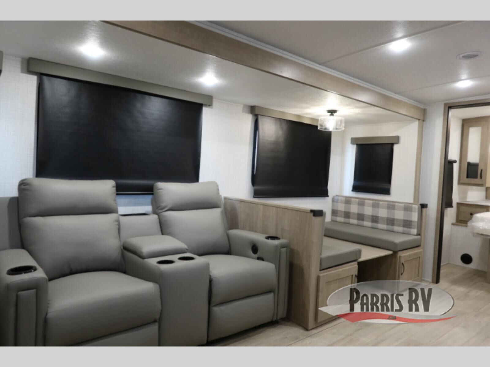 The large slide out in this trailer offers seating and sleeping space on a sofa sleeper and a booth dinette plus adds more floor space to the main living and kitchen area. The rear full bathroom has a 30" x 48" shower with a seat and a linen closet for towels and such, and the front bedroom includes a queen bed and clothing storage plus windows for views of your campsite. The cook will have the choice of making meals inside with full amenities including an 11 cu. ft. refrigerator and an L-shaped counter or outdoors on the outside kitchen. The 21' power awning provides an outdoor living area protected from the elements, and the exterior offers a drop frame pass-thru for ample storage space!