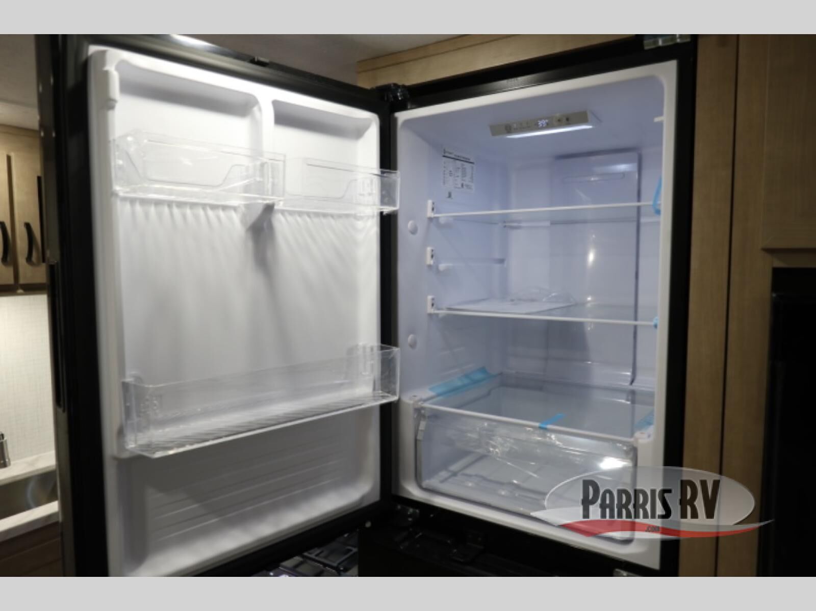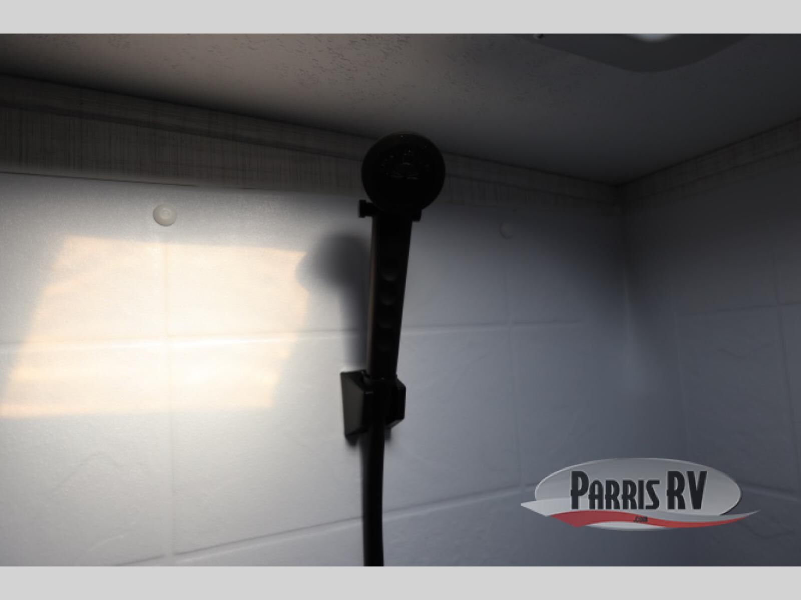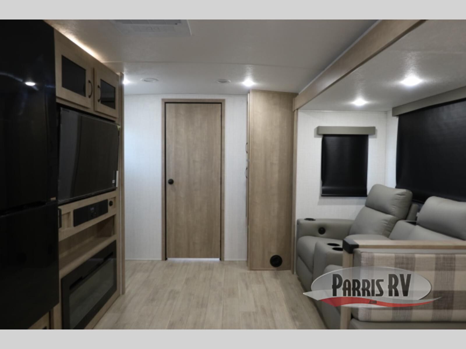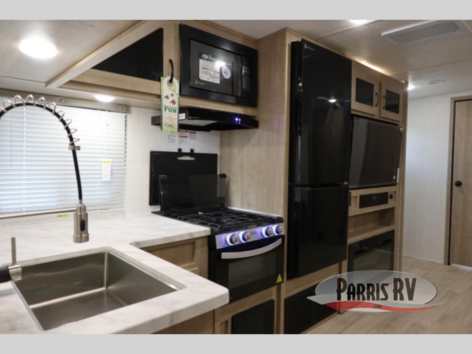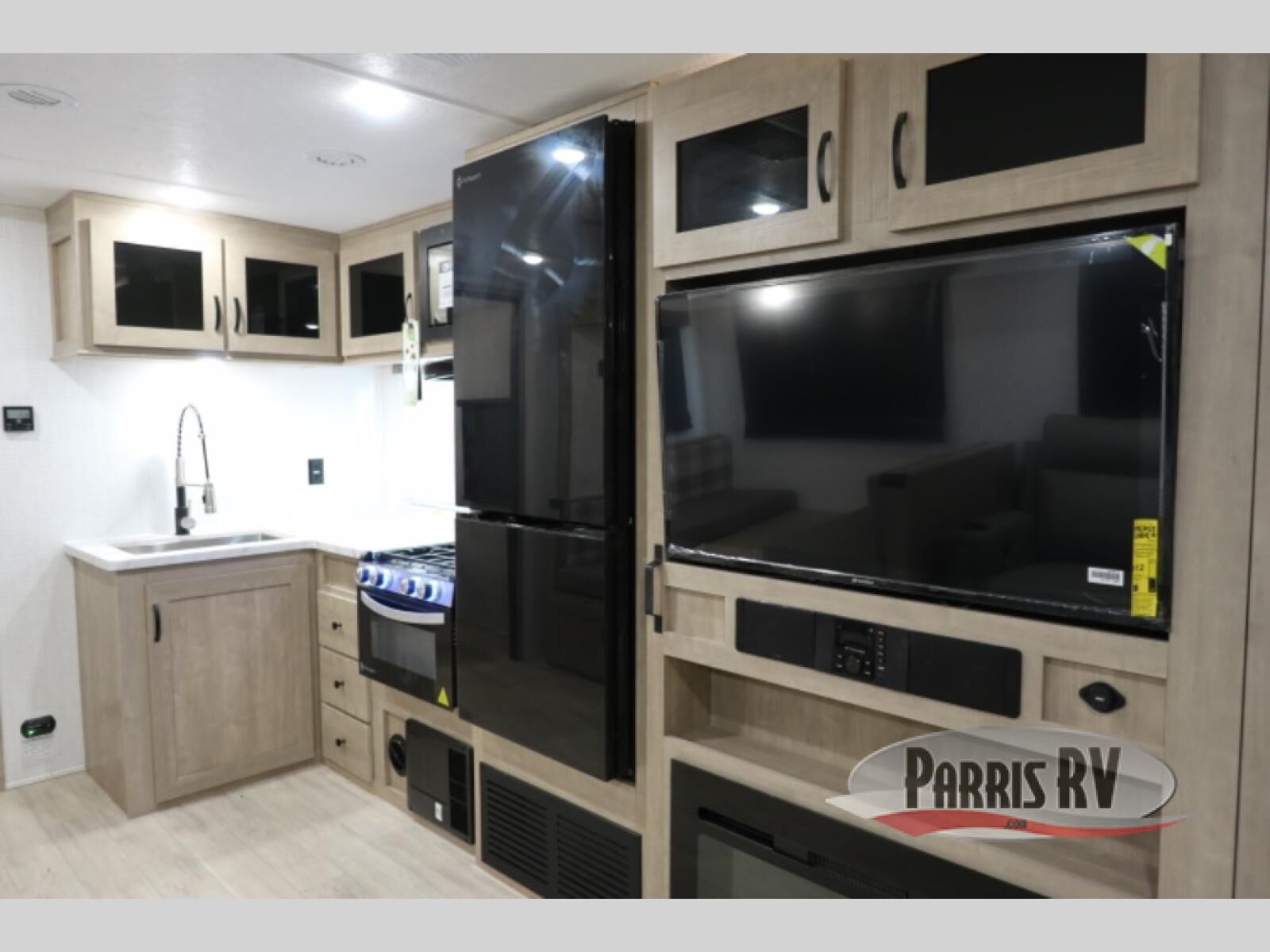 The large slide out in this trailer offers seating and sleeping space on a sofa sleeper and a booth dinette plus adds more floor space to the main living and kitchen area. The rear full bathroom has a 30" x 48" shower with a seat and a linen closet for towels and such, and the front bedroom includes a queen bed and clothing storage plus windows for views of your campsite. The cook will have the choice of making meals inside with full amenities including an 11 cu. ft. refrigerator and an L-shaped counter or outdoors on the outside kitchen. The 21' power awning provides an outdoor living area protected from the elements, and the exterior offers a drop frame pass-thru for ample storage space!