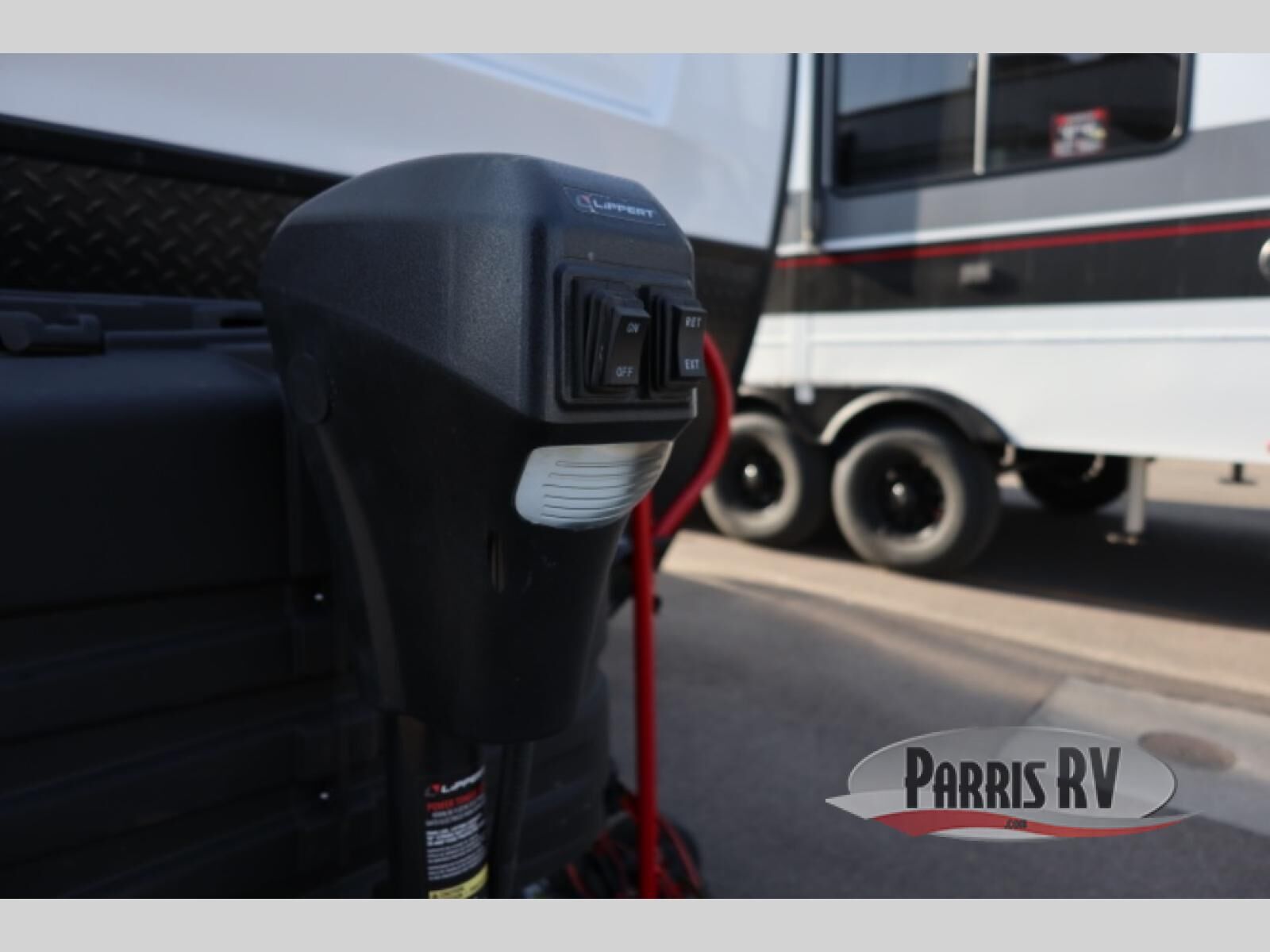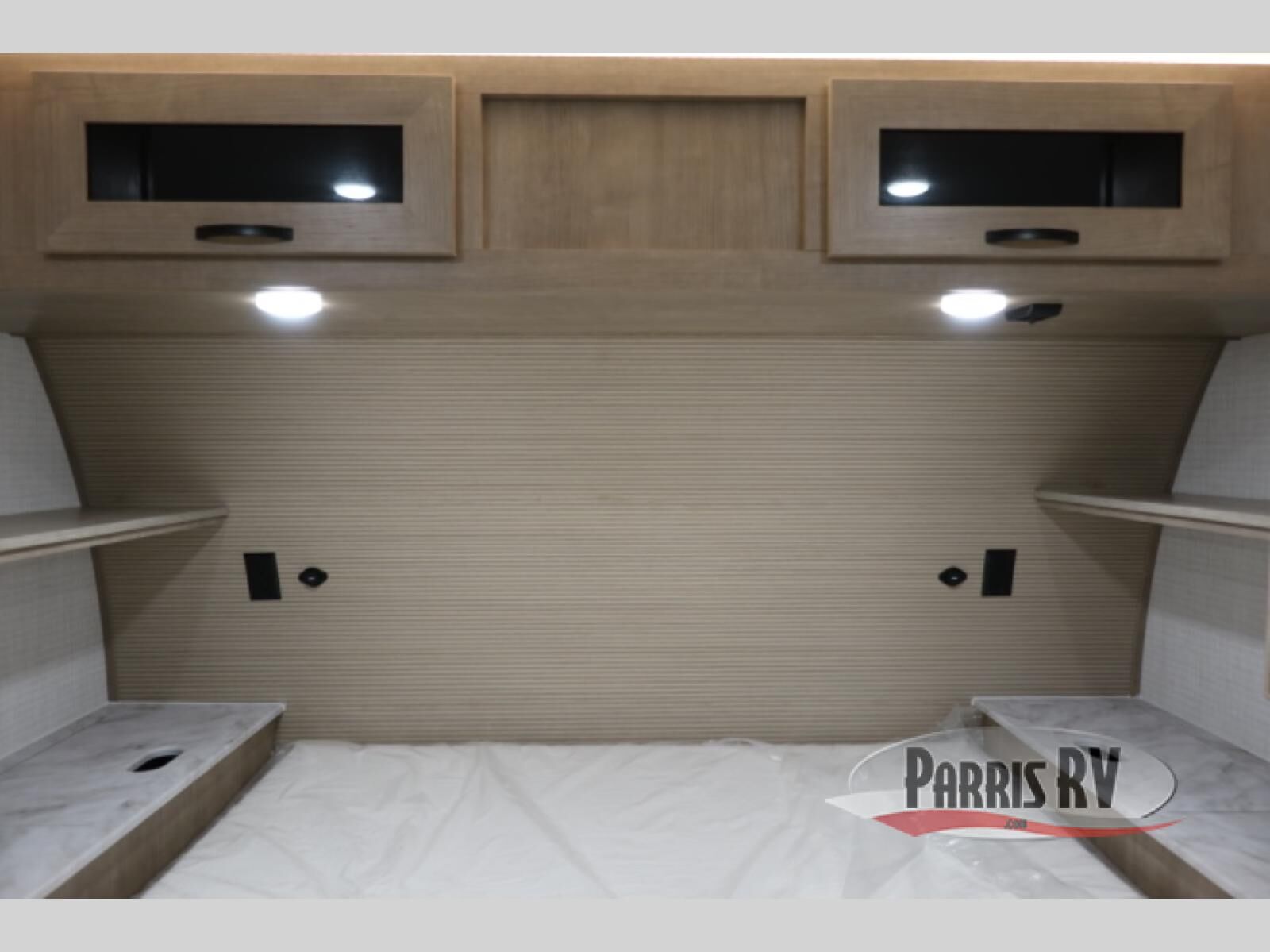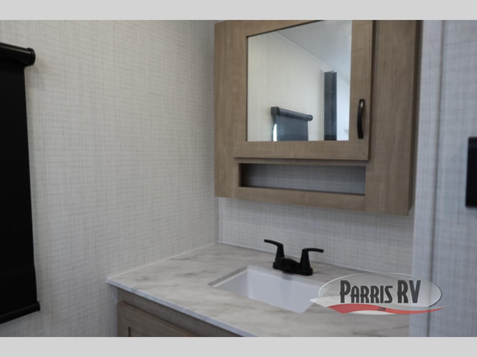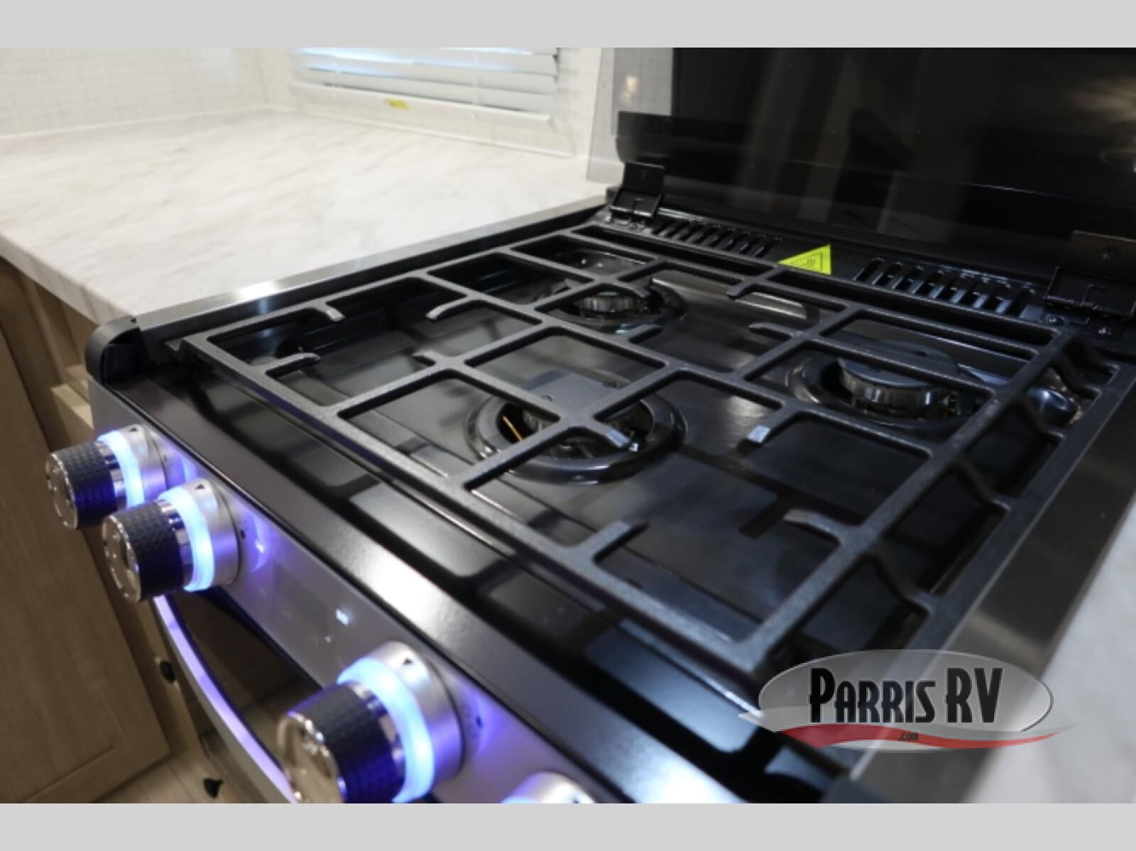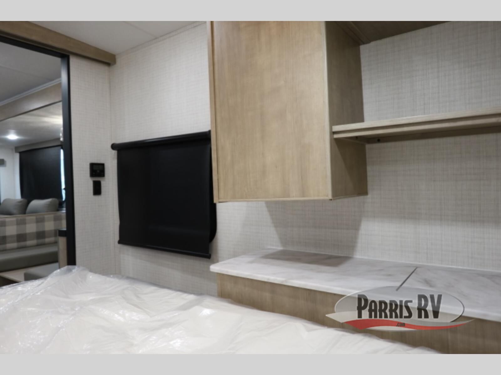 The large slide out in this trailer offers seating and sleeping space on a sofa sleeper and a booth dinette plus adds more floor space to the main living and kitchen area. The rear full bathroom has a 30" x 48" shower with a seat and a linen closet for towels and such, and the front bedroom includes a queen bed and clothing storage plus windows for views of your campsite. The cook will have the choice of making meals inside with full amenities including an 11 cu. ft. refrigerator and an L-shaped counter or outdoors on the outside kitchen. The 21' power awning provides an outdoor living area protected from the elements, and the exterior offers a drop frame pass-thru for ample storage space!