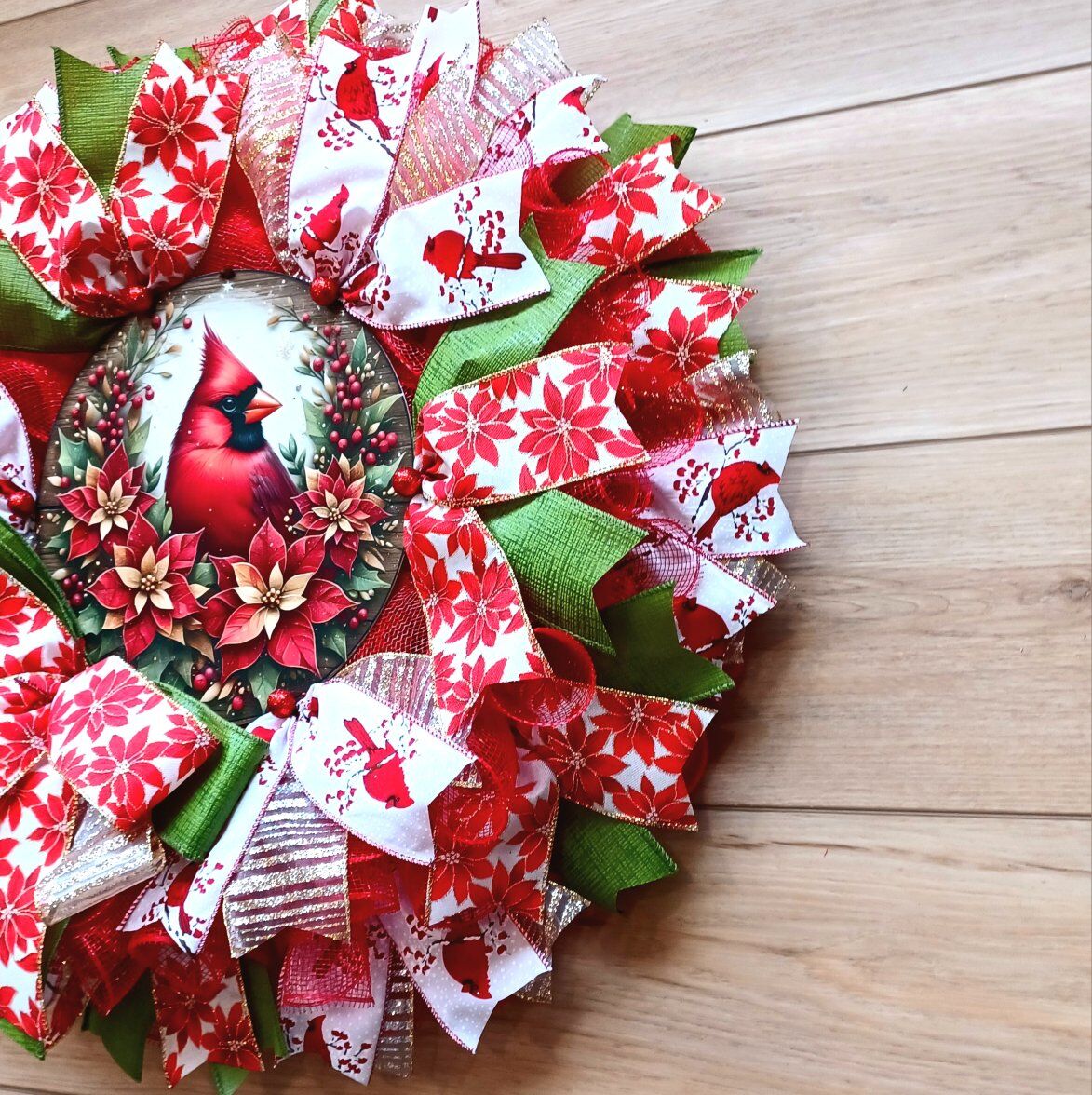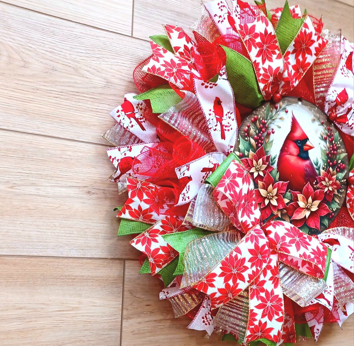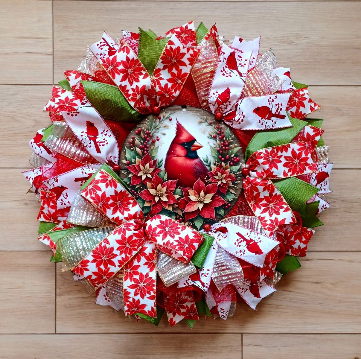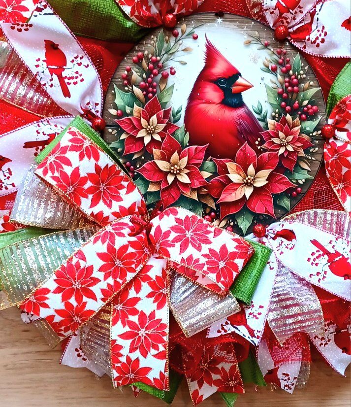 Welcome your friends with this beautiful new handmade 24" winter wreath with lots of ribbon and a colorful traditional cardinal bird sign ready for display from a smoke free home I can customize and ship just ask!!!