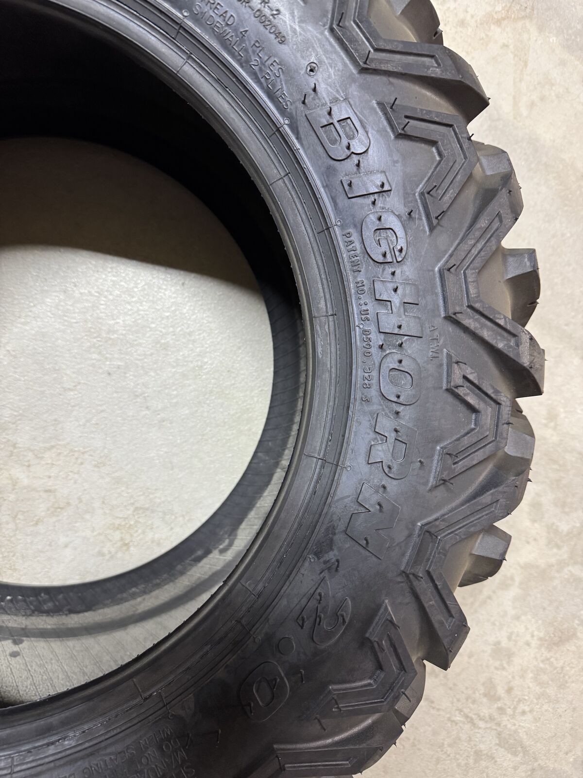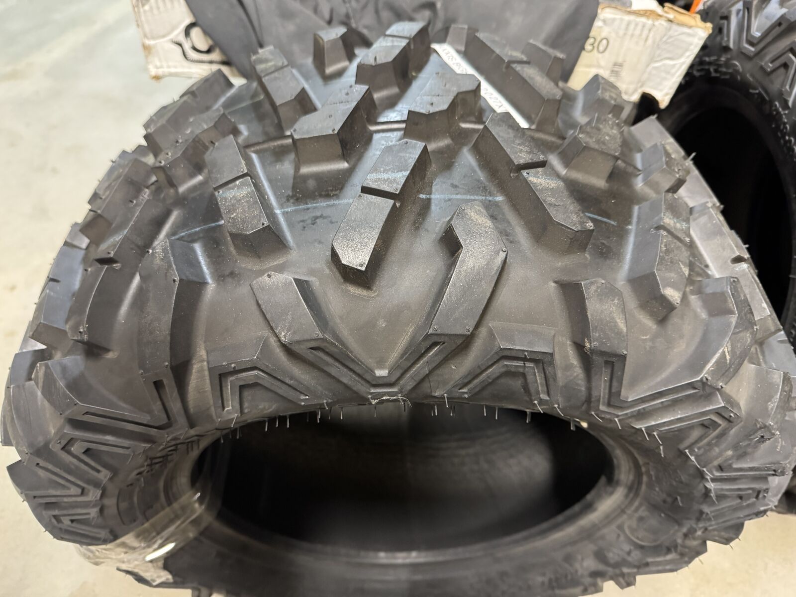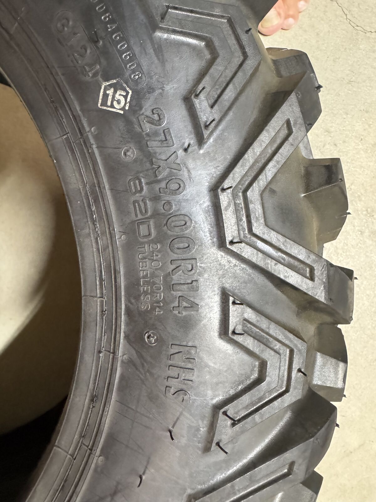 Tire sizes are 27x9x14's. Front. Rears are 27x11x14. New tires never been mounted. A great tire for a great price. Thanks for looking.