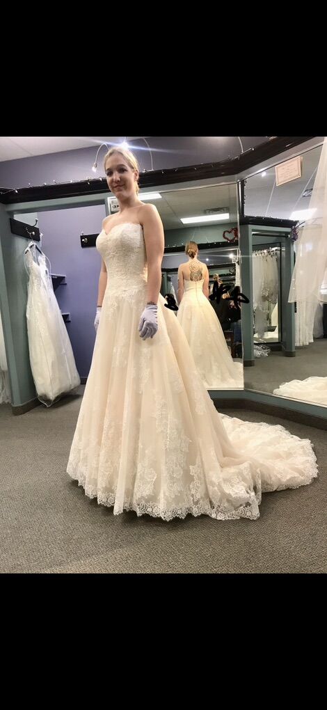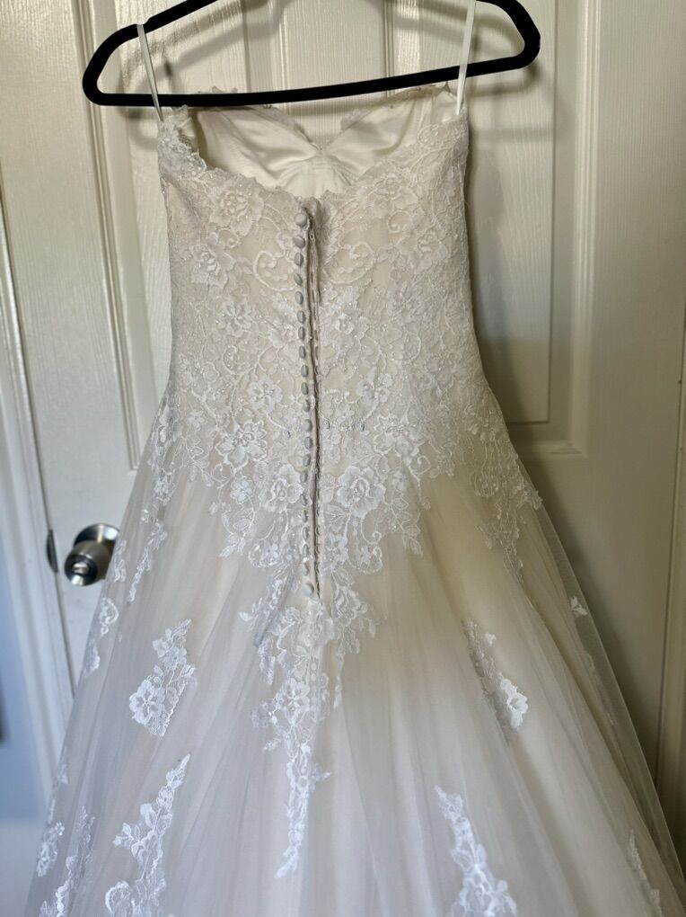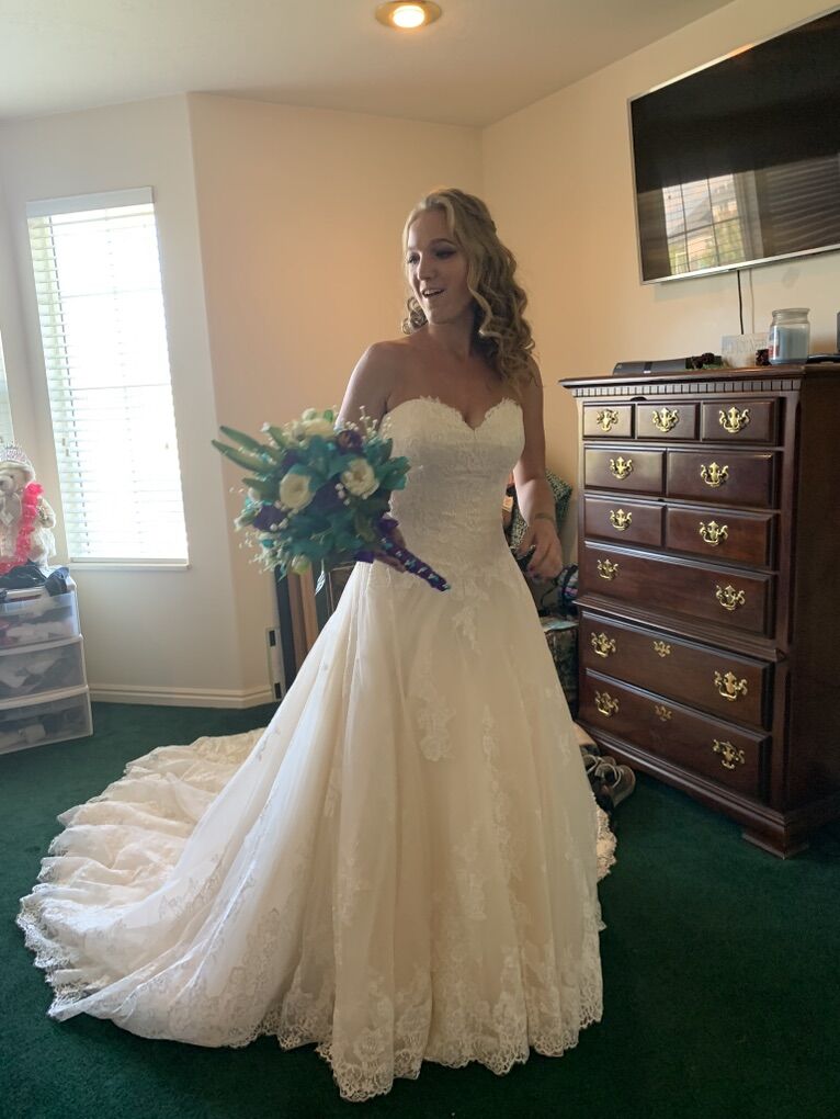 I have this beaut of a dress for sale! It was only worn for a total of 5 hours! It’s got a sweetheart neckline, the back zips up then has the buttons. It’s a size 6 Only asking $300 OBO