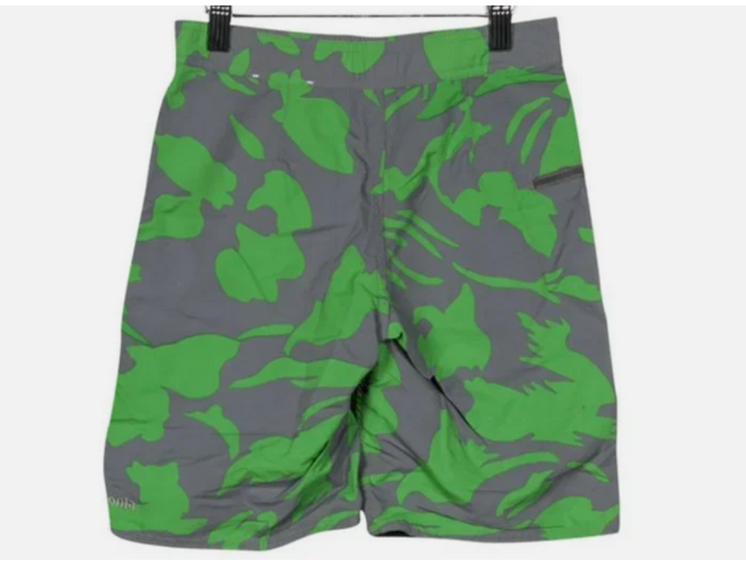 Description Grey and green Patagonia swim shorts with printed pattern throughout, zipper pocket at side and tie closure.