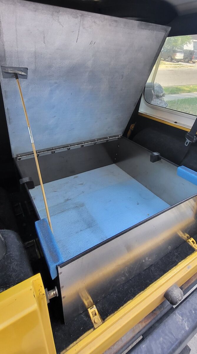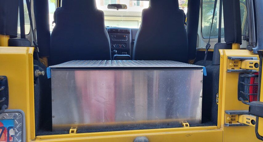 My father built this custom, full stainless steel storage box for the back of his TJ. Fits very nicely in the back without the rear seat installed. 32"D x 30"W x 12"T