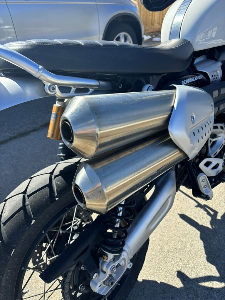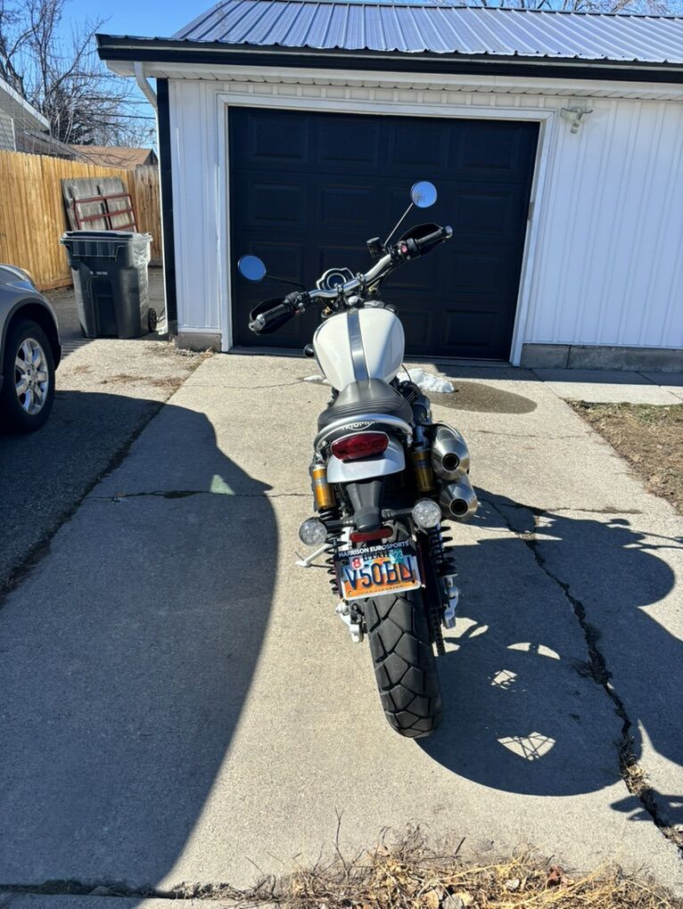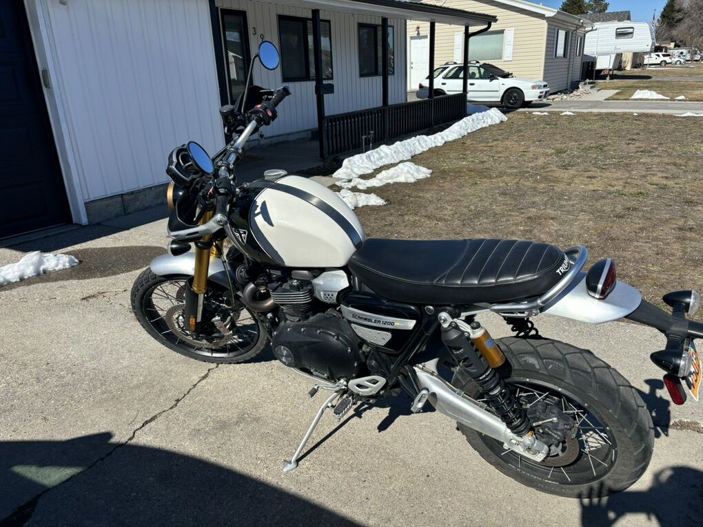 2019 Triumph Scrambler 1200XE. White and green with gold forks. Bought as the previous year’s model in 2020 new from Harrison Motorsports in Sandy, along with the service plan. Maintained by them. Ridden only 2200 miles. Garaged. This bike is still practically new.