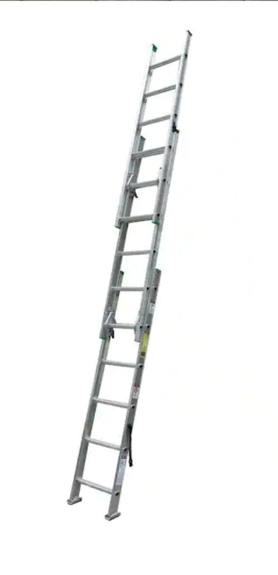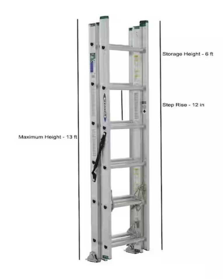 About This Product Compact and light enough to fit safely through tight spaces, yet strong and tall enough for the job, this full-size Werner Aluminum 3-Section Compact Extension Ladder reaches 15 ft. but reduces to 6 ft. for storing and transporting. There's no more damage to walls and furnishings from trying to fit an extension ladder into small, narrow spaces, this compact design can be used indoors and out for painting, window cleaning and other maintenance. The convenient handle makes it easy to carry from project to project, and the 225 lbs. load capacity offers ample support for a variety of projects. Aluminum construction offers lightweight durability 15 steps provide easy access to areas around the home ANSI type II rated, 225 lbs. load capacity for a variety of tasks Reaches 15 ft. and reduces to 6 ft. for compact storage and transportation Easily moves through tight, compact spaces with the convenient handle ANSI and OSHA compliant for safe usage