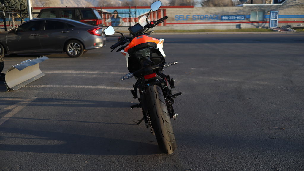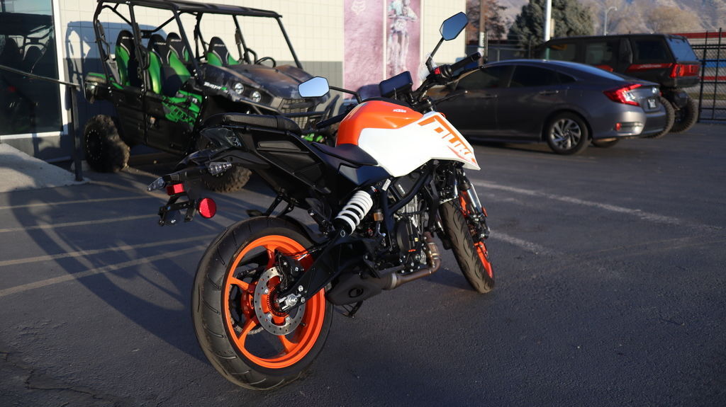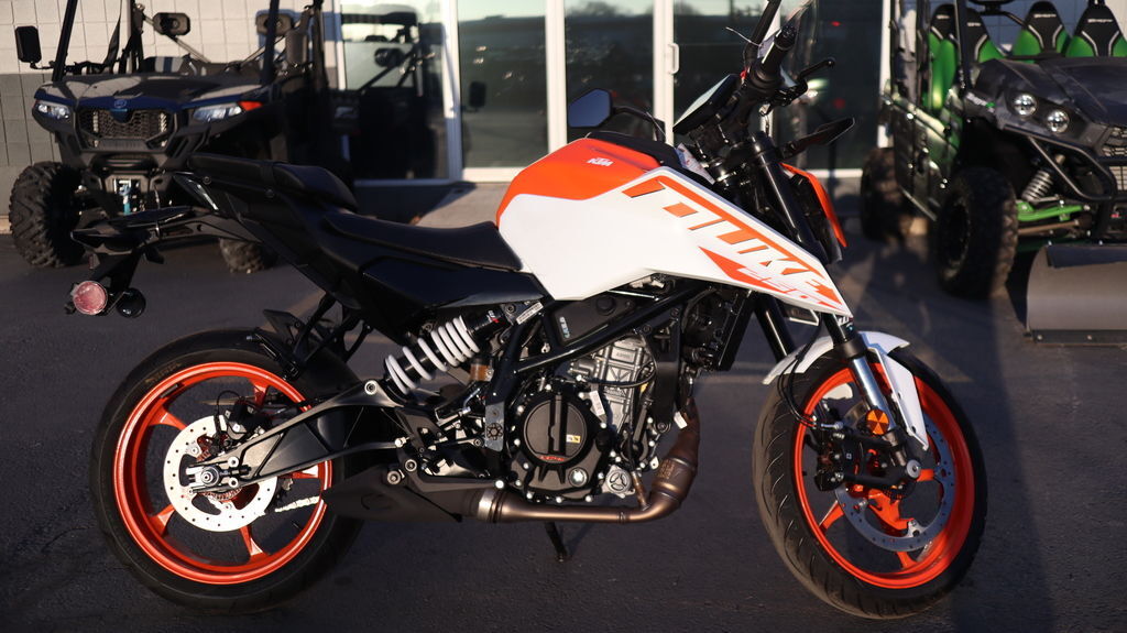 2024 KTM 250 Duke THE THRILL CHASER The KTM 250 DUKE flaunts with, a new 250 cc powerplant - this machine is 250% DUKE! Built with the same NAKED ethos as its bigger brethren, the 2024 KTM 250 DUKE boasts an all-new, muscled-up attitude, complete with a fresh new frame, suspension package, LED lights, riding tech, and street-ripping, turn-gripping aggression. Features may include: Display & Connectivity Everything you need at a glance. The 2024 KTM 250 DUKE features an all-new 5" LCD dashboard. This is paired with a new switch cube, with 4-way menu switches that allow easy interaction with all vehicle functions – even smartphone connectivity. Speaking of which, All new generation DUKE models are equipped with connectivity functions, allowing pilots to play music, take incoming calls, and get to where they are going with Turn-by-Turn navigation. Bodywork Embracing its NAKED lineage, the 2024 KTM 250 DUKE has no shame in bearing it all. Casting an ever-impressive shadow, bristling with shark-like edges and visible air intakes, and painted headlight surround, the KTM 250 DUKE boasts an aggressive stance. A new metal fuel tank, color-injected plastics, and LED lights complete the package. Engine Boasting the latest generation in LC4c engines, the 2024 KTM 250 DUKE muscles up with more power, smoother acceleration, and lighter overall weight than before. Drawing from years of experience in the small engine game, the 2024 KTM 250 DUKE now also features an improved gearbox, and an optimized cylinder head. Oh, and did we mention it is also READY TO RACE? LED Lighting Tearing a deep gash into the night, all 2024 KTM DUKE models come equipped with powerful LED lights in the front and at the rear. Not only do these work when the world becomes dark, but they also provide improved visibility when navigating busy traffic or misty road conditions. Ergonomics Thanks to a slightly longer wheelbase, new seat heights, and frame geometry, the 2024 DUKE range boasts dramatically improved cornering behavior, stability, and handling proficiency. This, along with an already sterling reputation as being a THE THRILL CHASER and an aggressive seating position, means the 2024 KTM 250 DUKE sets the standard when it comes to energetic NAKED machinery. Seat Improved comfort for the rider and pillion, thanks to thicker seat foam, a narrower profile, and an overall improvement in general ergonomics. Need for more or less seat height? The 2024 KTM 250 DUKE has a standard seat height of 31.4 in (800 mm), but can easy be increased to 32.2 in (820 mm) with the optional KTM PowerParts seat offering. Frame The new design features a 2-piece construction composed of an all-new steel trellis main frame with a pressure die-cast aluminum subframe. The rear shock absorber is now also mounted off-center to allow for a larger airbox while reducing seat height and, at the same time, adding to the DUKE's aggressive stance. Not only designed for looks, the primary objective of the frame design is to enhance vehicle dynamics by augmenting torsional rigidity, improved agility, and enhanced feedback from the chassis. Swingarm A new curved cast aluminum swingarm provides a sturdy and durable platform for the rear suspension system, featuring a direct shock absorber mount that is now offset to the side, for that super-racy look. This also creates additional space for the new exhaust muffler, providing added attitude.