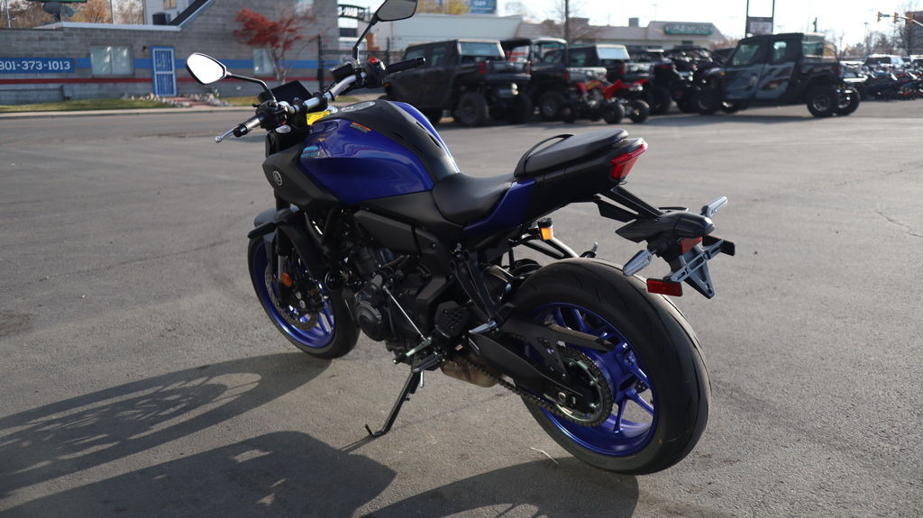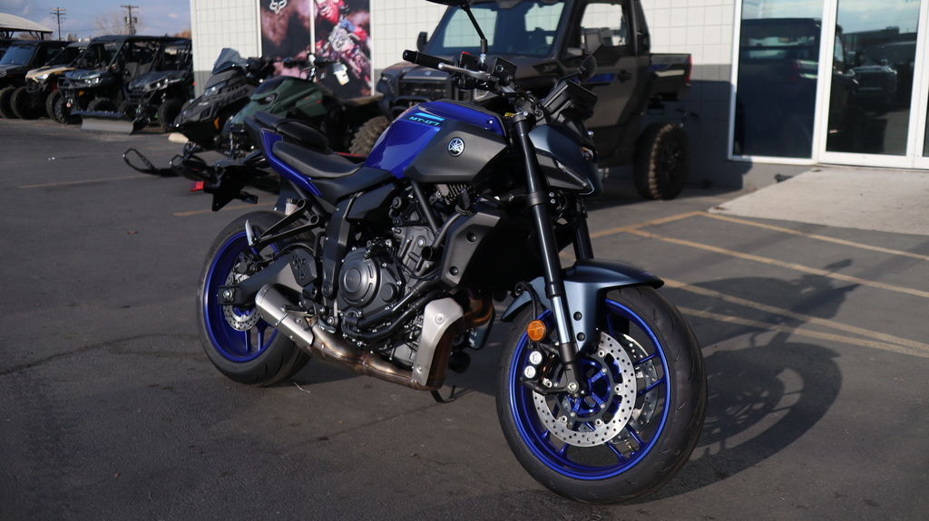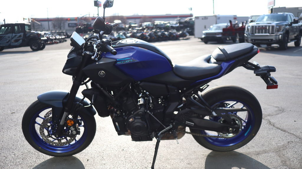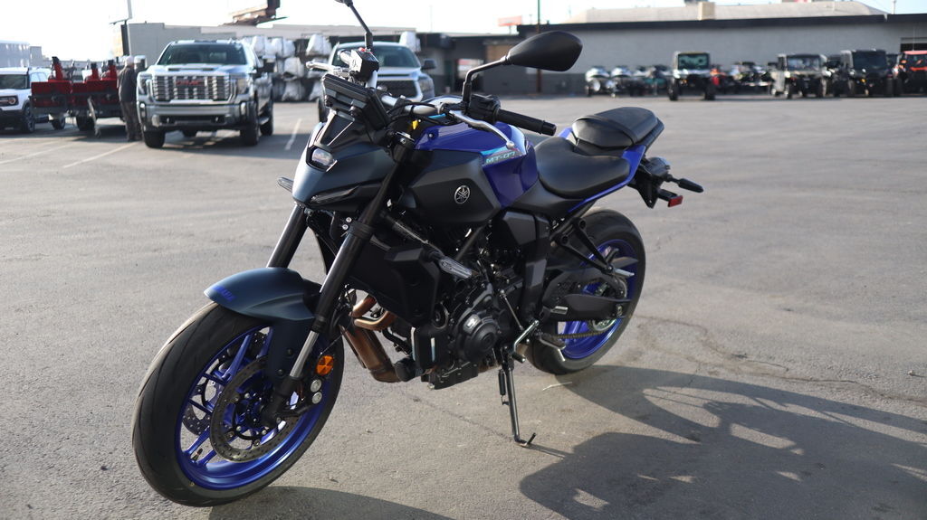 2025 Yamaha MT-07 DAWN OF A NEW DARKNESS The new 2025 MT-07 is the highest specification yet, including new radially mounted front brake calipers, 41 mm inverted forks, lightweight SpinForged wheels and striking next-generation MT styling. Features may include: All-New Minimalist Styling The 2025 MT-07 gets an all-new stripped-back look with a minimalist LED headlight unit creating the striking new face clearly inspired by the Dark Side of Japan's distinctively modern styling aesthetic. With engineering and styling in perfect harmony, nothing is added to the MT-07 unless it truly enhances the riding experience. The result is a motorcycle which connects to its rider in a way few others can match. New YCC-T, YRC Riding Modes & Switchable TCS A new Yamaha Chip Controlled Throttle (YCC-T) contributes to an even more linear power delivery to create a greater connection between rider and machine while enabling a new generation of electronic aids including Yamaha Ride Control (YRC) with three available throttle maps and switchable Traction Control. YRC includes two quick-select preset modes (SPORT and STREET) along with a customizable YRC mode allowing the rider to match their preferred power delivery to their preferred level of Traction Control. Acoustic Amplifying Technology Contributing to the visceral connection between rider and machine, the new MT-07 now features a sound amplification system which harnesses the bike's induction roar, channeling it to the rider to enhance the feeling of acceleration provided by the MT's famous torque. New Assist & Slipper Clutch A new Assist & Slipper (A&S) clutch utilizes an assist cam and slipper cam to help inhibit excessive engine braking for a smooth, easy-to-handle feeling during downshifts while also reducing the amount of force required to pull the clutch lever for less hand fatigue. The shape of the clutch lever has also been optimized for enhanced feel. Highly Responsive KYB® Adjustable Suspension A new inverted 41mm KYB® front fork offers high levels of control and a planted front-end feel when cornering and braking, all while providing the MT-07 with a more modern look. The linked-type monocross KYB® rear shock is optimized to match the rigidity of the new front fork, creating a more sporting ride.