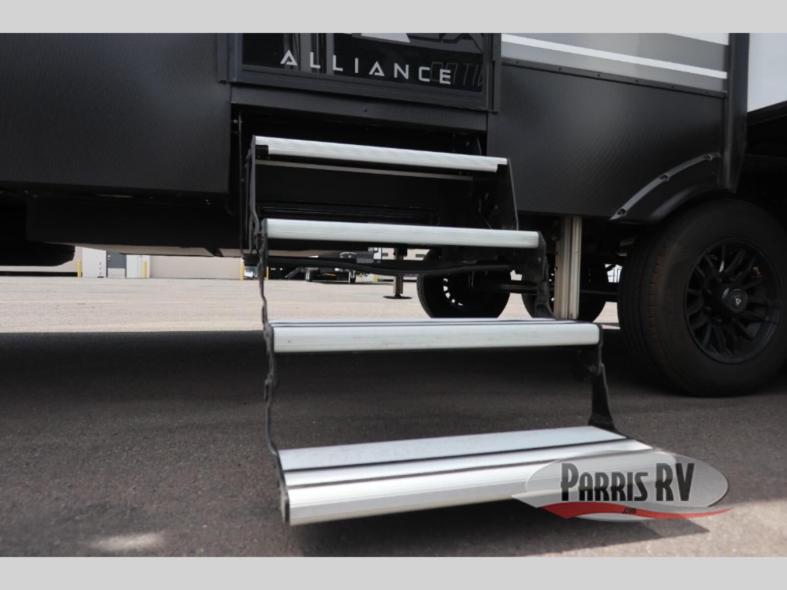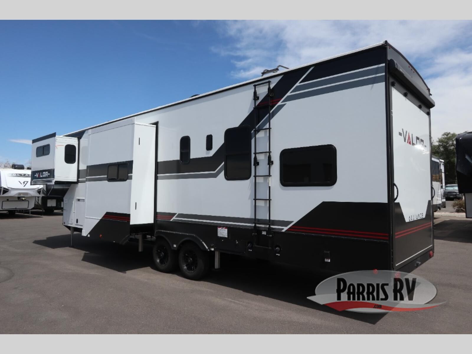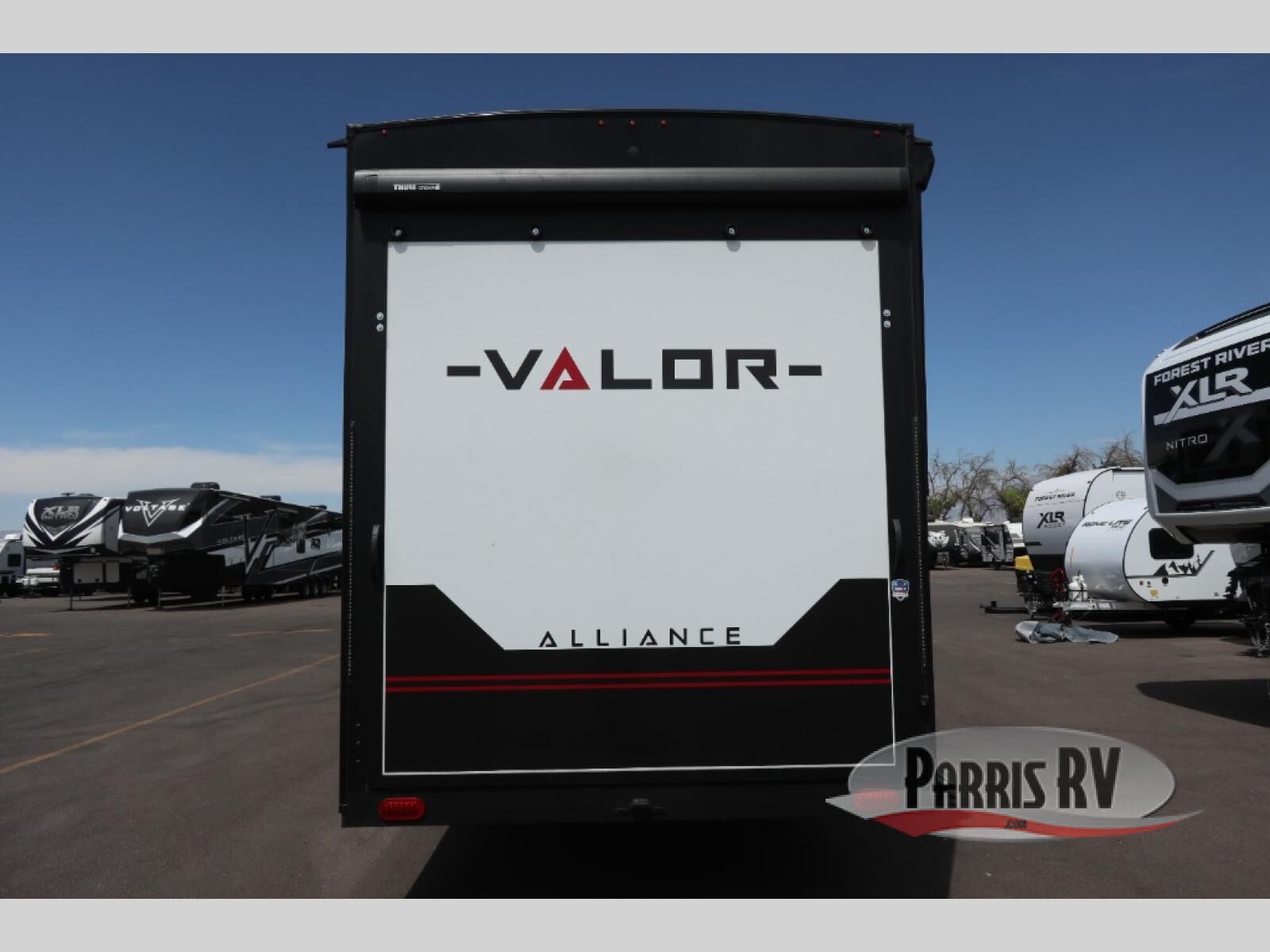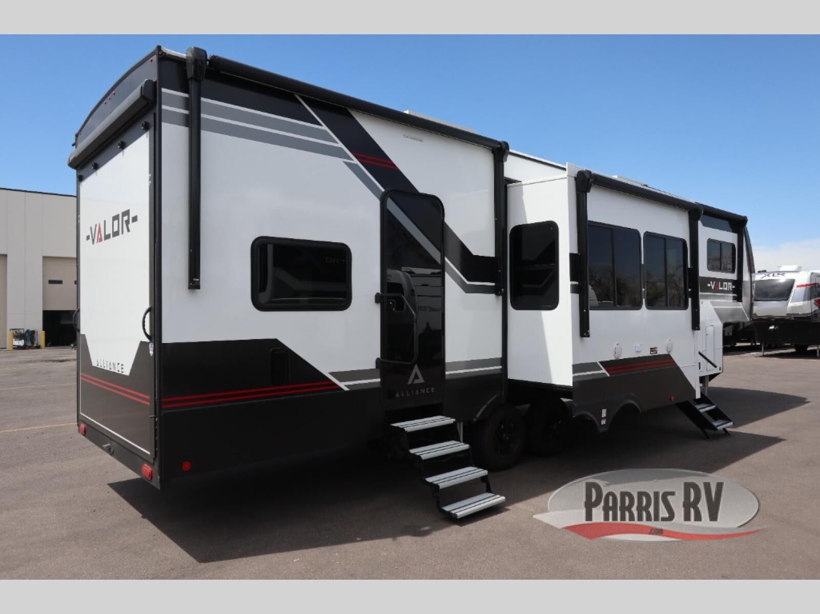 You can bring your toys with you wherever you go with any one of these Alliance RV Valor toy hauler fifth wheels! They are adventure-ready with a quality build from the walk on roof with seamless PVC roof covering to the commercial grade vinyl flooring and MorRyde CRE3000 suspension system. The Performance Running Gear package comes with a 101" wide-body benchmark chassis platform, 7,000 lb. Dexter axles, and a space enhancing drop frame storage compartment to pack in all your riding gear. You can even go off-gridding thanks to the Off the Grid Pack that has two 400 watt solar panels, generator prep, a 40 amp charge controller, and a 100 amp hour lithium iron phosphate battery. Some of the interior comforts you will enjoy are the hardwood cabinet doors and drawers, solid surface kitchen countertops, and commercial grade vinyl flooring with no carpet to make clean up a breeze. The Valor toy haulers are also the Masters of 12 Volt with USB charging station throughout, a stainless steel refrigerator, and more 12 volt features to make camping hassle-free!
