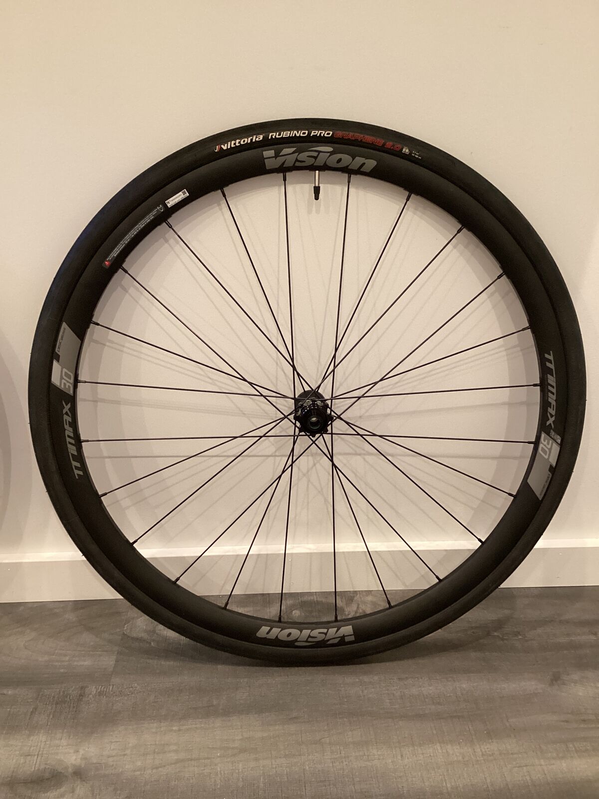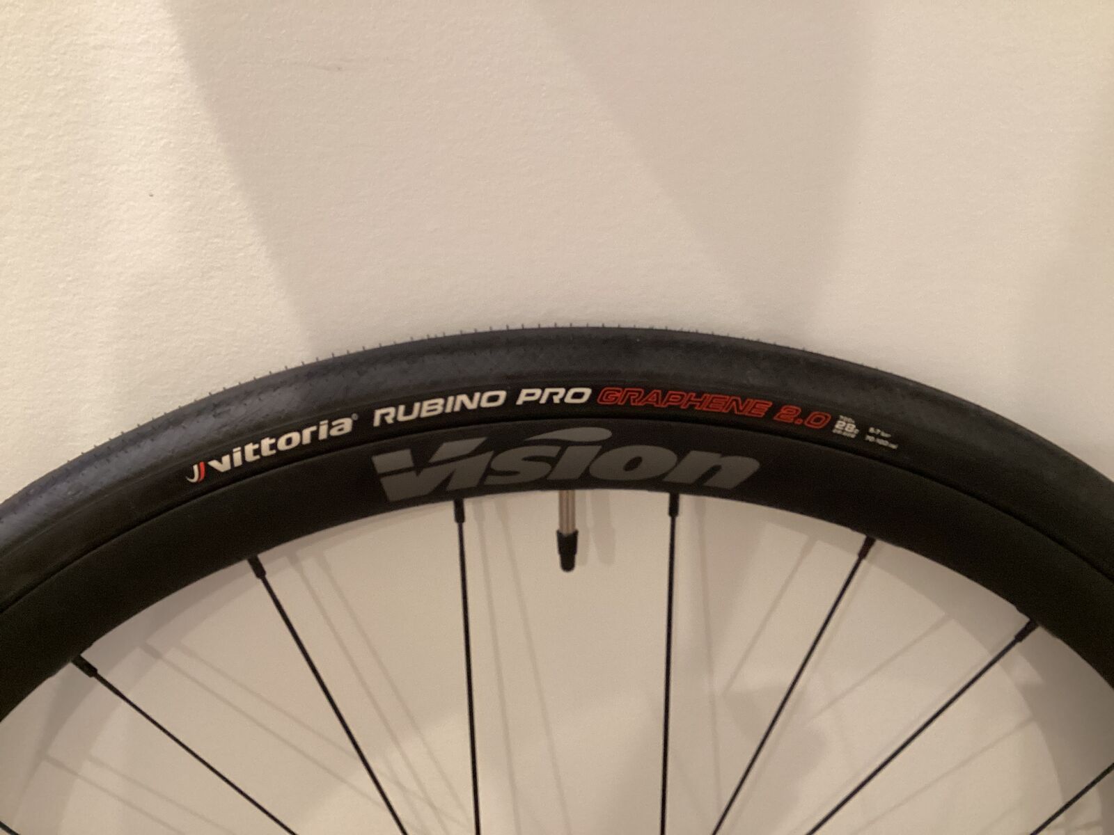 ZelleNew Vision TriMax 30 Disc Tubless Ready Shimano HG-11/12 Freehub w/centerlock disc. Hand built wheels with bladed spokes vision hubs and milled aluminum rims. Vittoria Rubino Pro Graphine Pro 28mm tires. All new never have touched the pavement, Billed as great for Road, Gravel or CX wheel setup, upgrade now with minimal cost. Hub spacing front: 12x100 Rear: 12x142. The tires retail for $150 alone.