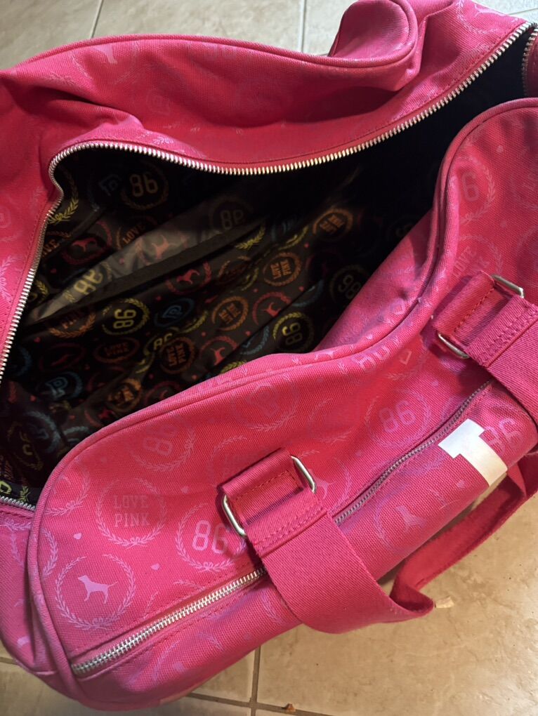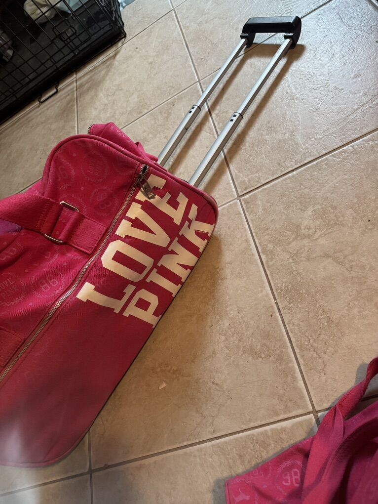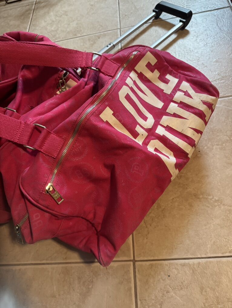 Victorias Secret Love Pink Graphic Grey Wheeled Duffel Bag & Carry On 2 Pieces