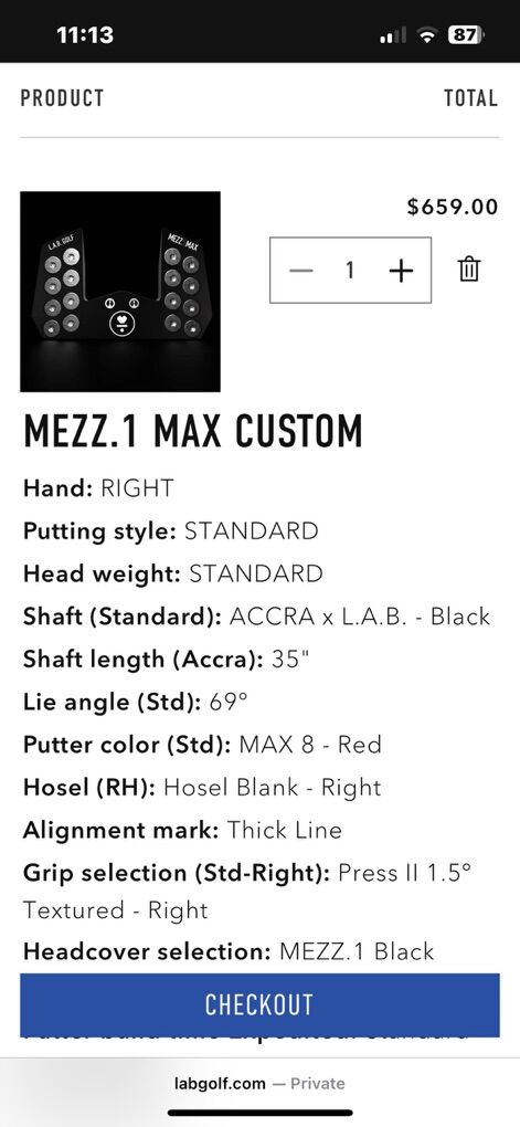 ApplePayCustom mezz.1 max with Accra shaft, pistol press grip 1.5. Normal mezz wear on corners. 35” 69 degree lie. Built out on lab this putter is $660. Made in America. They also just sold out to private equity. Before to long they won’t be made to this quality. Firm on price