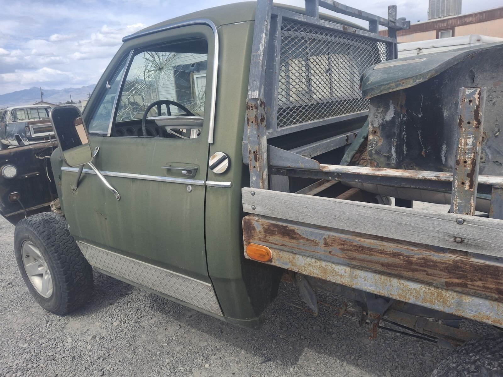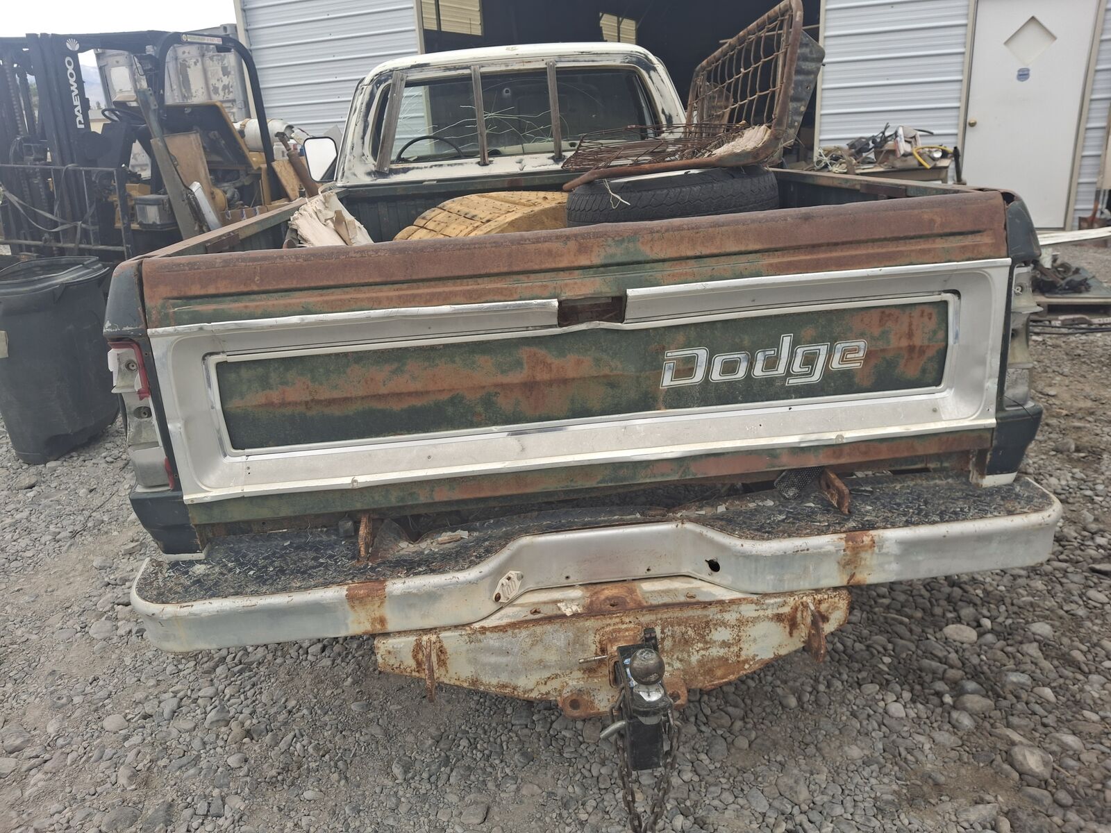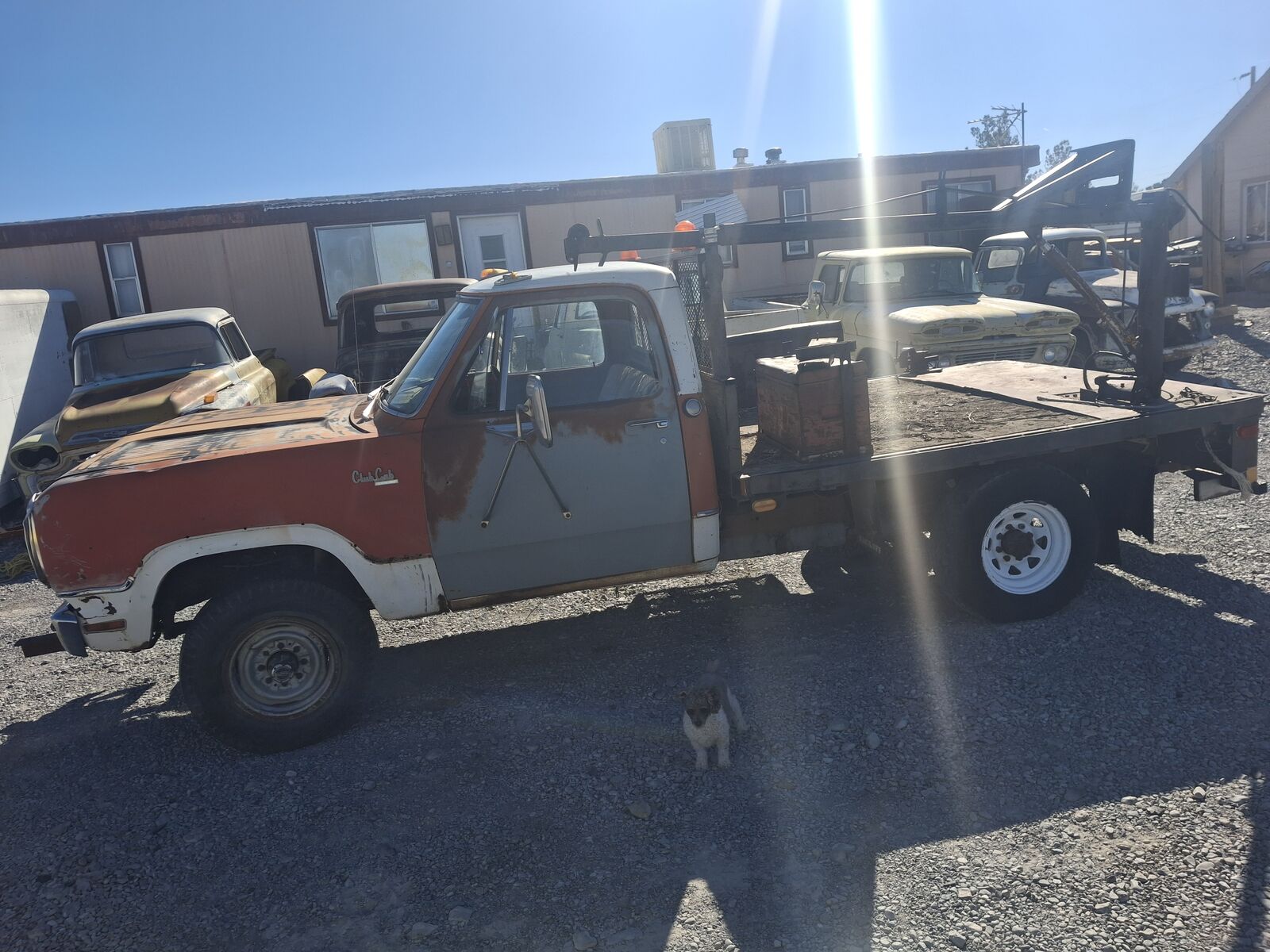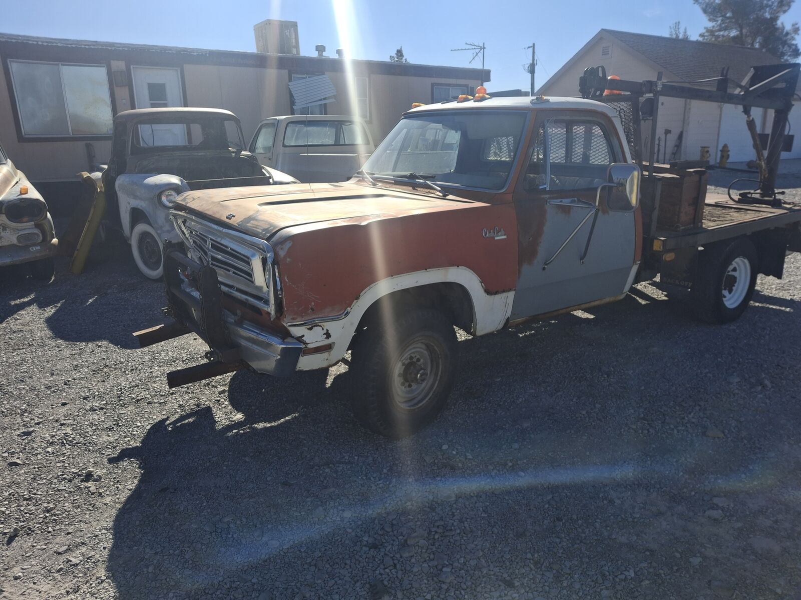 1978 dodge W 150, 4x4, short bed, TITLE, W/flat bed, v-8 manual trans, missing front clip, $1500.