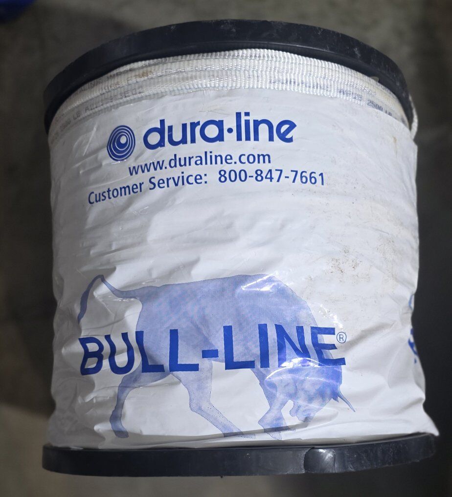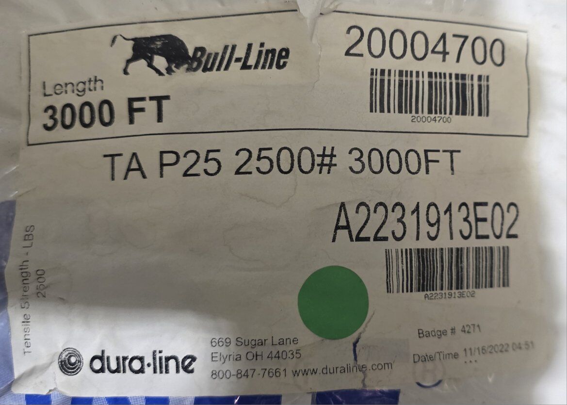 Dura-Line Bull-Line Pull Tape PolyPull 20000077 TA P25 2500# 3/4" x 3000' White. Material: It is made from 100% polyester. It offers high tensile strength, with the specific spool shown likely being a 2500 lbs strength version. Length: The spool contains 3000 feet of pull tape. Features: It can include features like Stiff-Tape™ Lubricated Coating for easier pulling and accurate sequential foot/meter markings.
