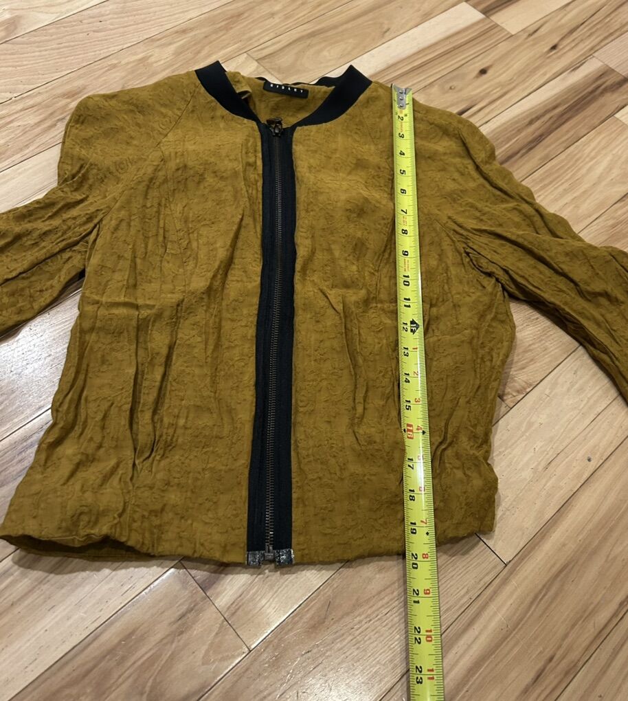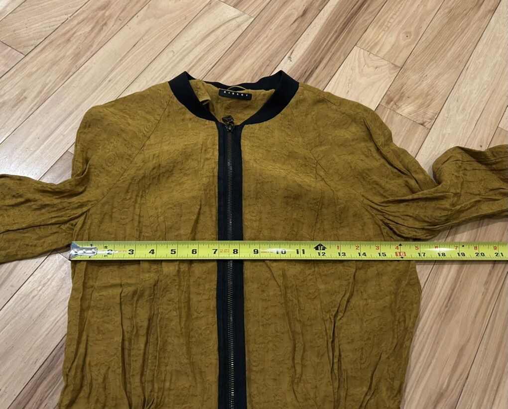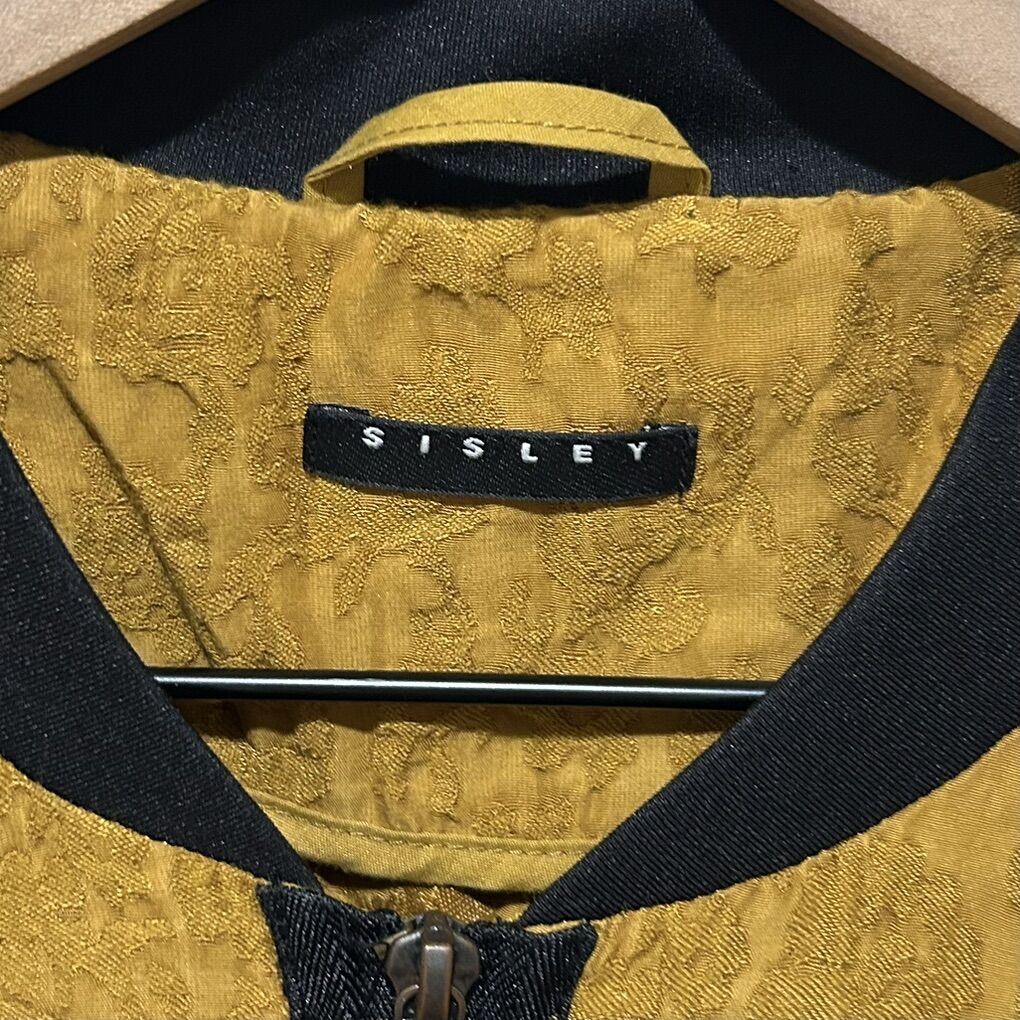 Sisley Yellow / Gold Zippered Front Bomber Jacket - Women’s Size Small - lightweight with black accents and a vague floral design - great condition - pre-owned.