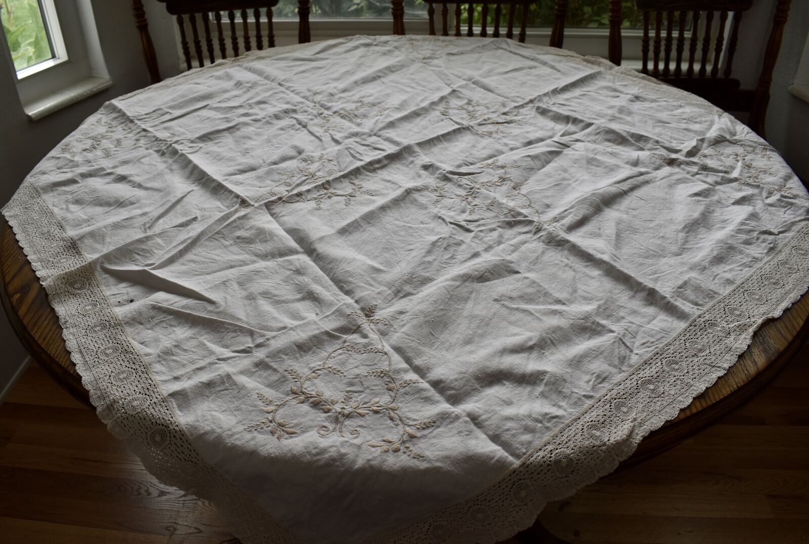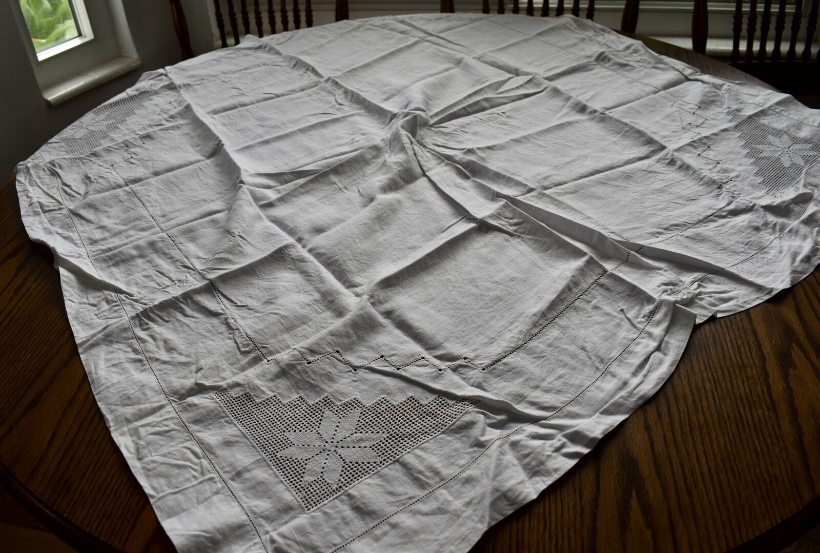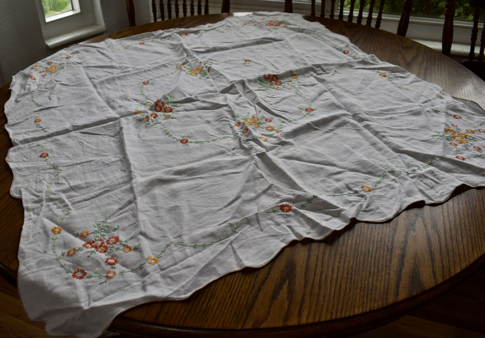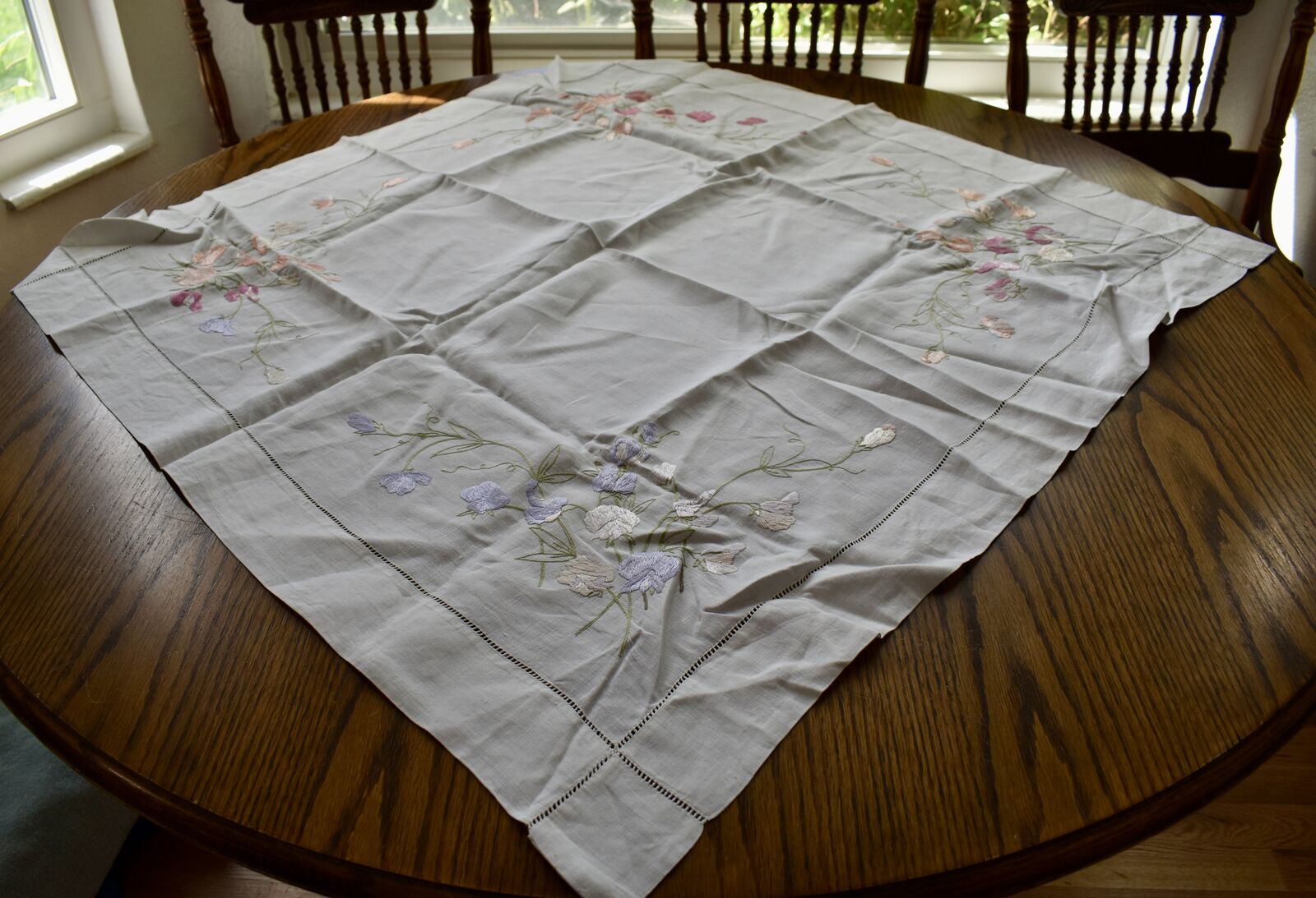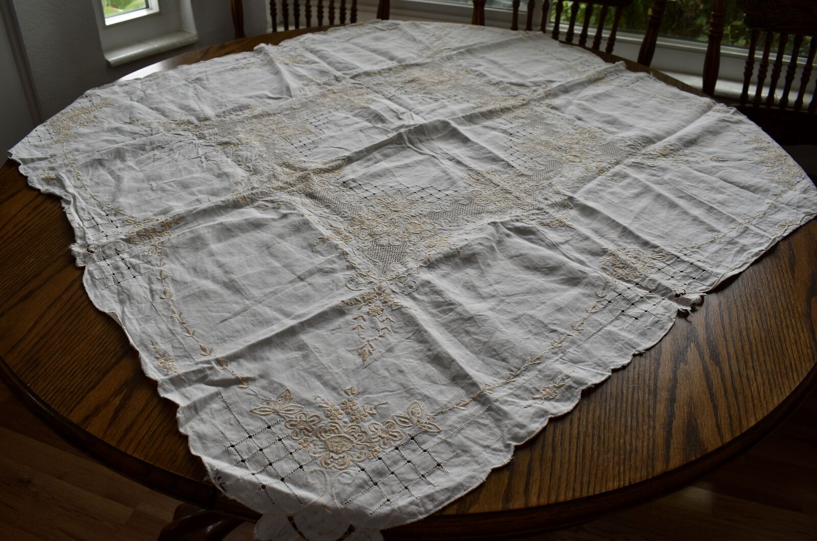 IT MEASURES… The Table that these pretty Table Cloth Linens were displayed on for the photos measures approx.48 inches across - ( That may give you a general idea of the size of each one. )
