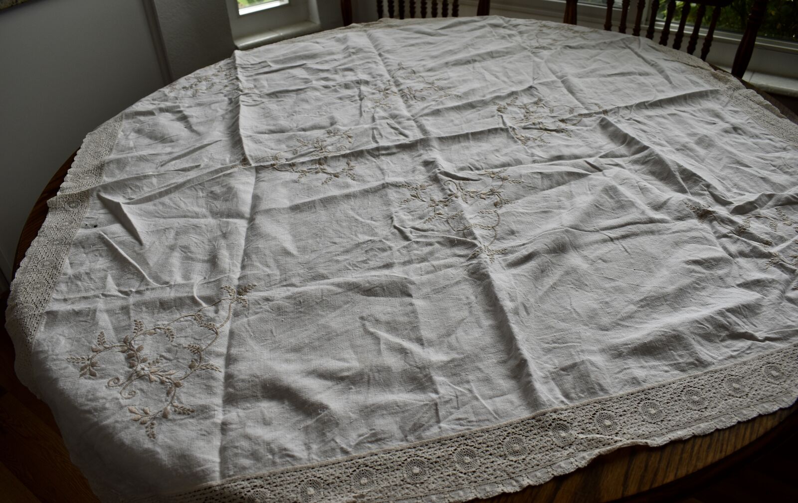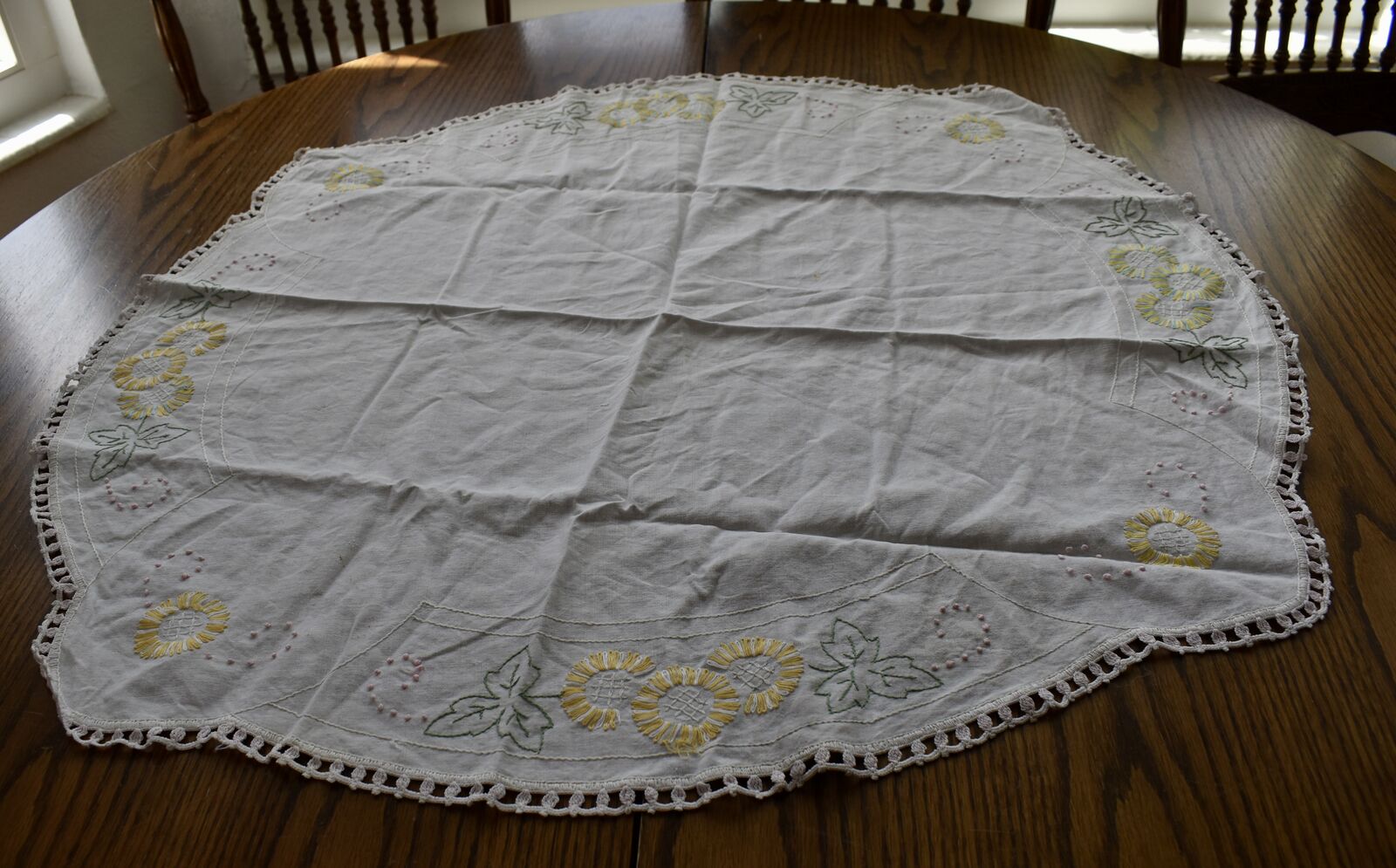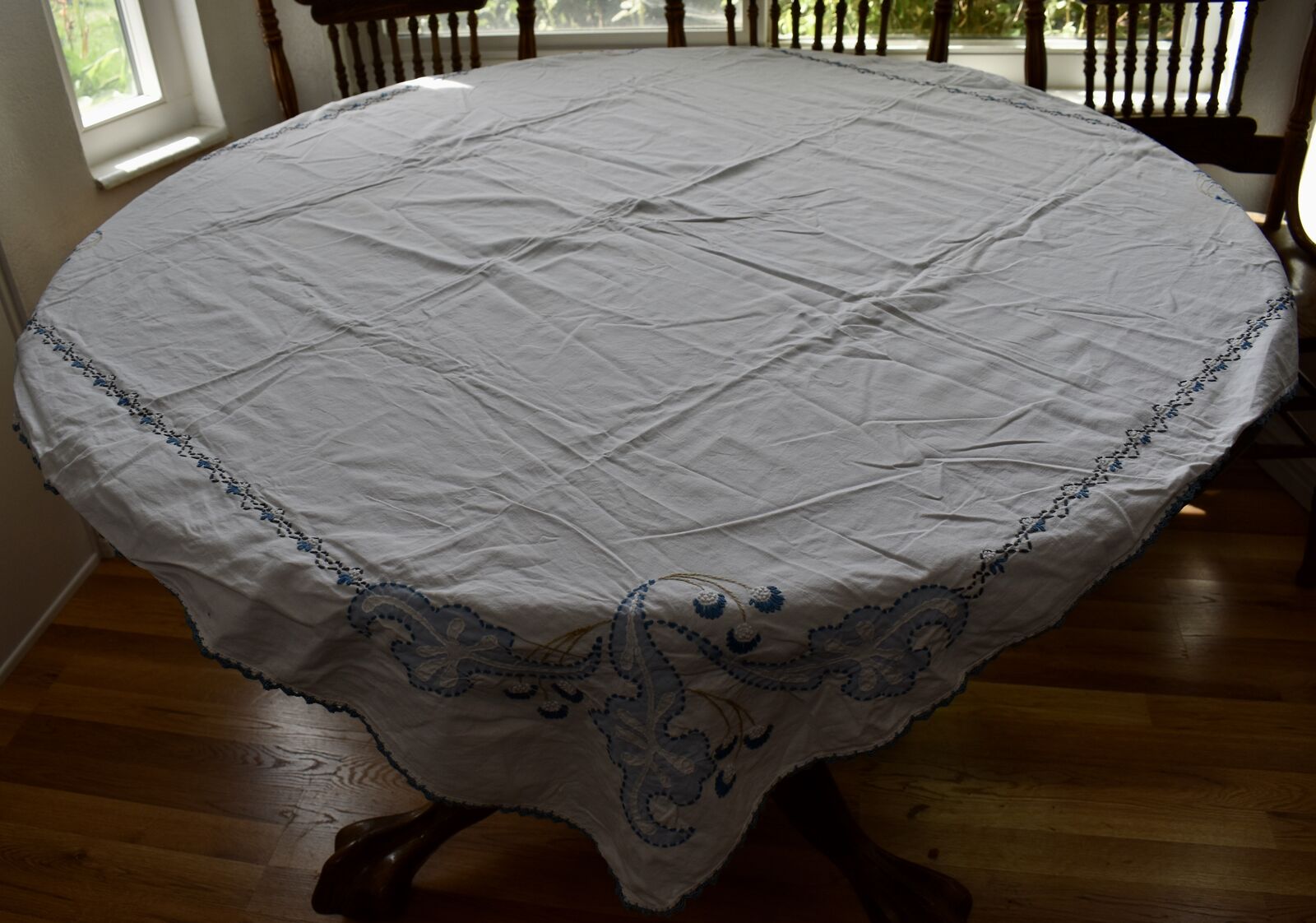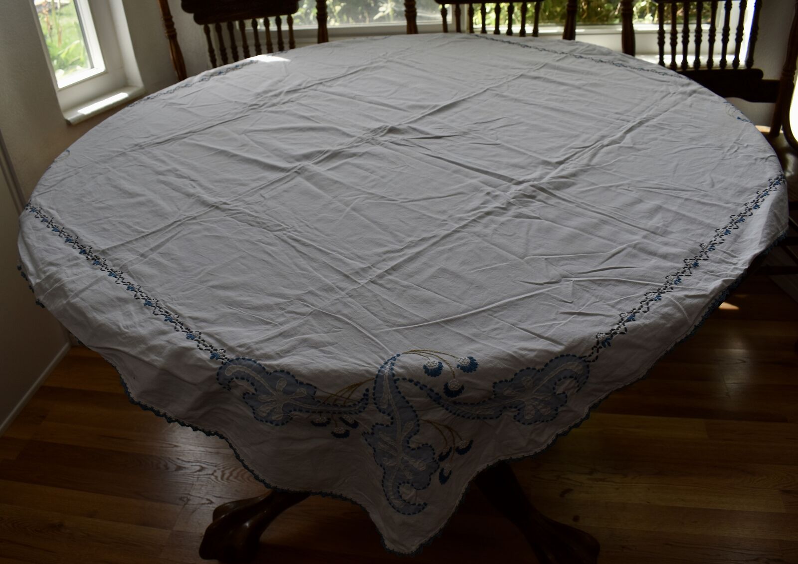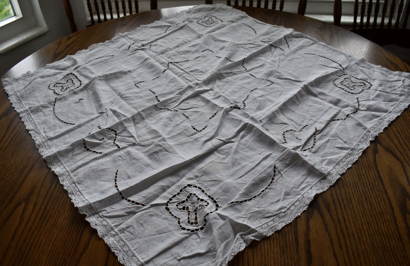 IT MEASURES… The Table that these pretty Table Cloth Linens were displayed on for the photos measures approx.48 inches across - ( That may give you a general idea of the size of each one. )