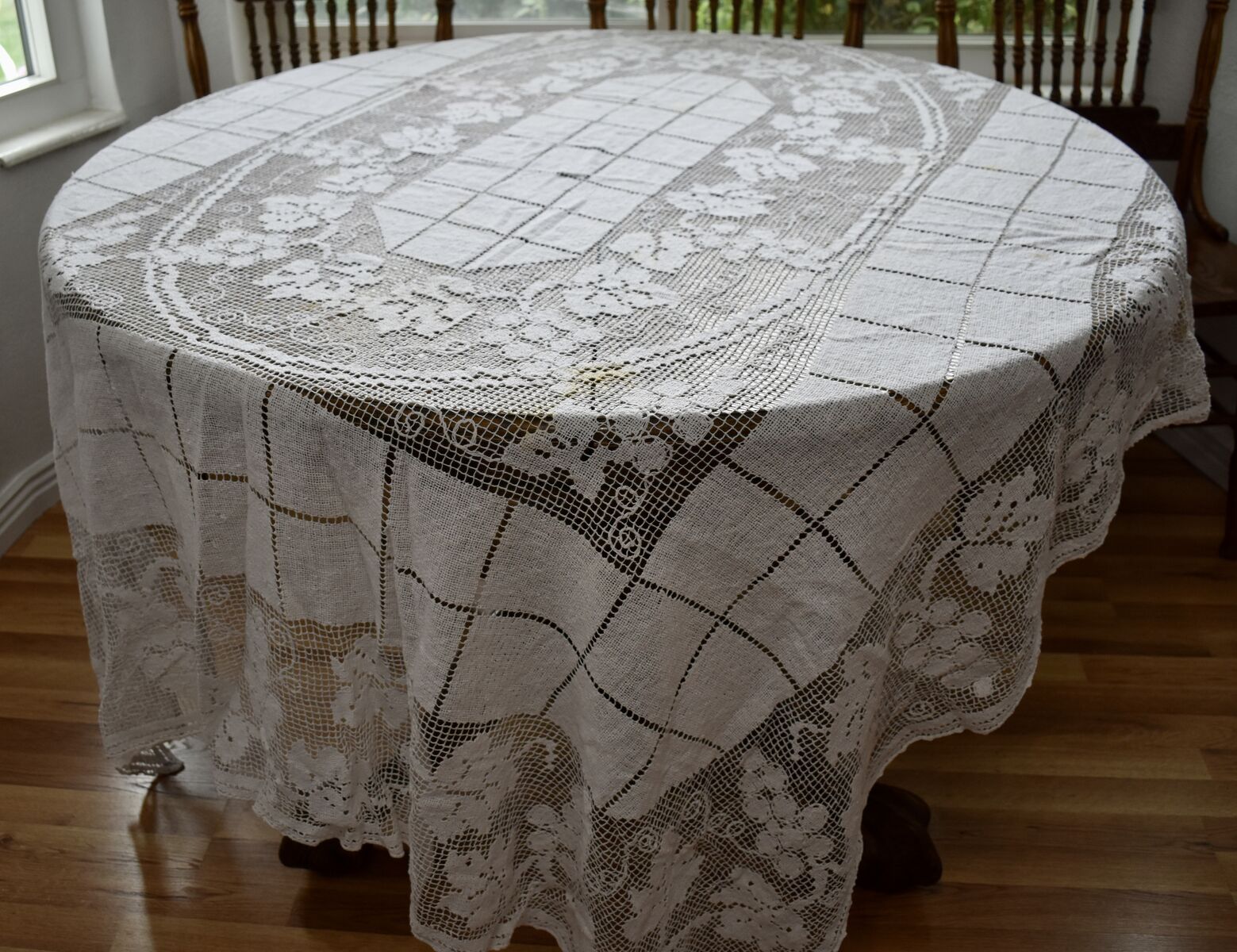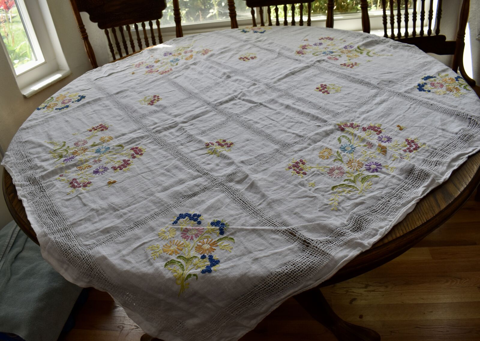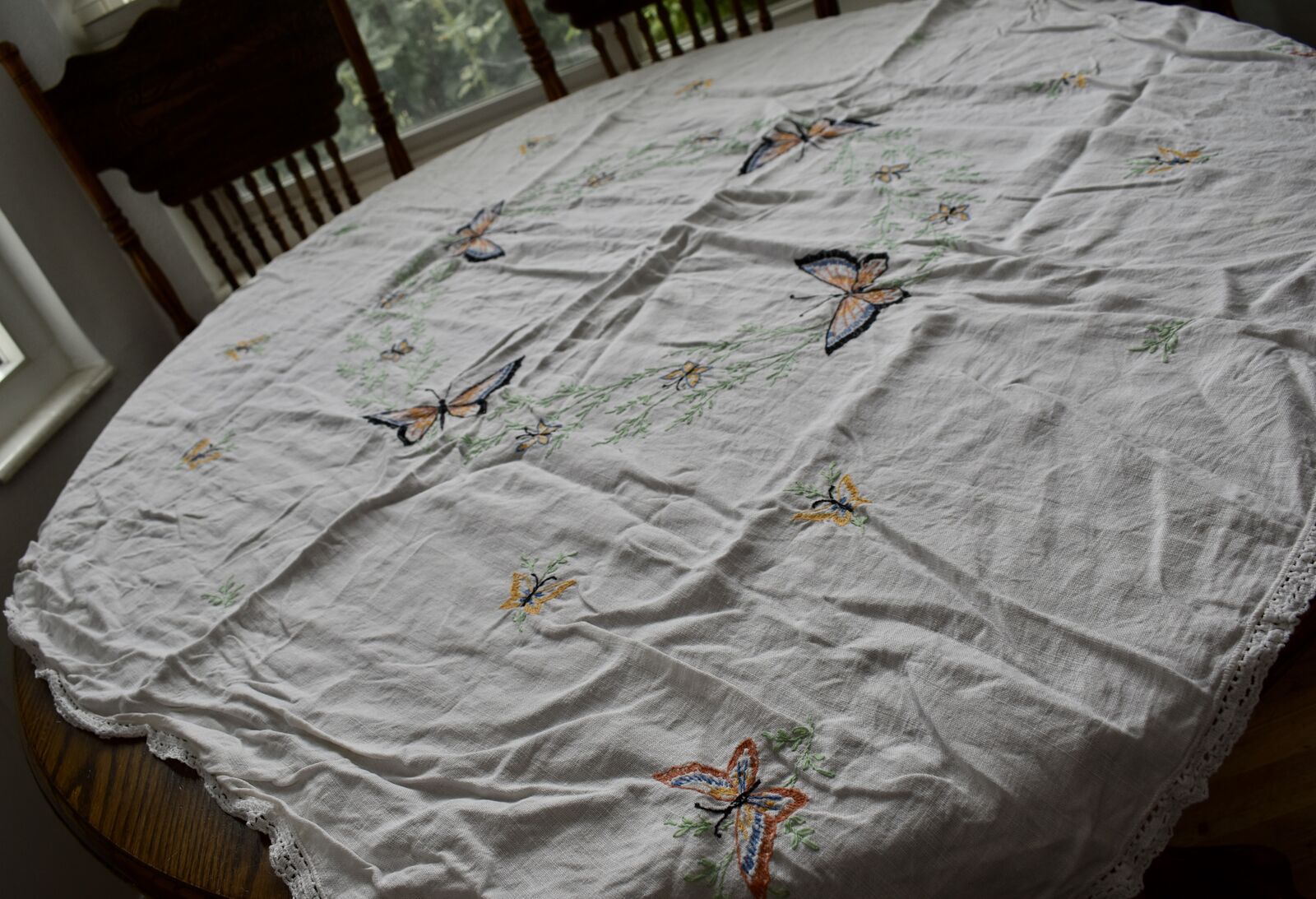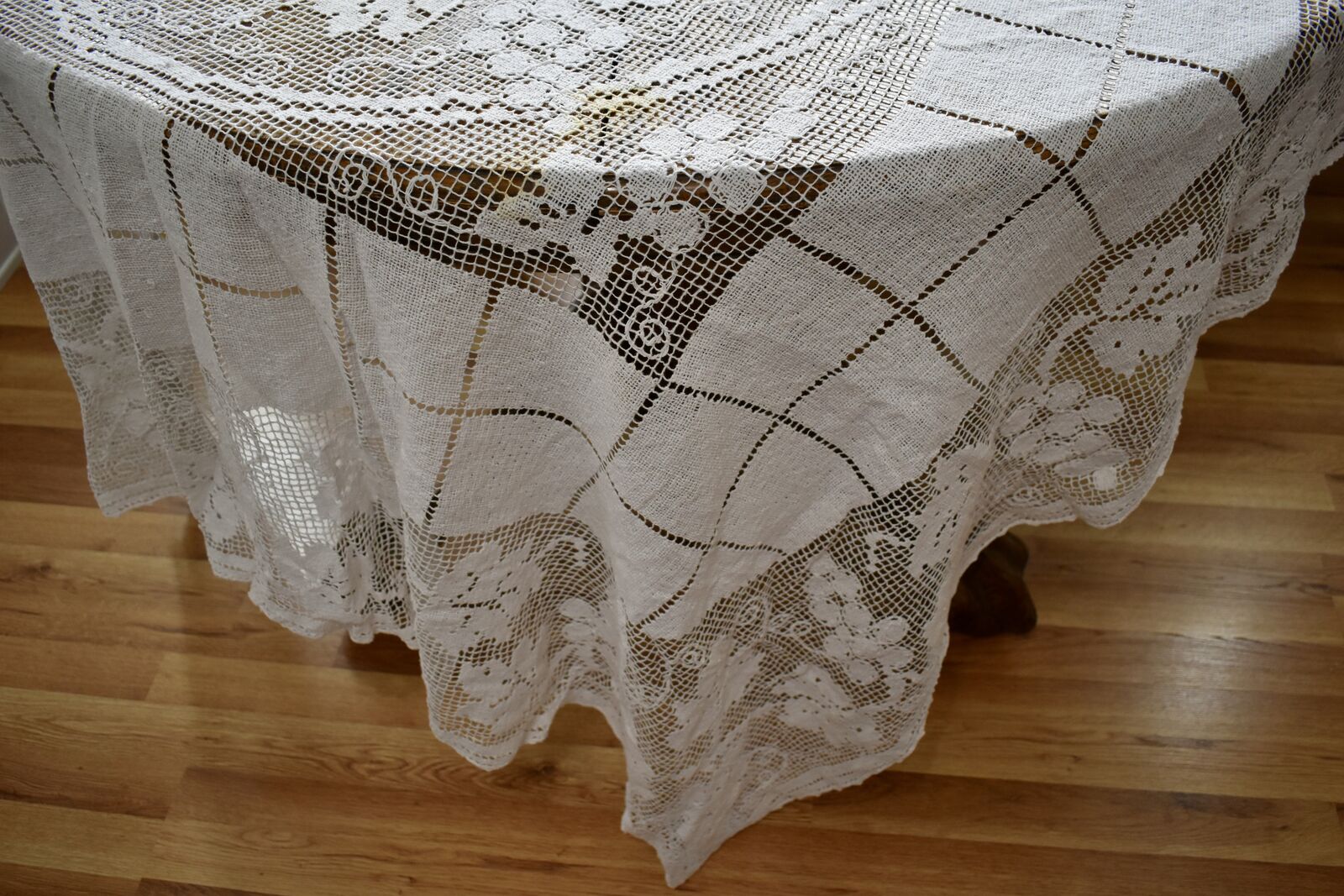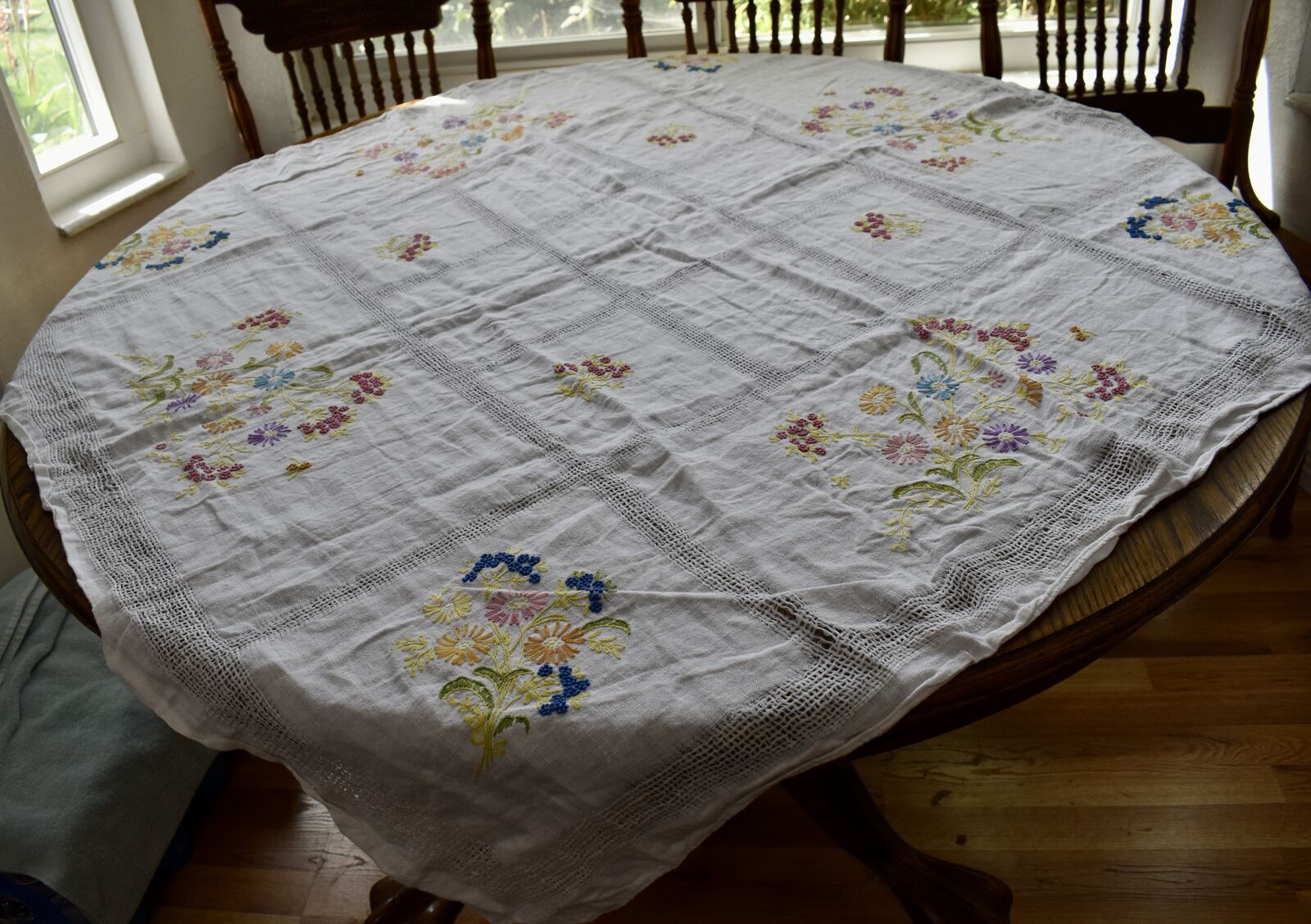 IT MEASURES… The Table that these pretty Table Cloth Linens were displayed on for the photos measures approx.48 inches across - ( That may give you a general idea of the size of each one. )
