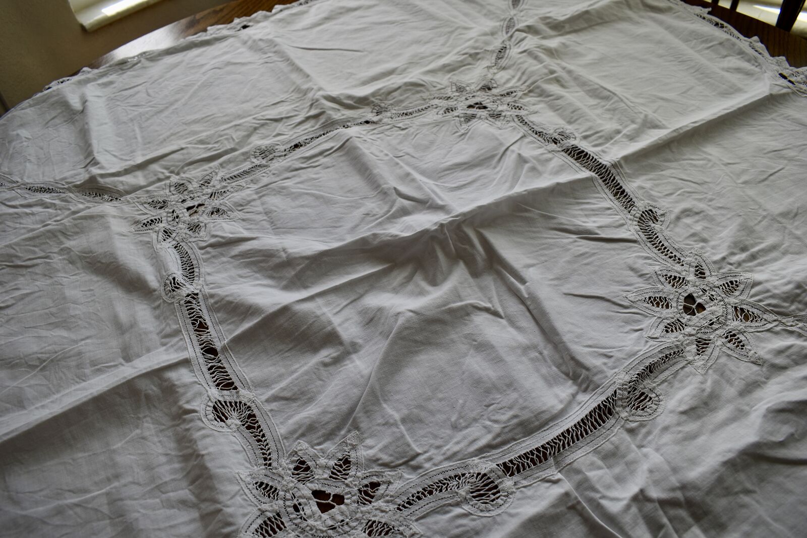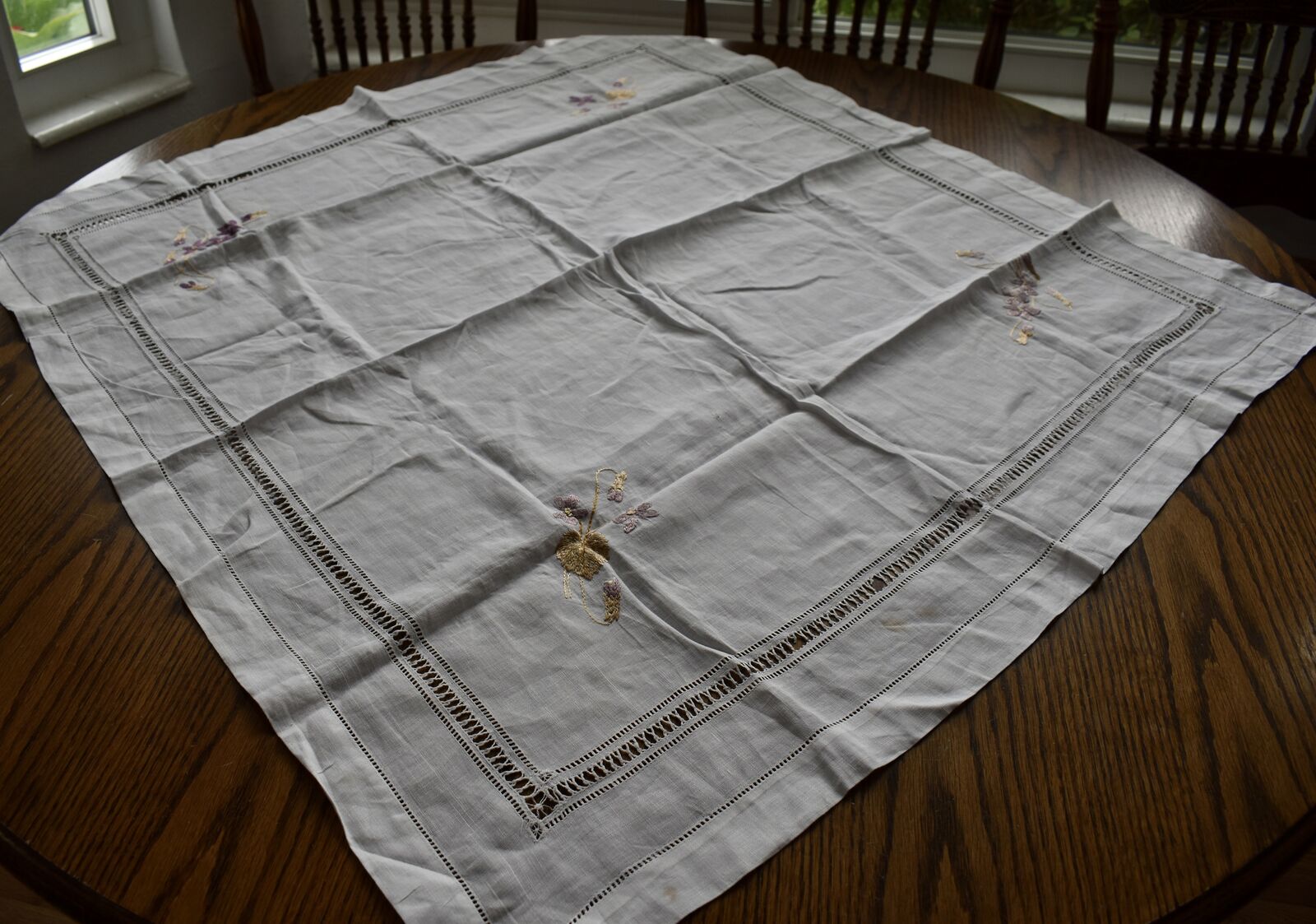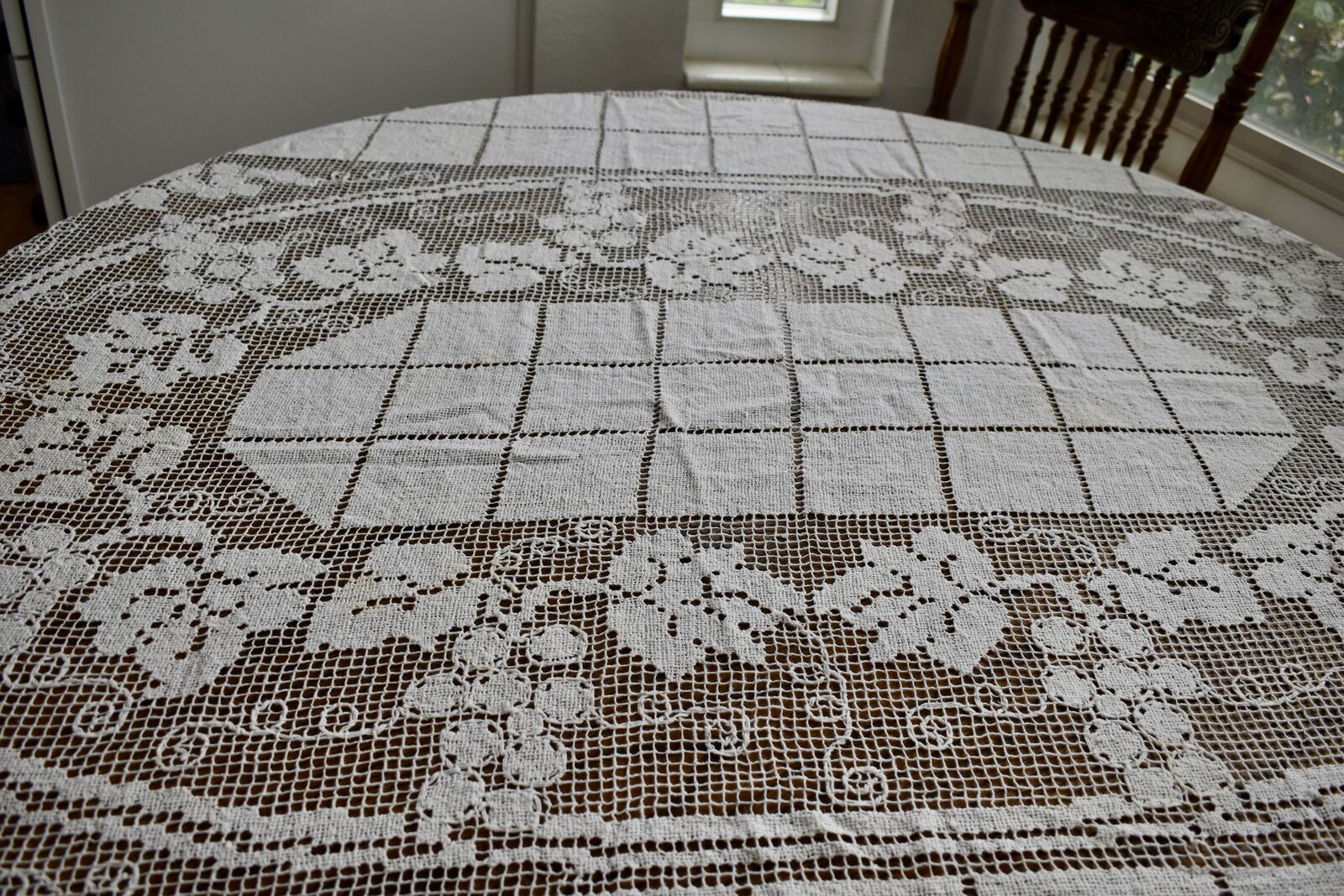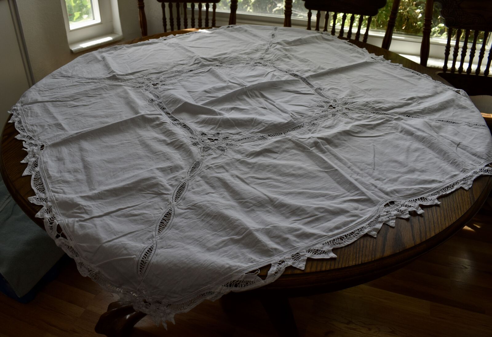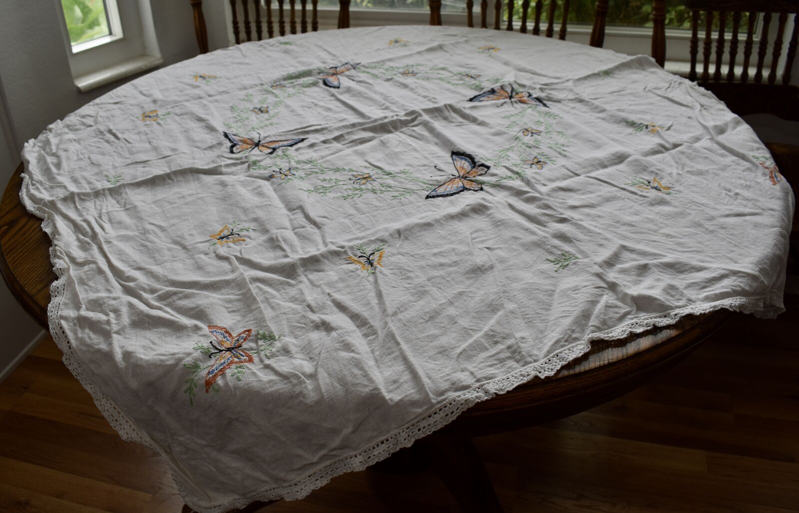 IT MEASURES… The Table that these pretty Table Cloth Linens were displayed on for the photos measures approx.48 inches across - ( That may give you a general idea of the size of each one. )