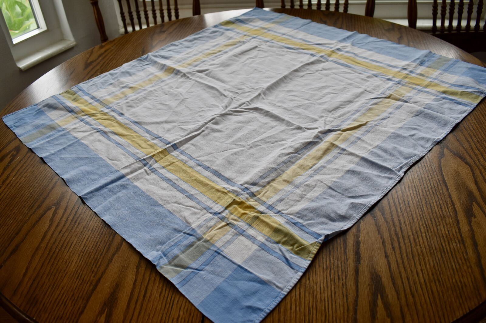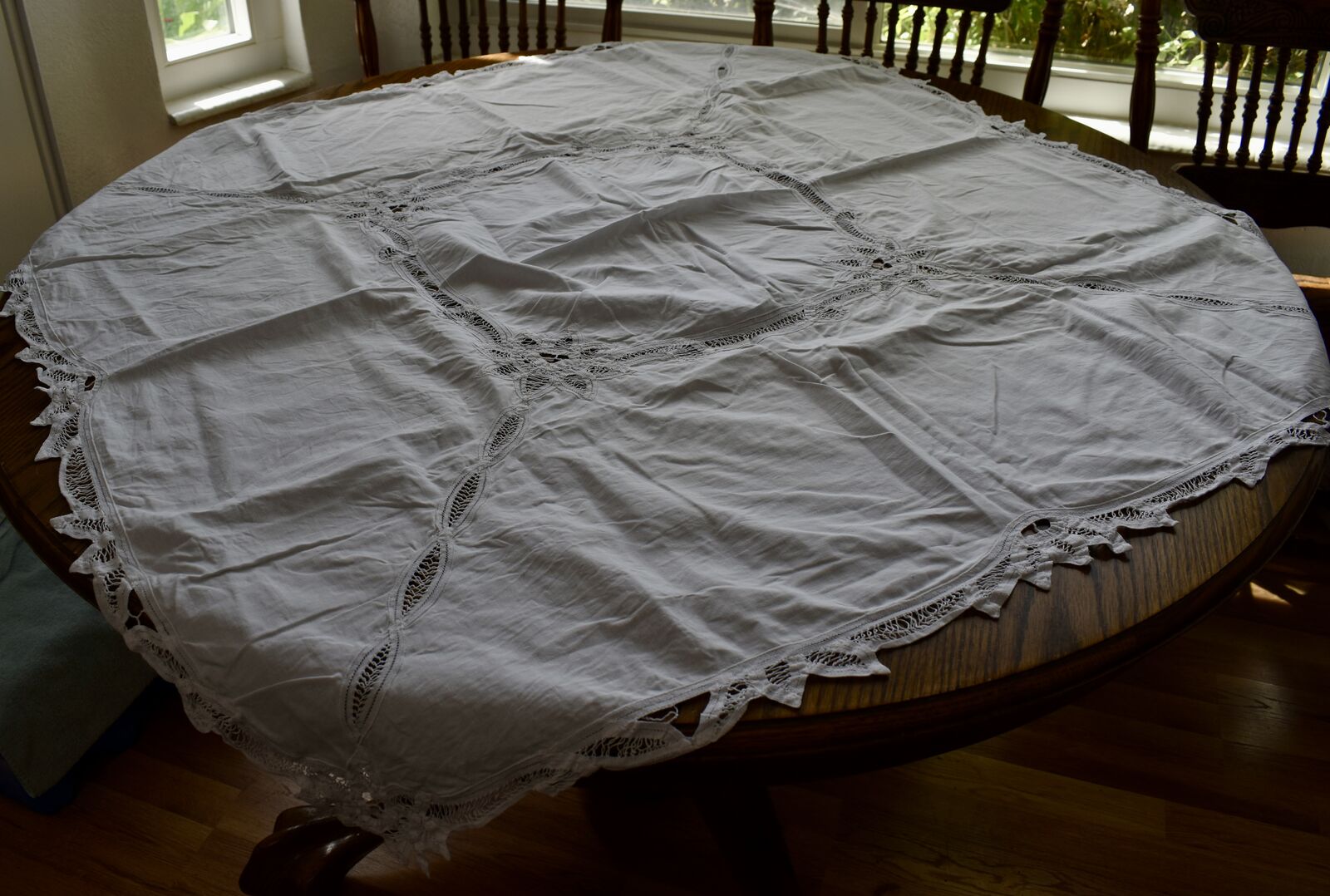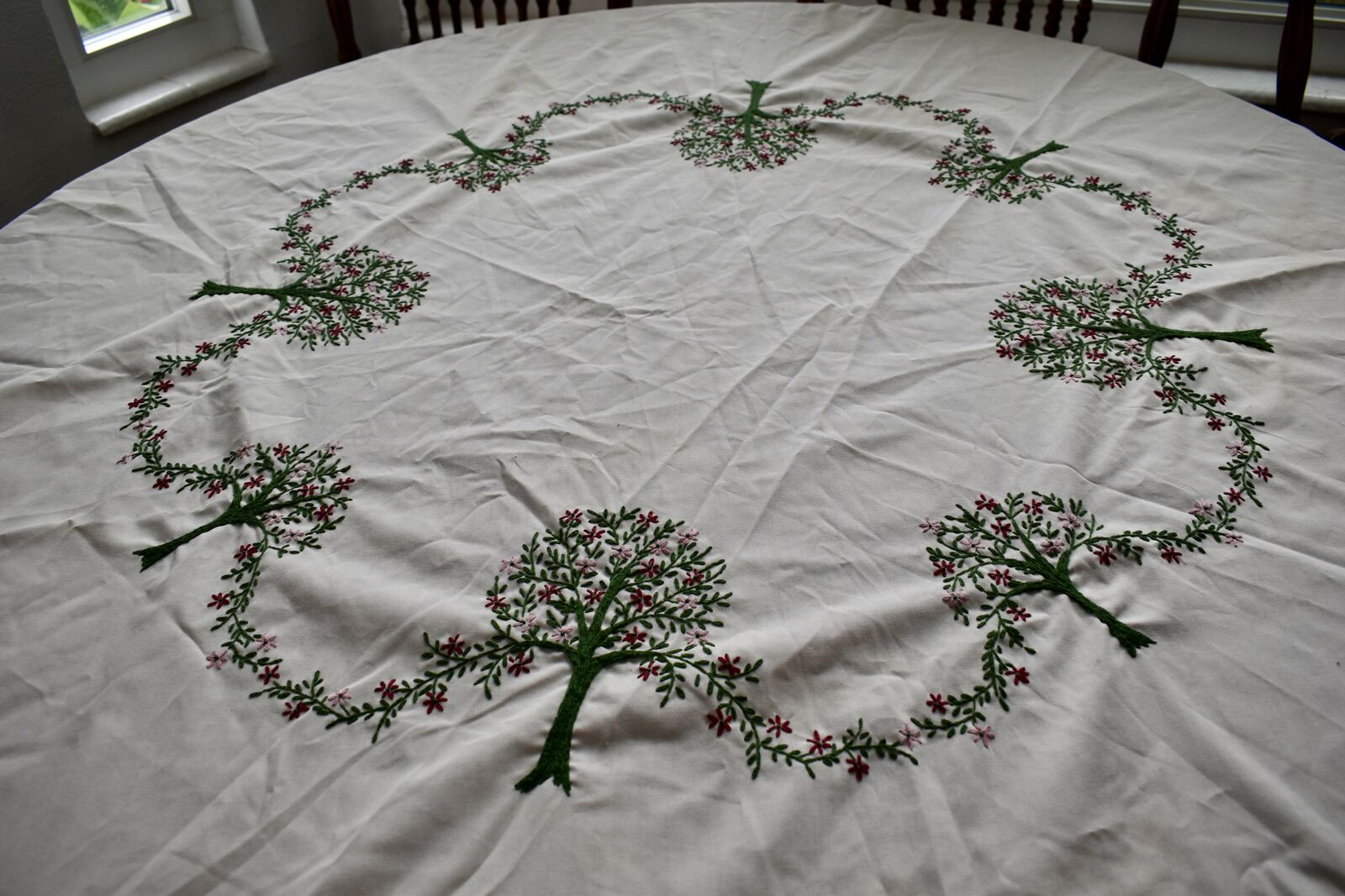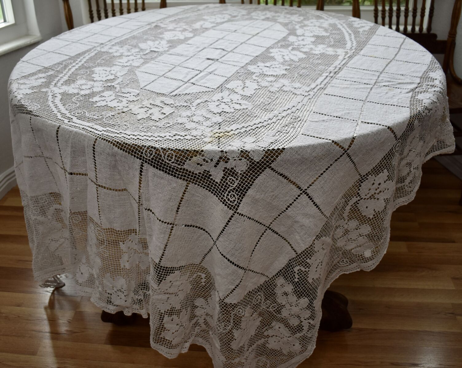 IT MEASURES… The Table that these pretty Table Cloth Linens were displayed on for the photos measures approx.48 inches across - ( That may give you a general idea of the size of each one. )