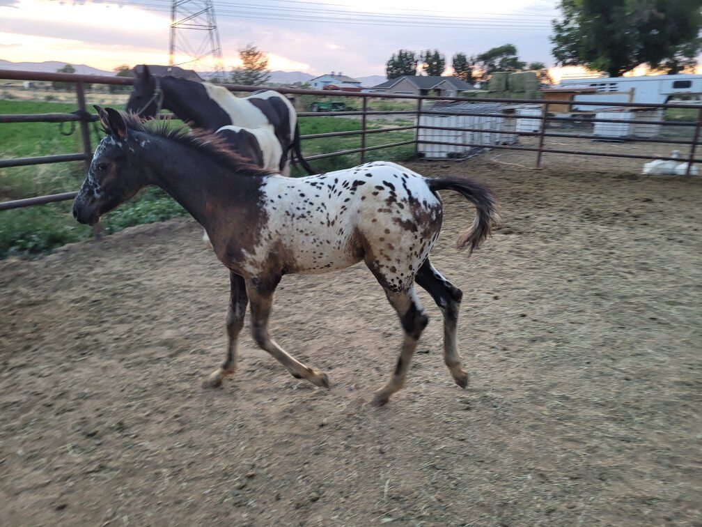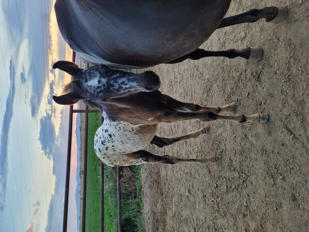 Registered Appaloosa colt. Born May 2025. He is homozygous black and has a beautiful spotted blanket. He is out of an excellent mother who is Egyptian Arabian and passes a gorgeous action and gait to her offspring. She is 15.3hh. The sire is a foundation Appaloosa who is over 15hh as well. This colt has been trailered multiple times. He stands patiently when tied, and he is good with his feet.