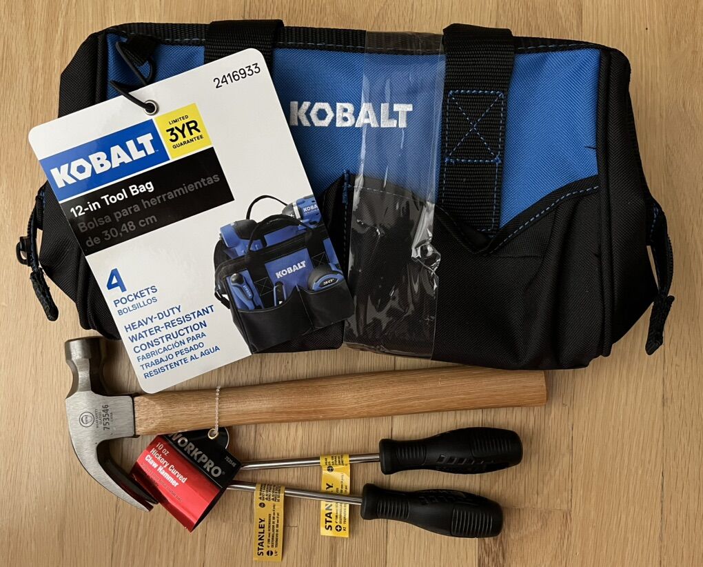 New Kobalt Tool Bag, Hammer, Screwdriver Set, 16” measuring tape, LED headlight.