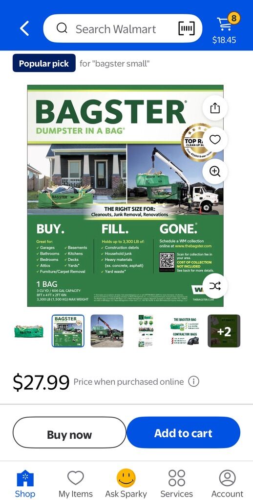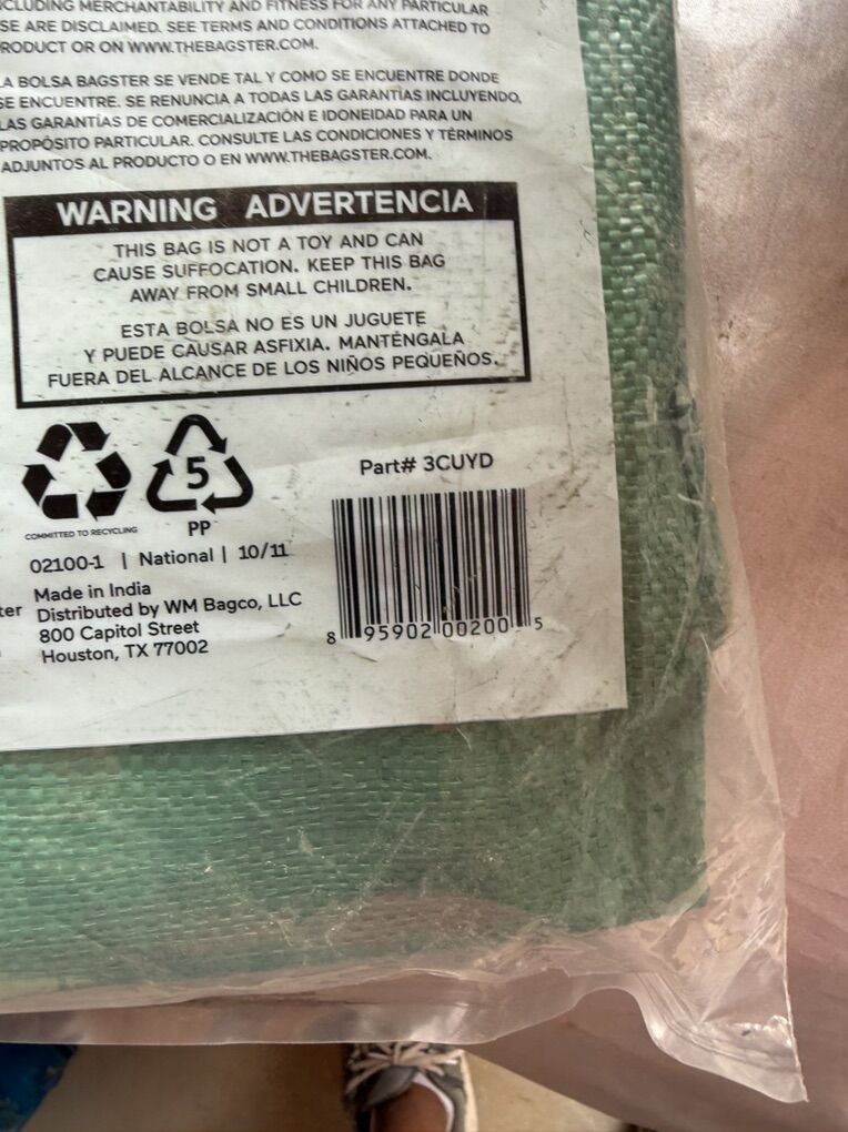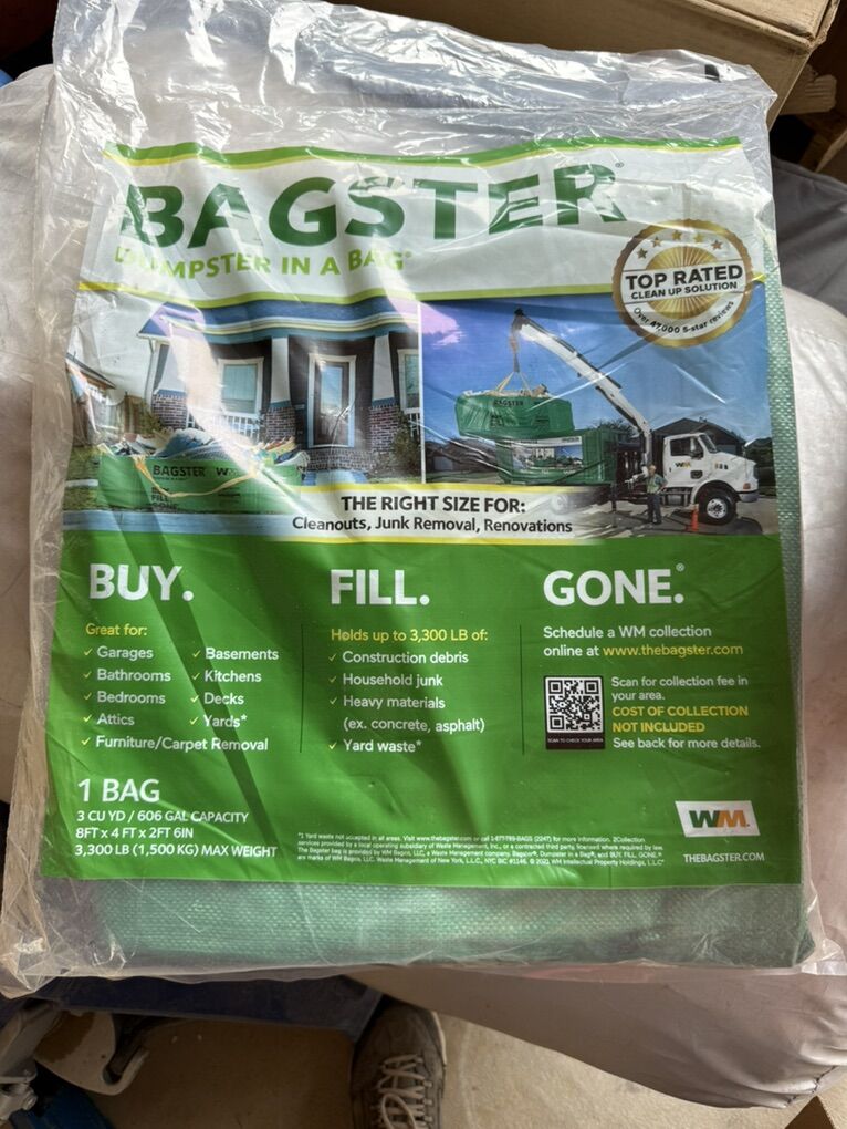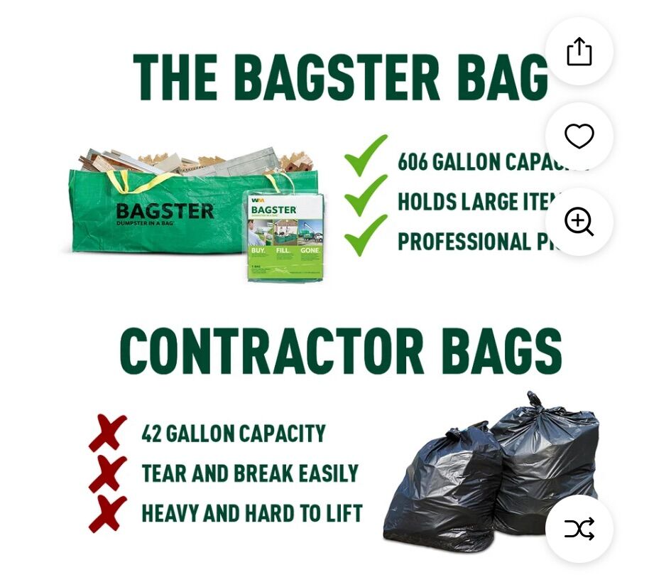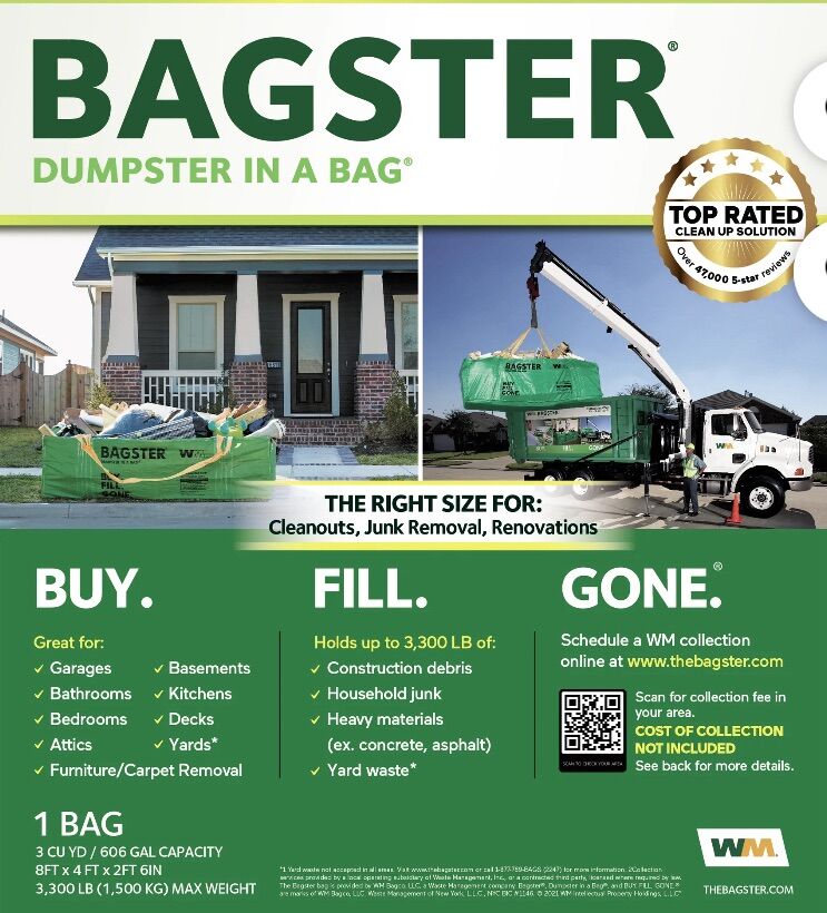The Bagster Dumpster in a Bag is a convenient waste removal solution for home improvement projects and big cleanups. It has a capacity of 606 gallons and can hold up to 3,300 pounds of debris. The bag measures 8' L x 4' W x 2.5' H and does not have a lid, making it easy to fill. It's suitable for various uses, including home renovation, yard waste, and clearing out garages. The bag features handy lifting straps for easy collection by waste management trucks. It's also a good option for disposing of scrap materials left behind after new construction, such as wood, concrete, or brick.