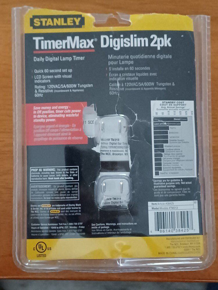 Stanley Timermax Digislim 2 pack. Turns lamps, appliances and other electrical devices ON/OFF Automatically. Only used once. New batteries just installed. FCFS Cash accepted.