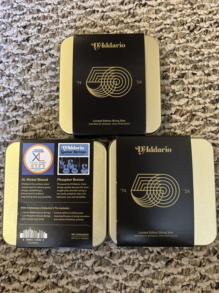 PayPalI have a ton of various sets of electric, acoustic and bass strings. All are brand new and still in the packaging. It will take too long to list all of them, but I have strings from D’addario, Dunlop, Ernie Ball (no Slinky’s), Martin, Elixir, etc. I also have a few coated options. It is best to message me and let me know what you are looking for and I’ll get you a price. However some of the specific sets are listed below- D’Addario Limited Edition 50th Anniversary string sets- Includes 1 set XL 10-46 strings, 1 set Phosher Bronze light gauge acoustic strings, 50th Anniversary picks, poster and tin.