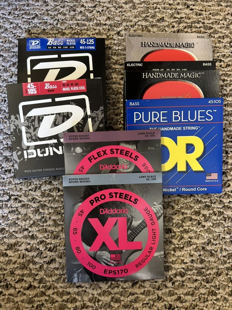 Various DR, D’Addario and Dunlop bass string sets. Most are 45-105. I also have 45-100 and a 5 string set 45-125.