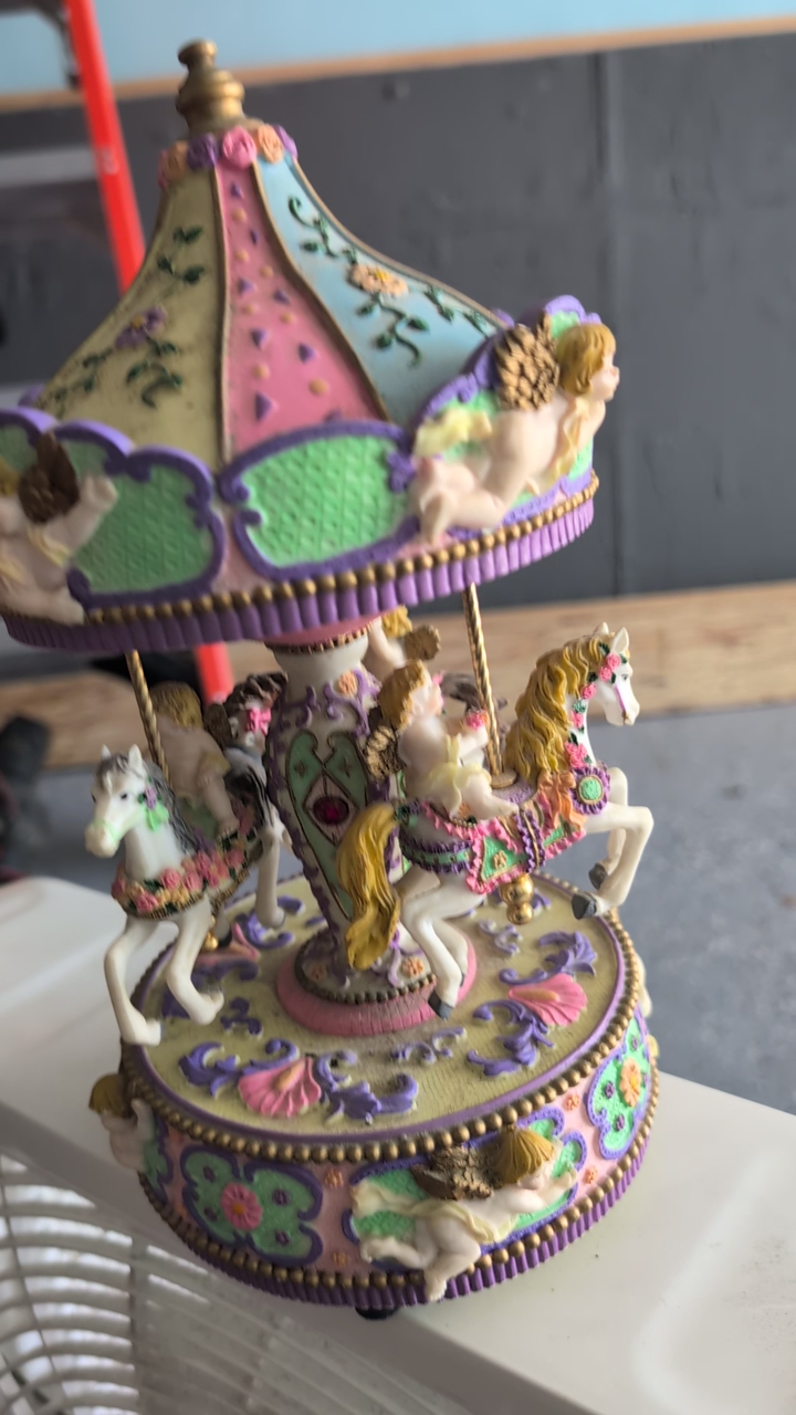 Carousel Rotating Tent Top Attached Horses & Cherubs Fixed Base. Plays music.