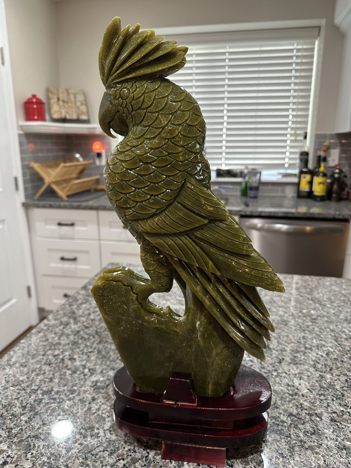 ZelleFor sale is a beautiful carved green jade crystal cockatoo with stand. It measures 16 1/4" tall withoput the stand and is 19" tall with the stand. It weighs just over 11 lbs.