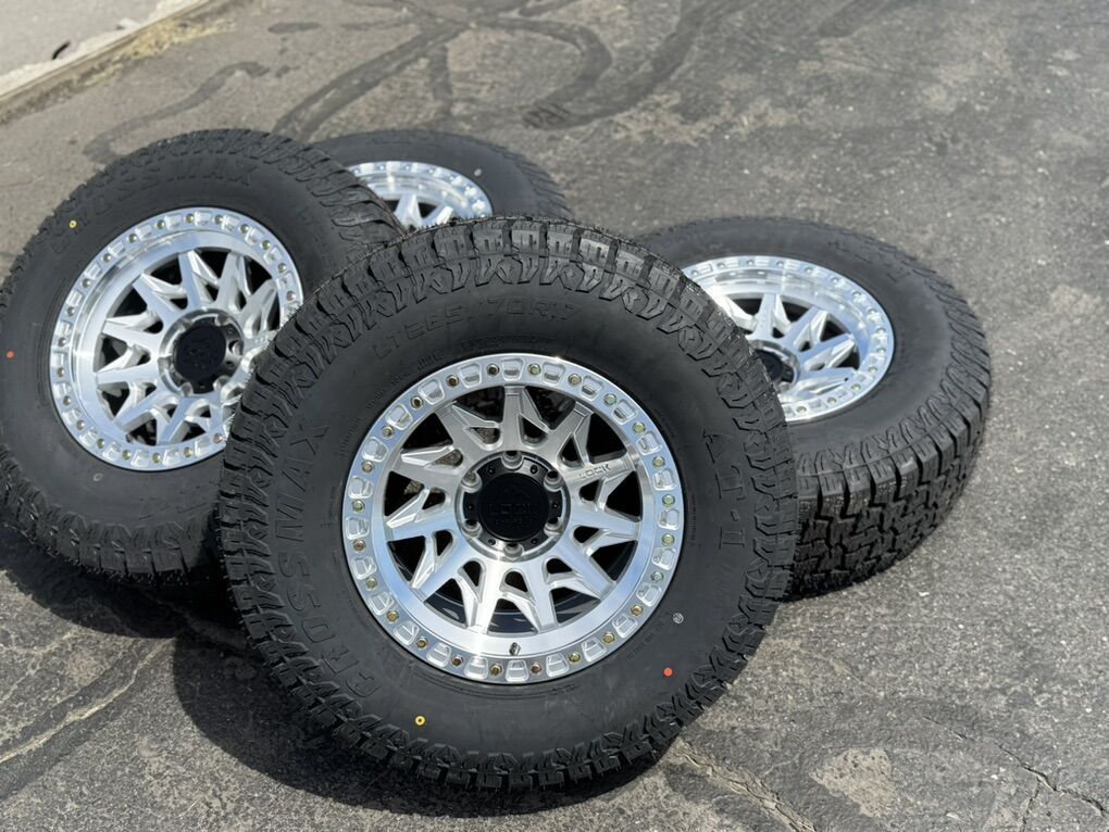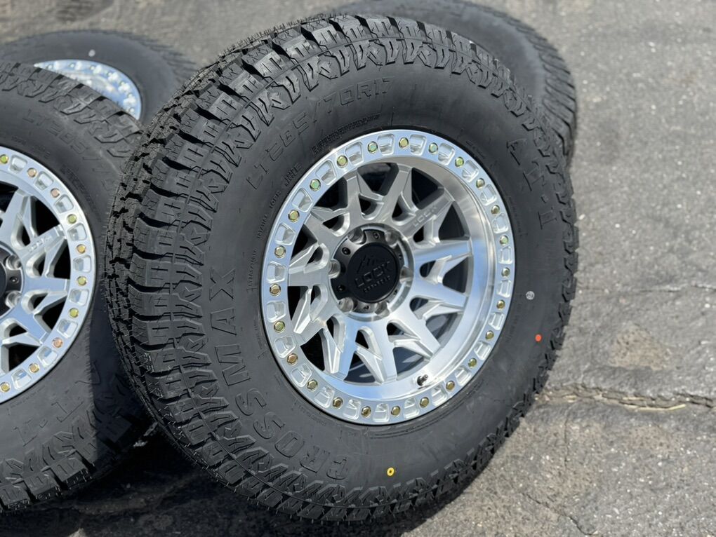 17x9 -12et offset Lock Off-Road Lunatic Silver finish! Must see in person they look amazing! Mounted and balanced on New LT285/70r17 Crossmax AT tires. 6x5.5 bolt pattern (6x139.7). These fit Chevrolet Silverado 1500 GMC Sierra yukon tahoe Nissan Titan and Toyota Tacoma. Should work on newer Ford Ranger as well. Call or txt 435-760-1194