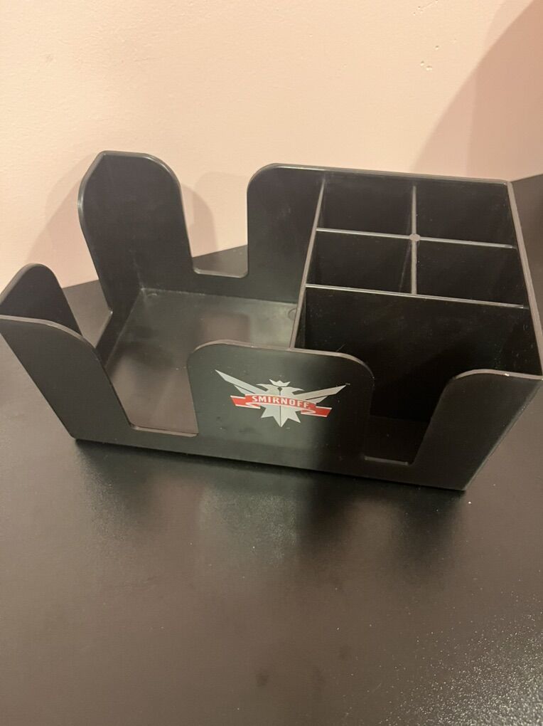 VenmoSmirnoff napkin/coaster/straw holder bar caddy. It is black with red/white/gray logo. Have two of these and each one is 25.00 dollars.