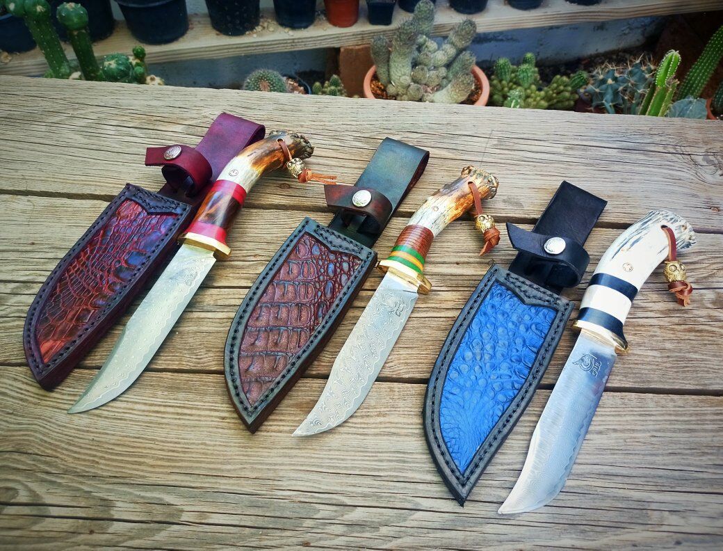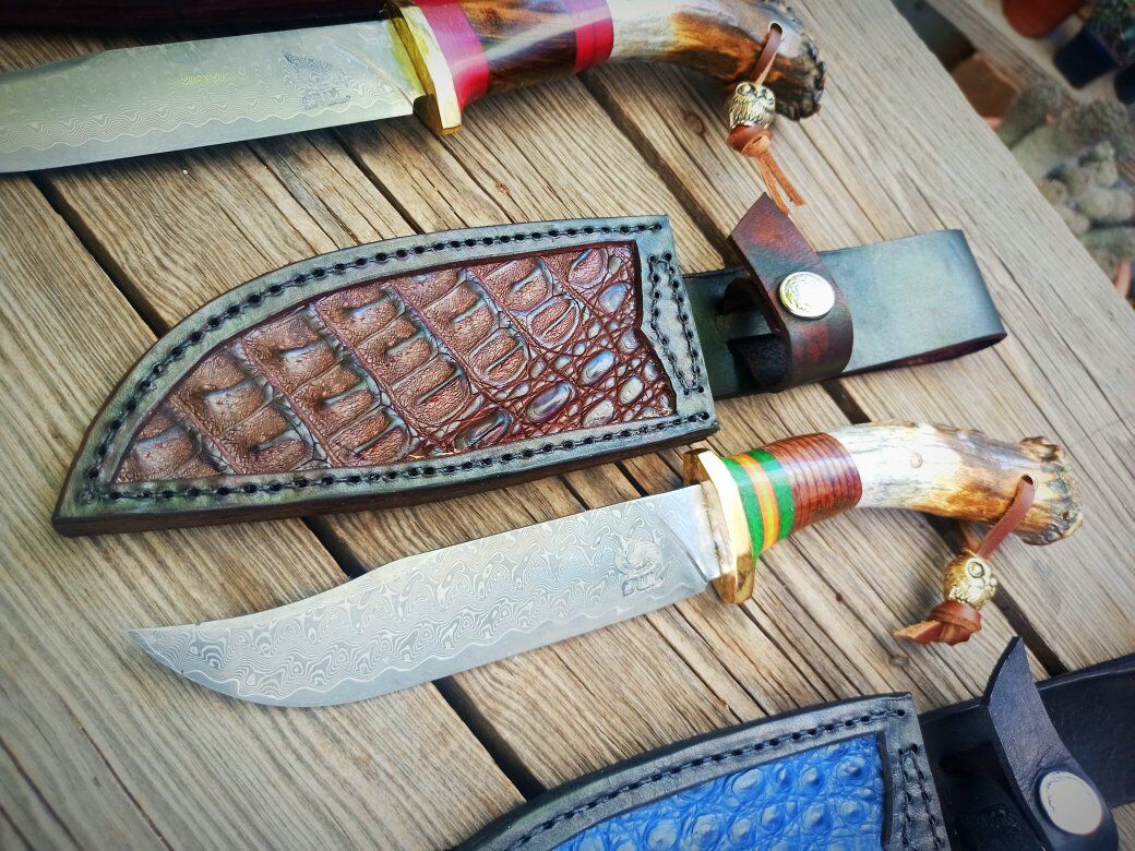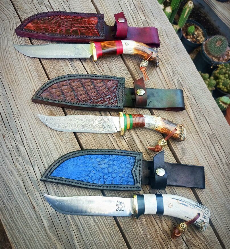 CashAppCheck these beauties out. SanMai VG10 Damascus Steel blades. I have these three available. Handmade. Handles are a combo of Micarta, Ironwood, stag. leather sheath is cowhide and Cayman.